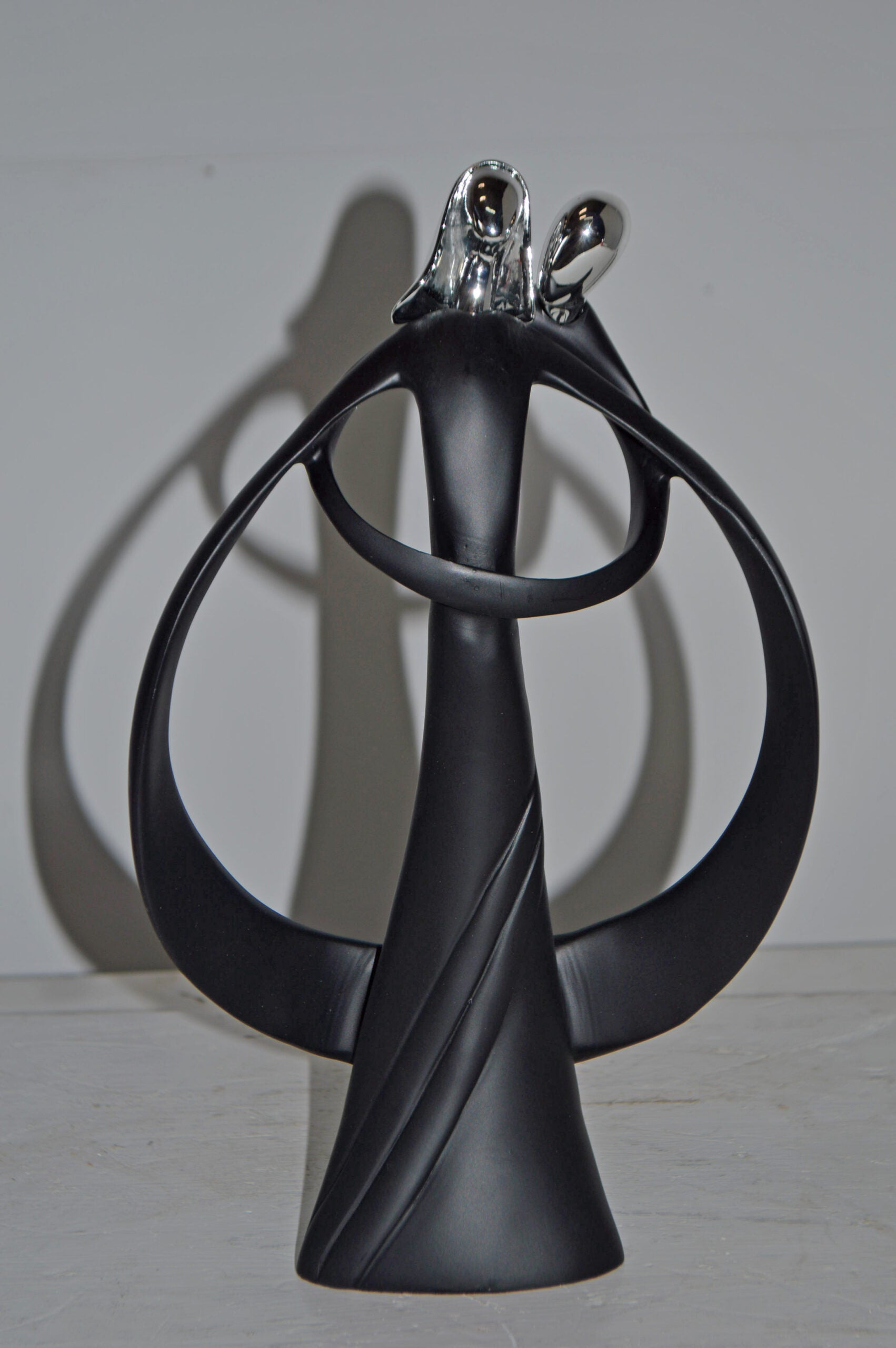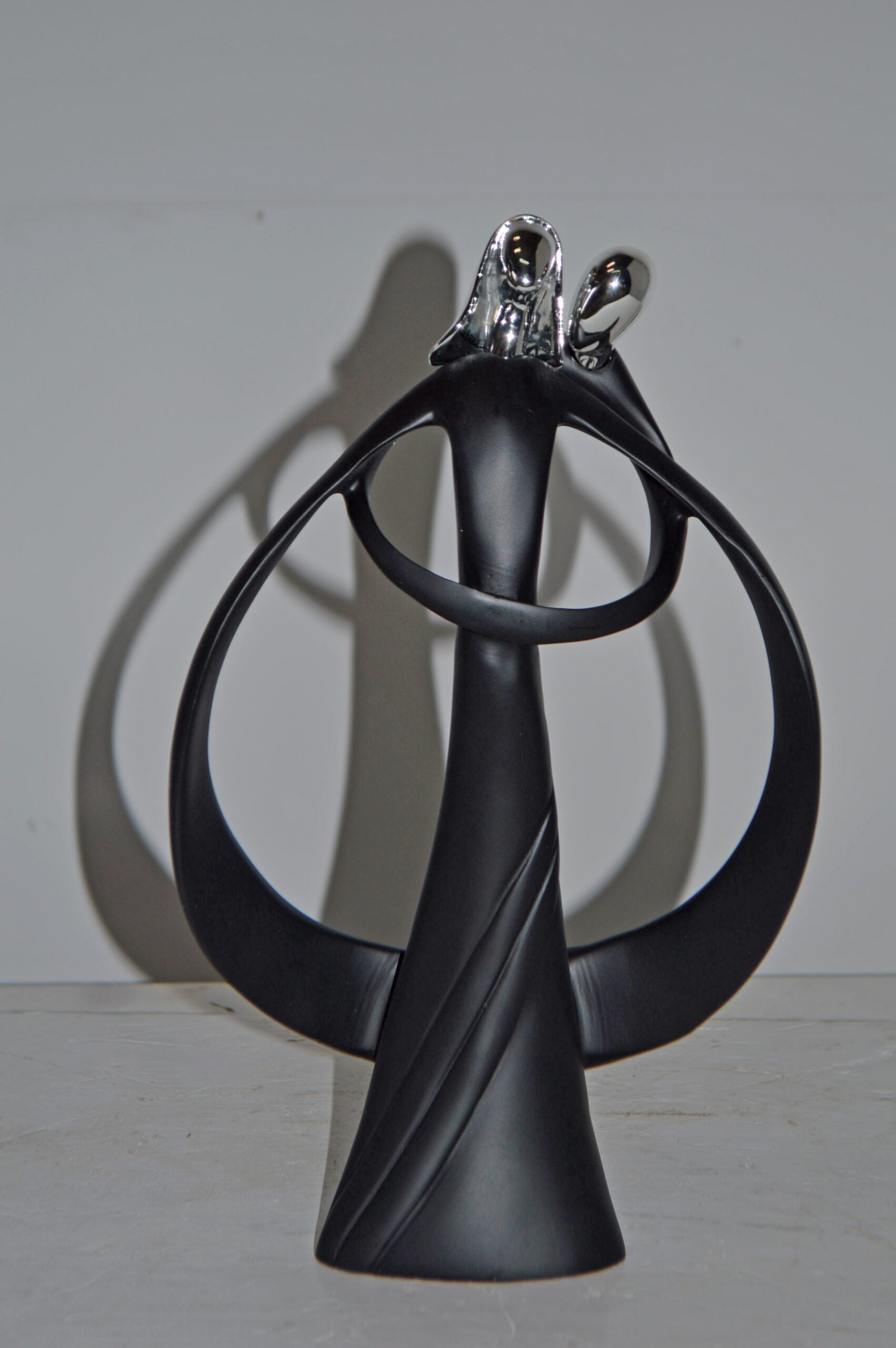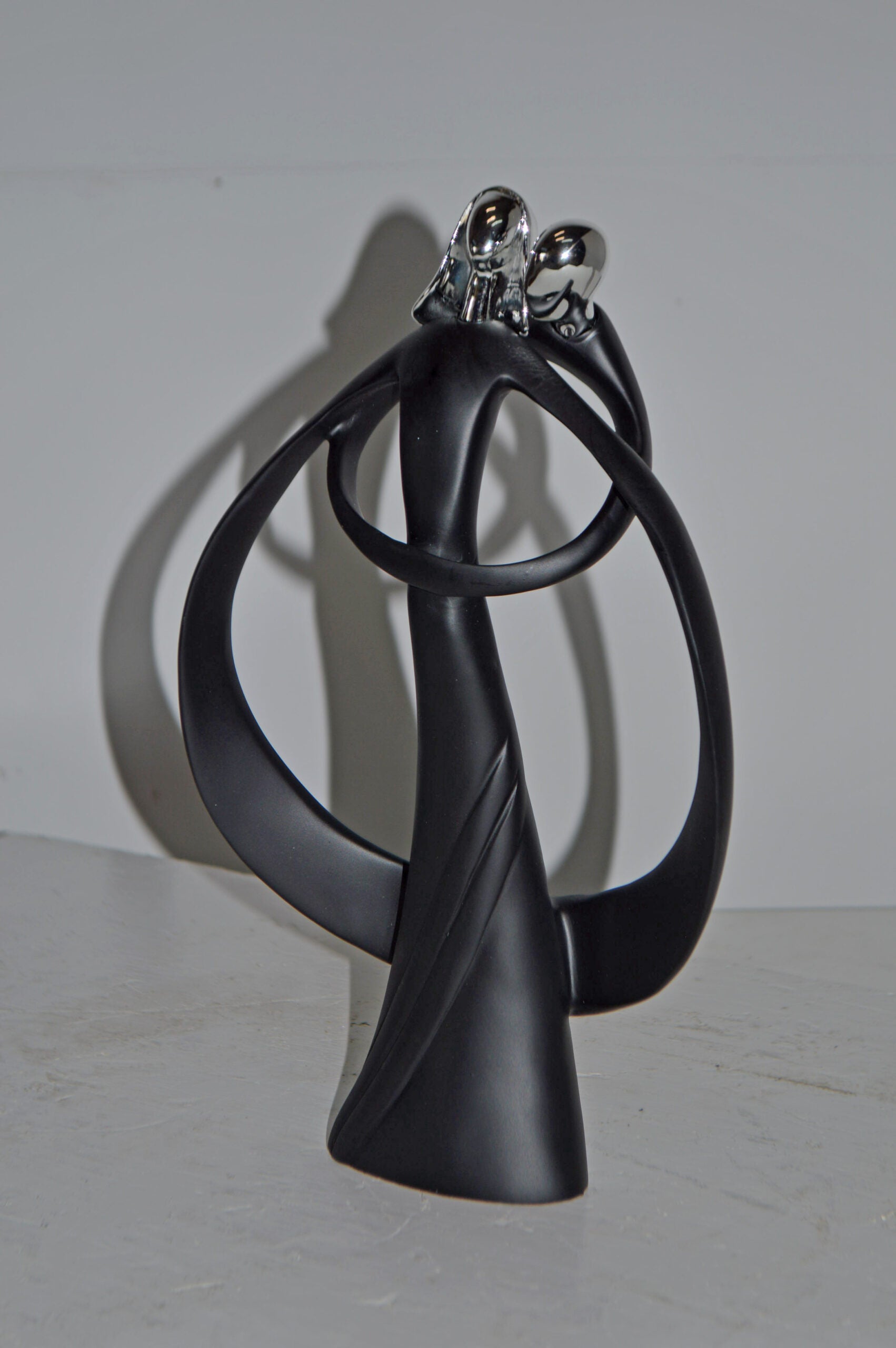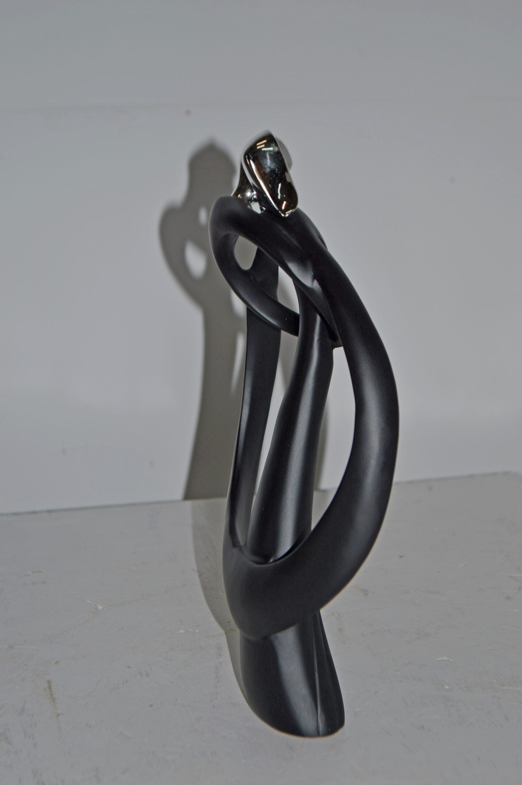 The beautiful modern art resin statue of a young couple hugging, colored black with shiny chrome heads. This impressive resin Statue will be a permanent fixture at your home for years to come. This statue comes in color red and black – customer often buy both as a set Size: 8"L x 2"W x 12"H. Weight is: 2Lb