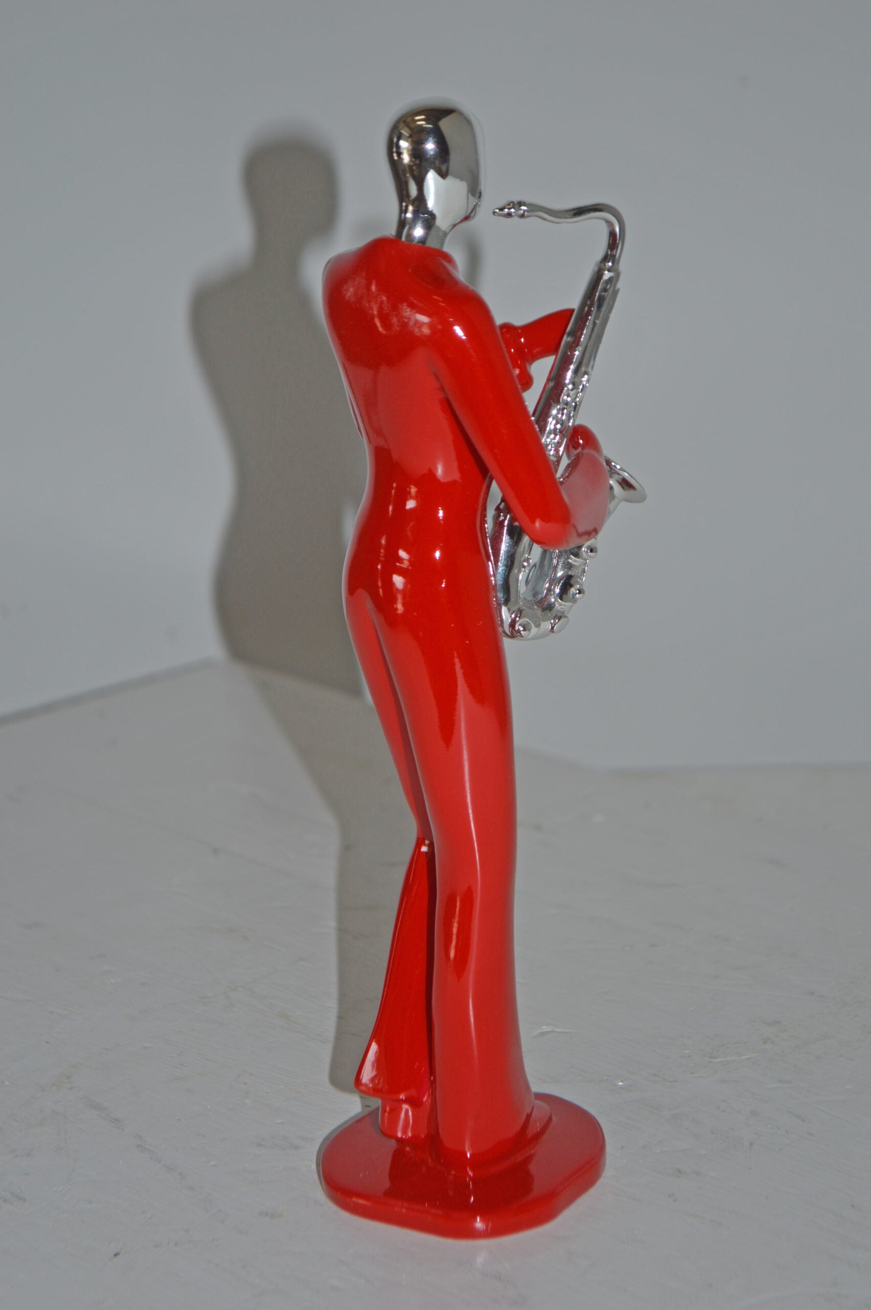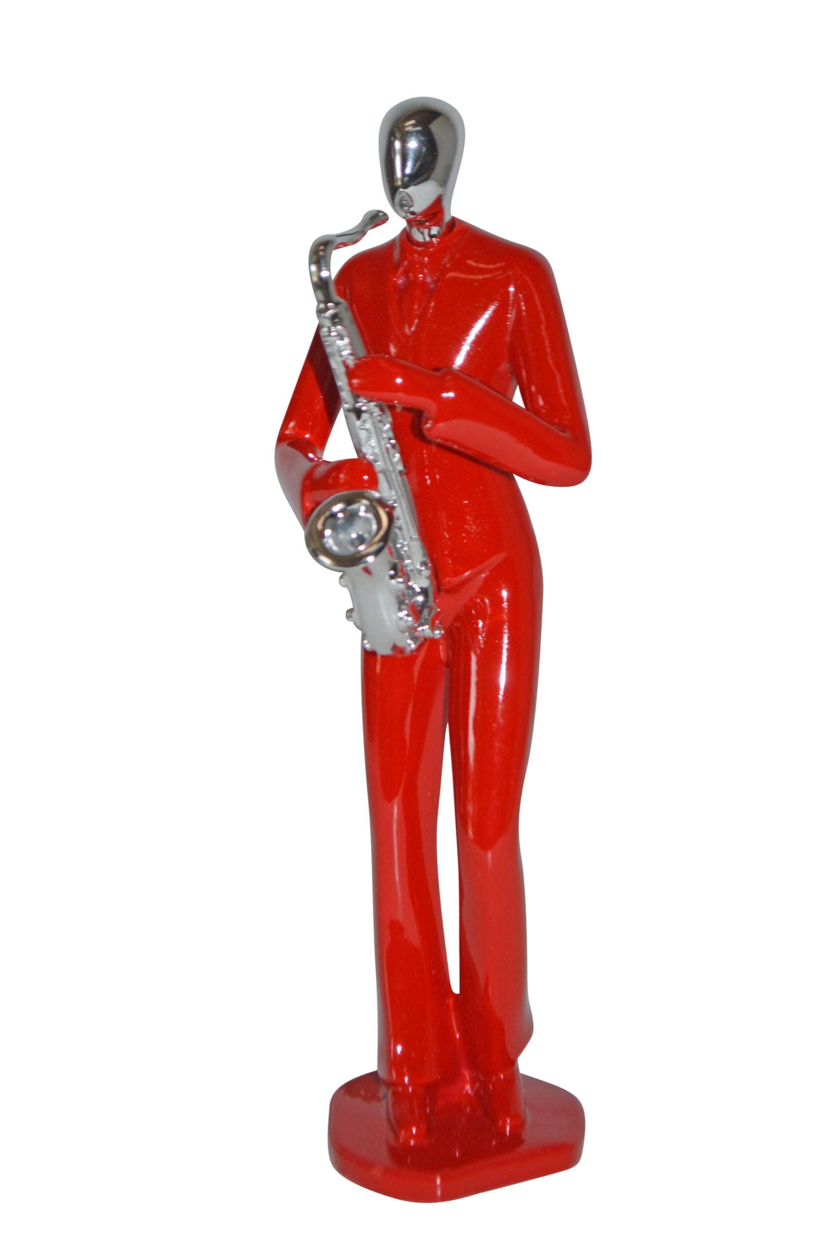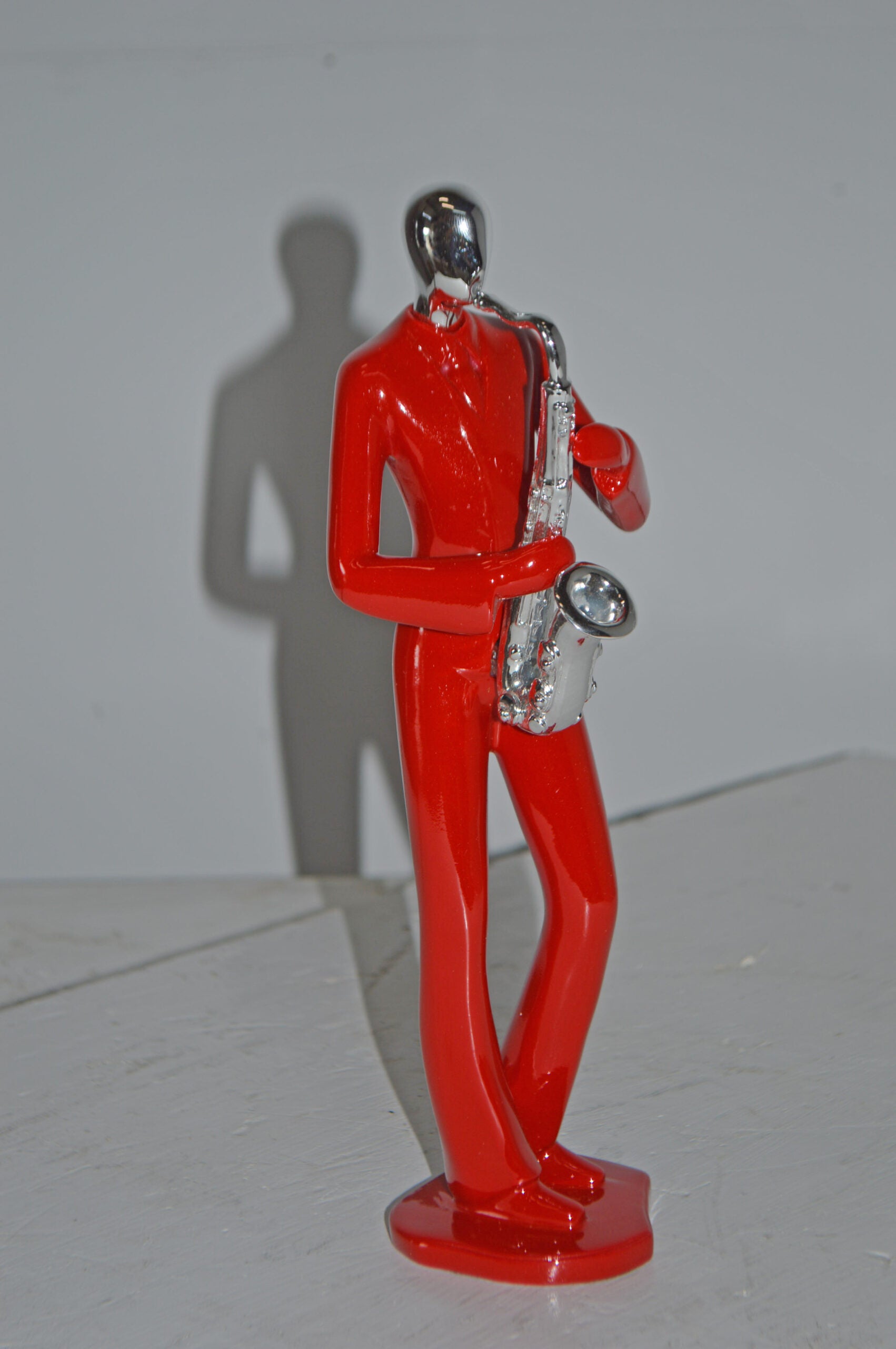 The beautiful modern art resin statue colored red with shiny chrome head of a Musical young man Playing the saxophone is a fantastical depiction of a young adult casually enjoying the sound of music. This impressive resin Statue will be a permanent fixture at your home for years to come. This statue comes in color red and black – customer often buy both as a set Size: 4"L x 3"W x 11"H. Weight is: 1Lb