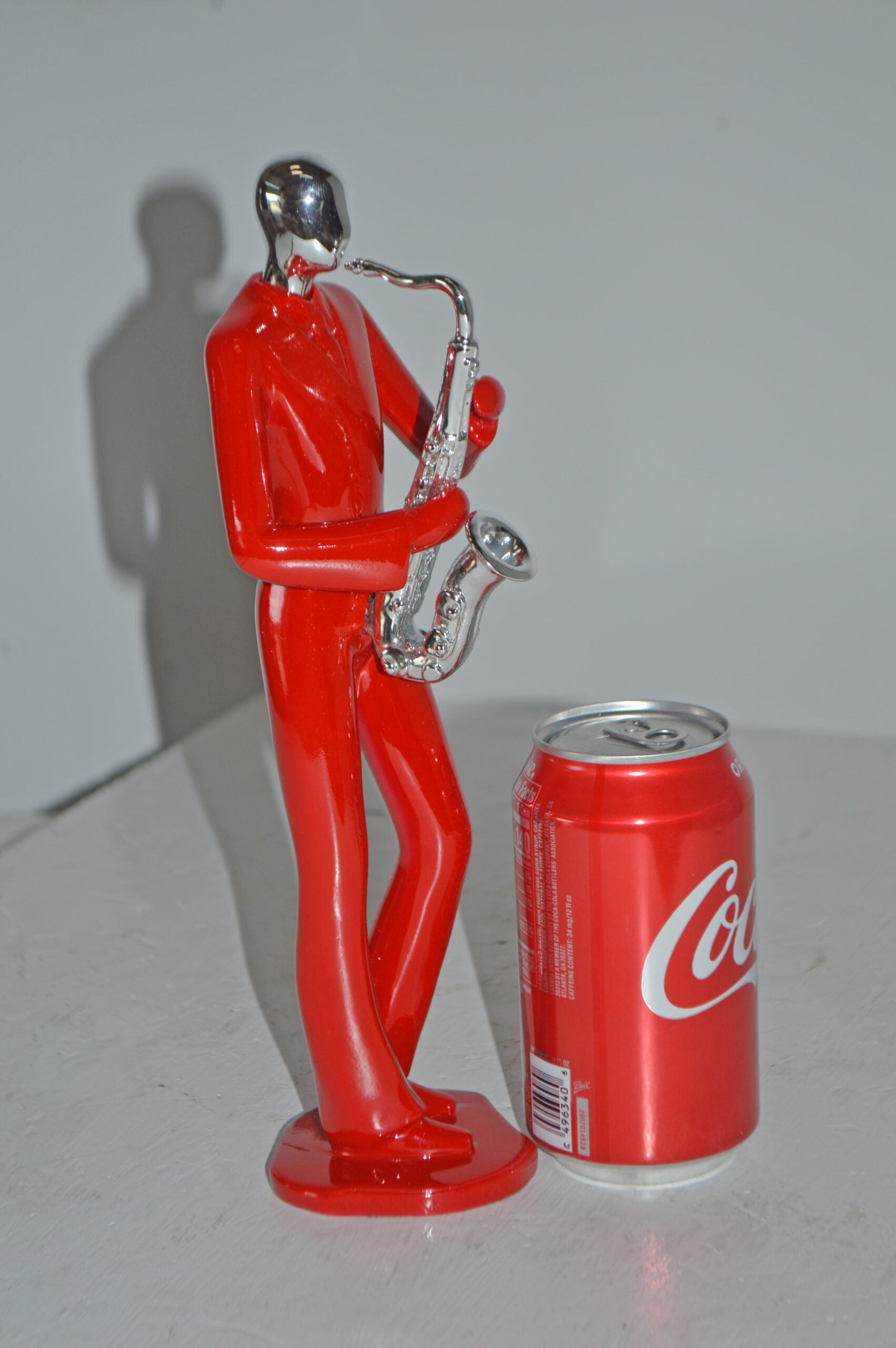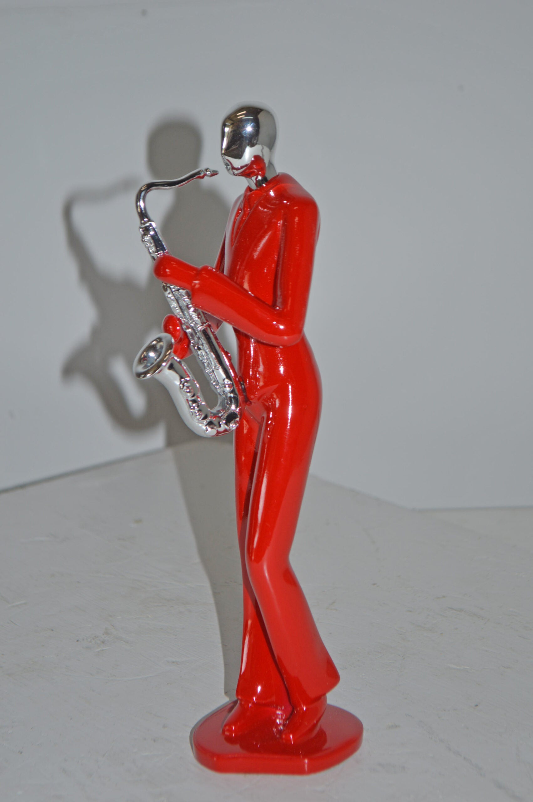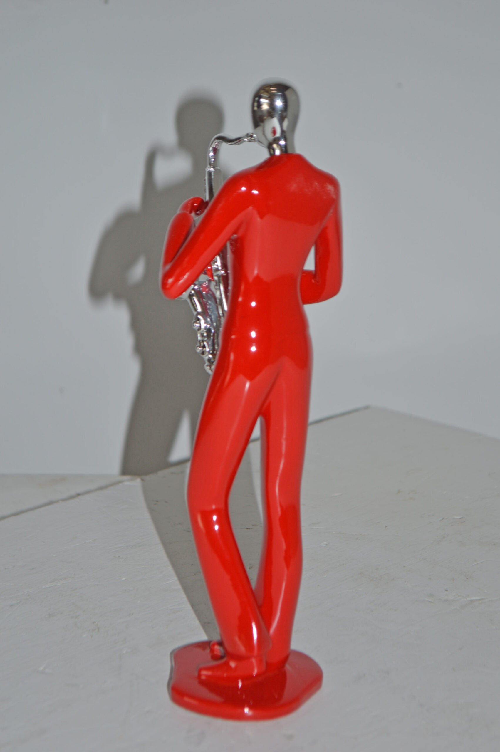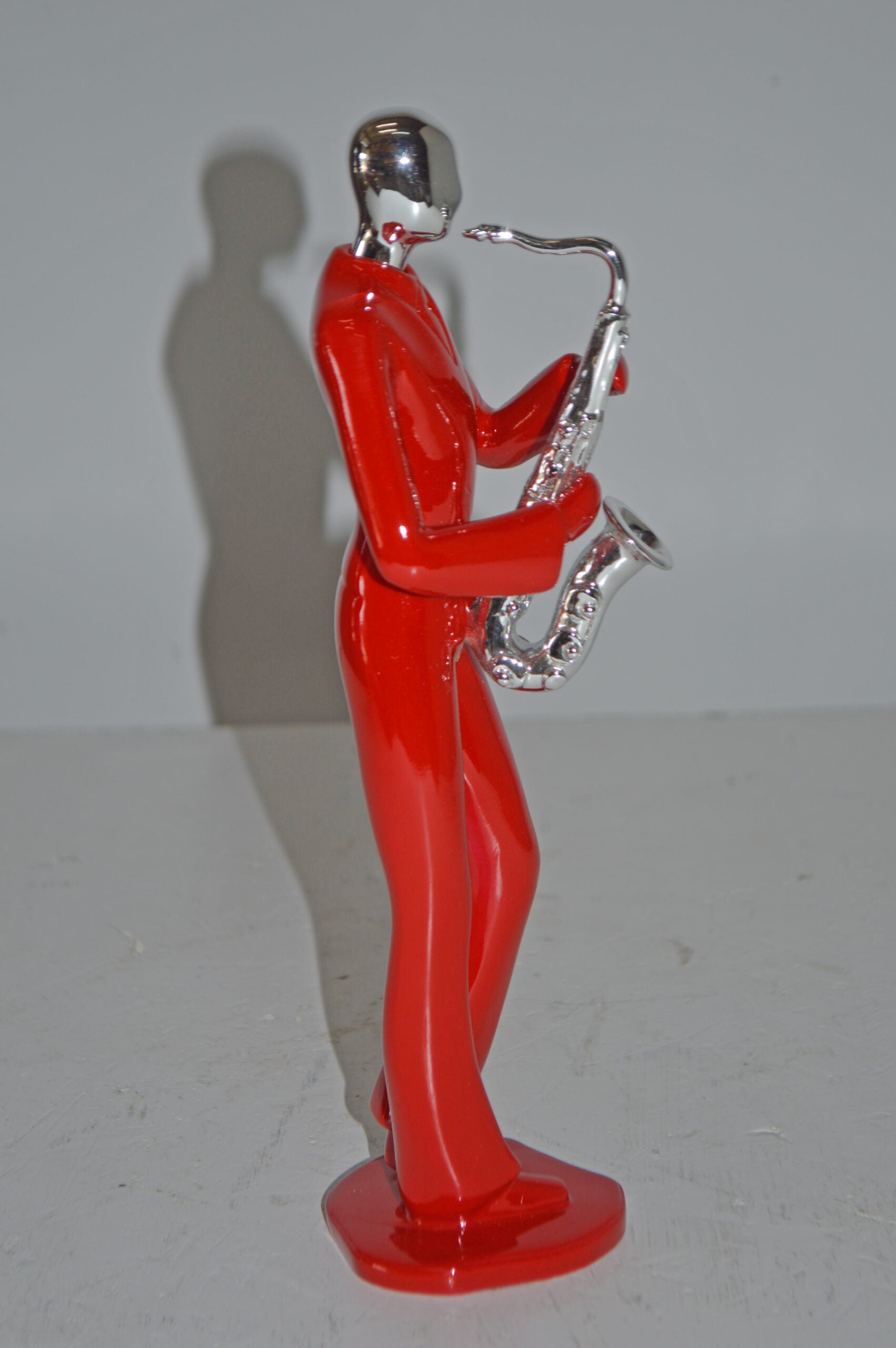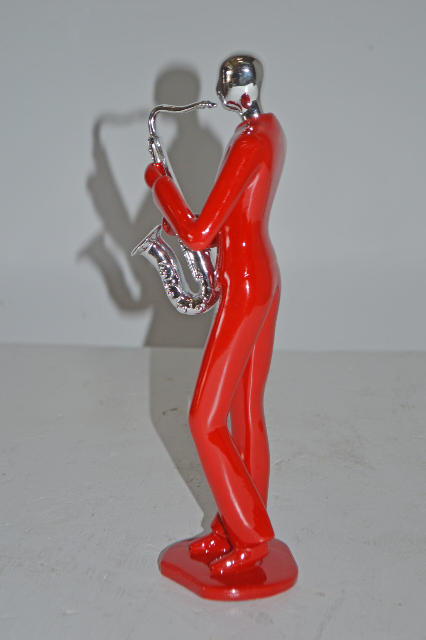 Modern Art Red and Chrome Man Play Saxophone Resin Statue - Size: 4" x 3" x 11"H