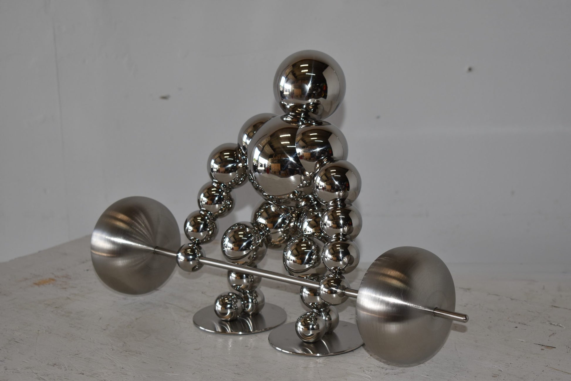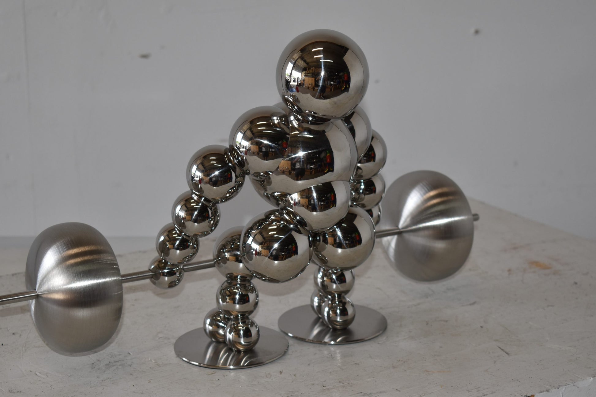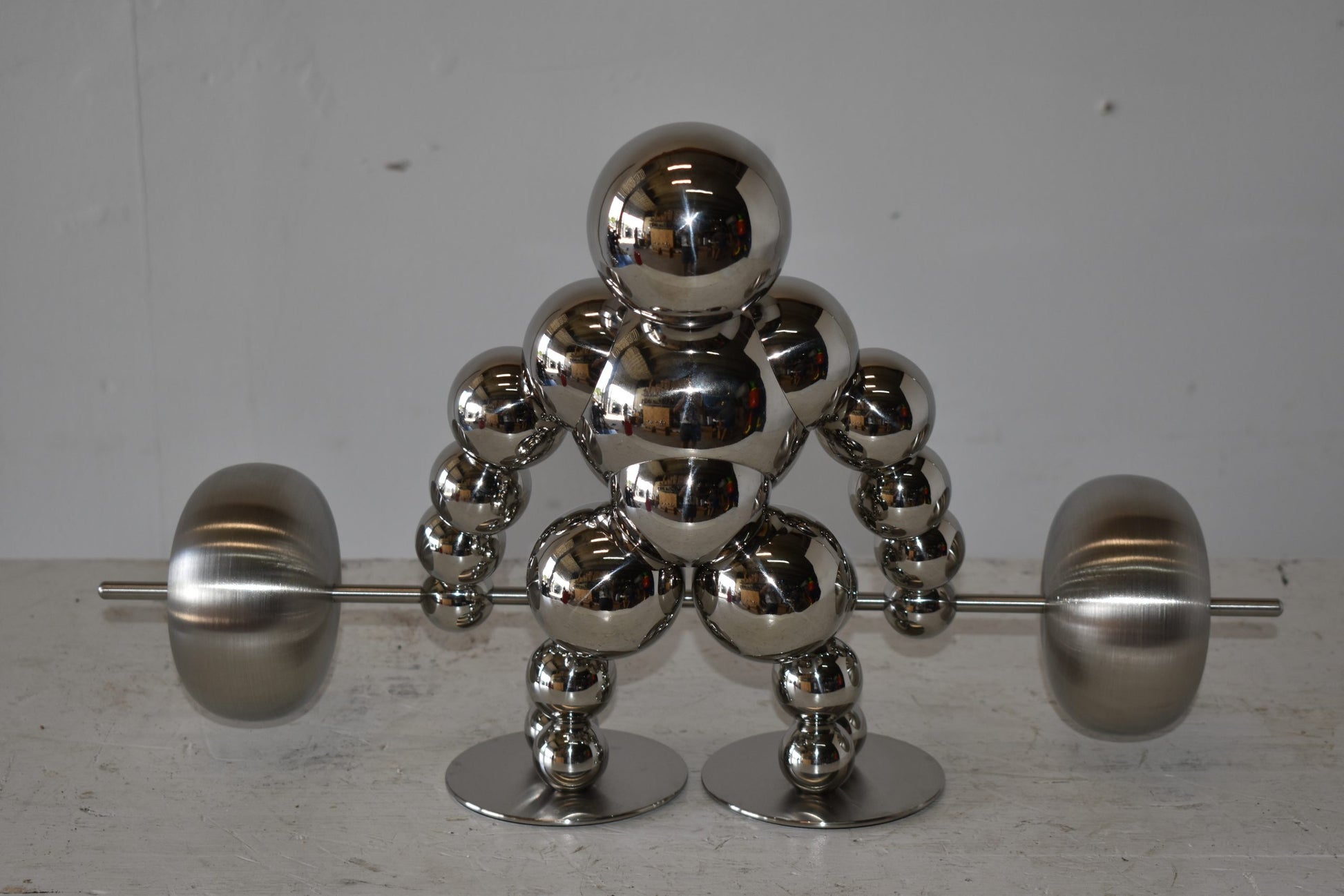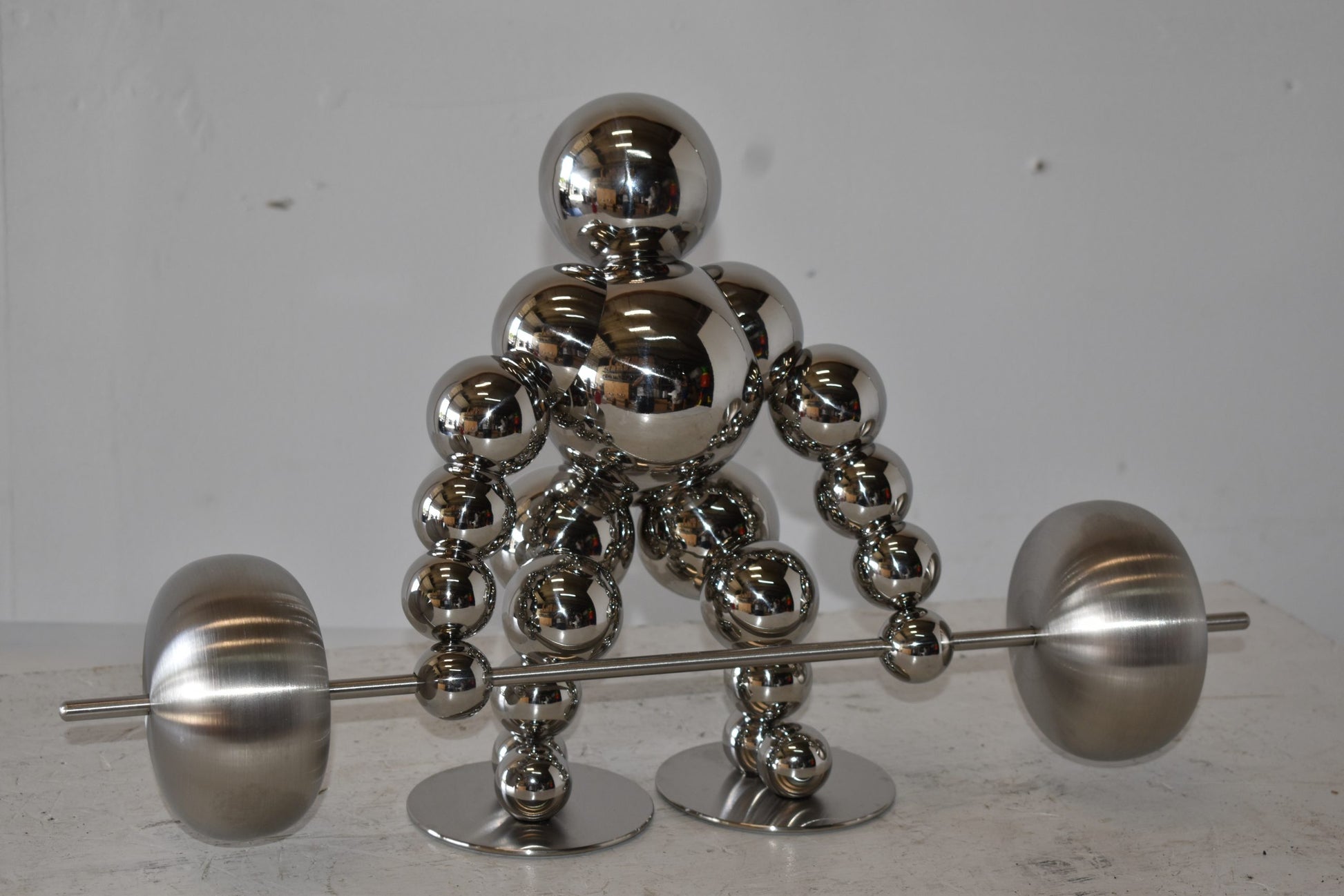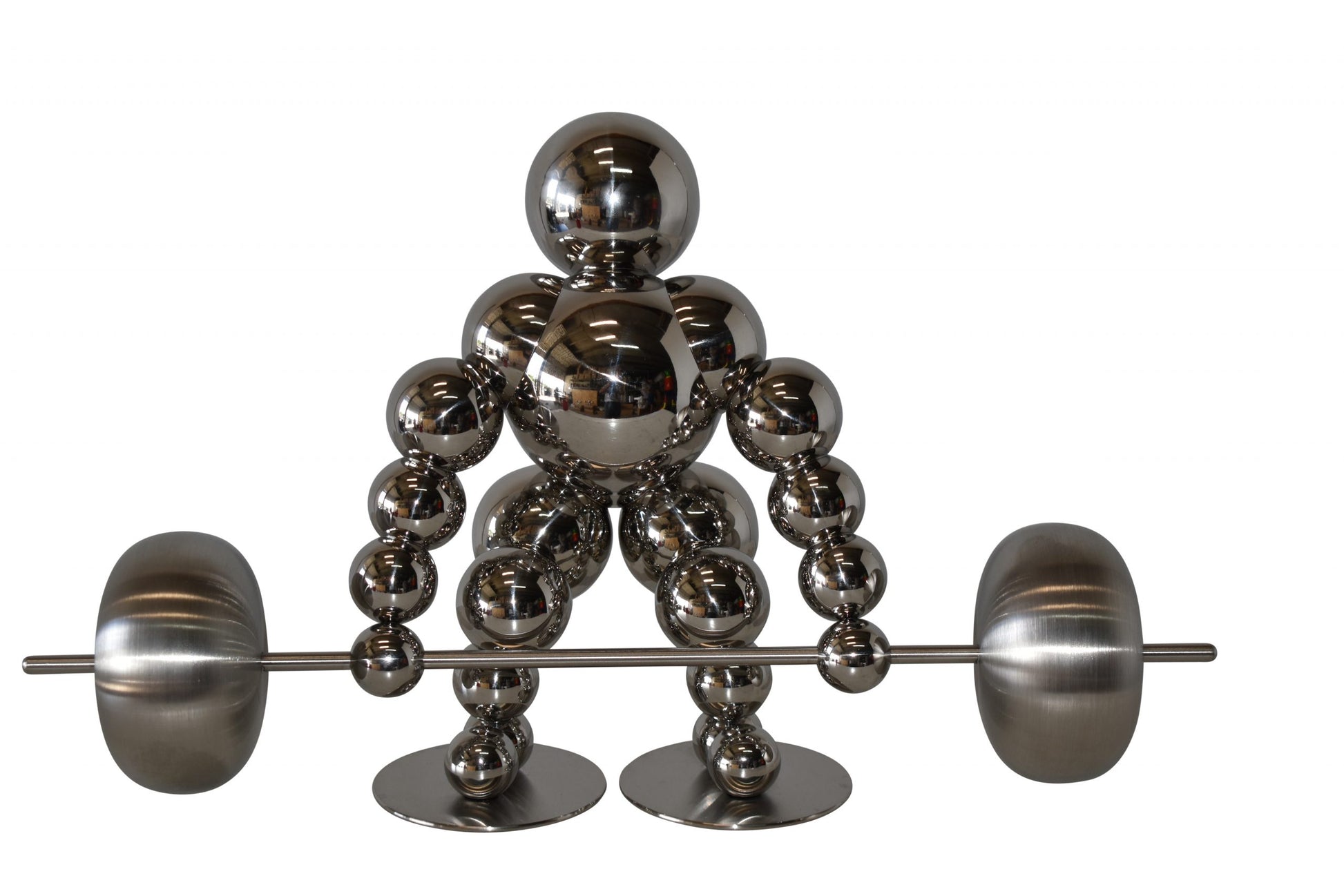 Decorate your home with this beautiful, tabletop, modern looking, stainless-steel abstract of a weightlifter. These decorative abstracts made of Stainless-steel balls will become an extraordinary focal point to any kitchen, Livingroom, or patio! We sell a whole line of this style of modern art. You can be sure they will be a conversation starter and the topic of much appraised comments in your home. Size: 20"L x 8"W x 11"H. Weight is: 4Lb