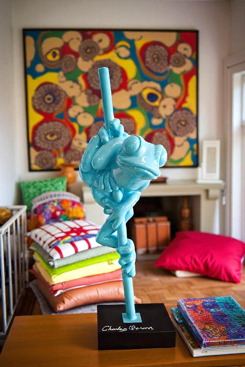 This fun, bright, and humorous resin statue displays a lively frog casually hanging out on a branch. Coated in a beautiful light blue color, it will be sure to bring happiness and beauty to any home or office space. Size: 10"L x 8"W x 28"H. Weight is: 9Lb