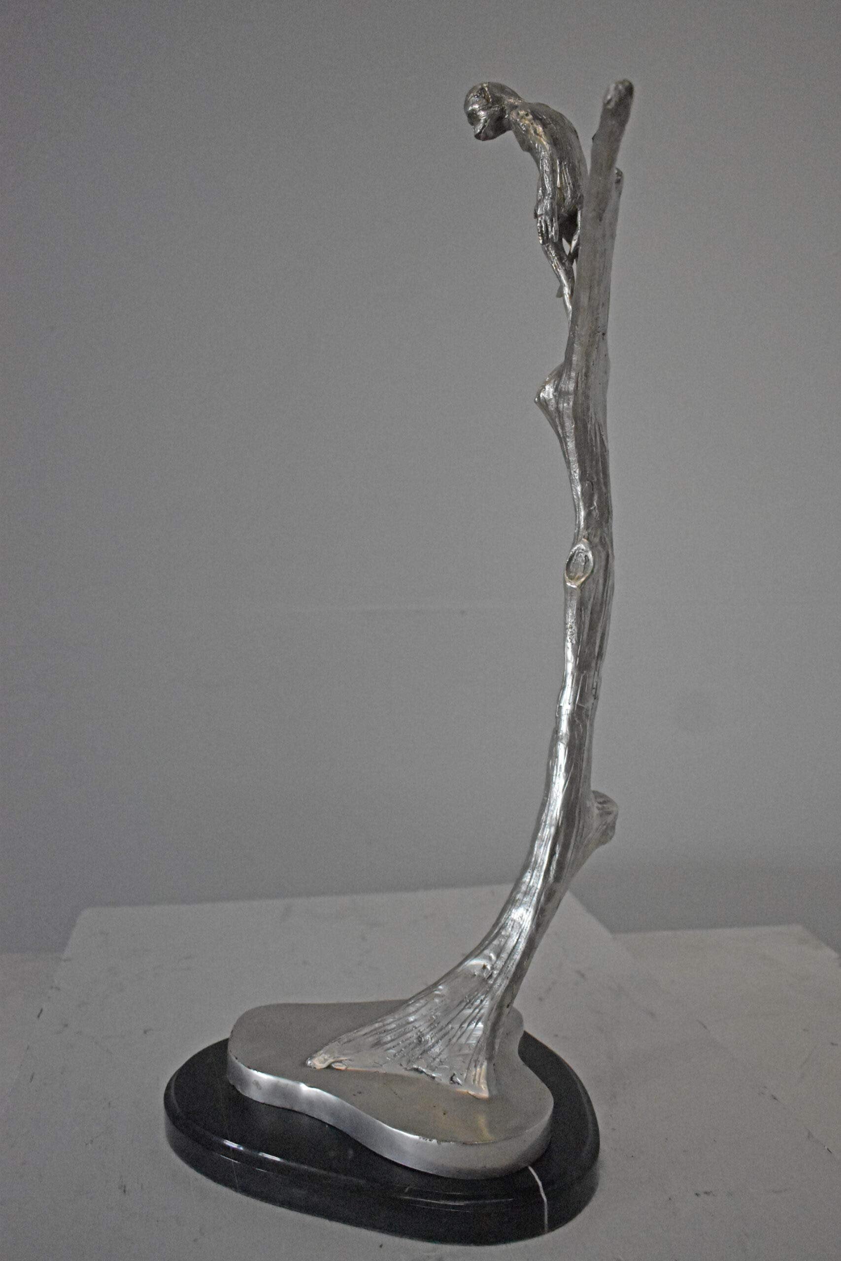 This is a monkey sitting on a tree branch, looking down with exquisite details, giving it a particularly majestic look. This is a true example of a museum quality hand-casted bronze using the Lost Wax Process of bronze casting with silver finish. Perfect for any art, animal, or nature enthusiast. Size: 12"L x 13"W x 27"H. Weight is: 16Lb