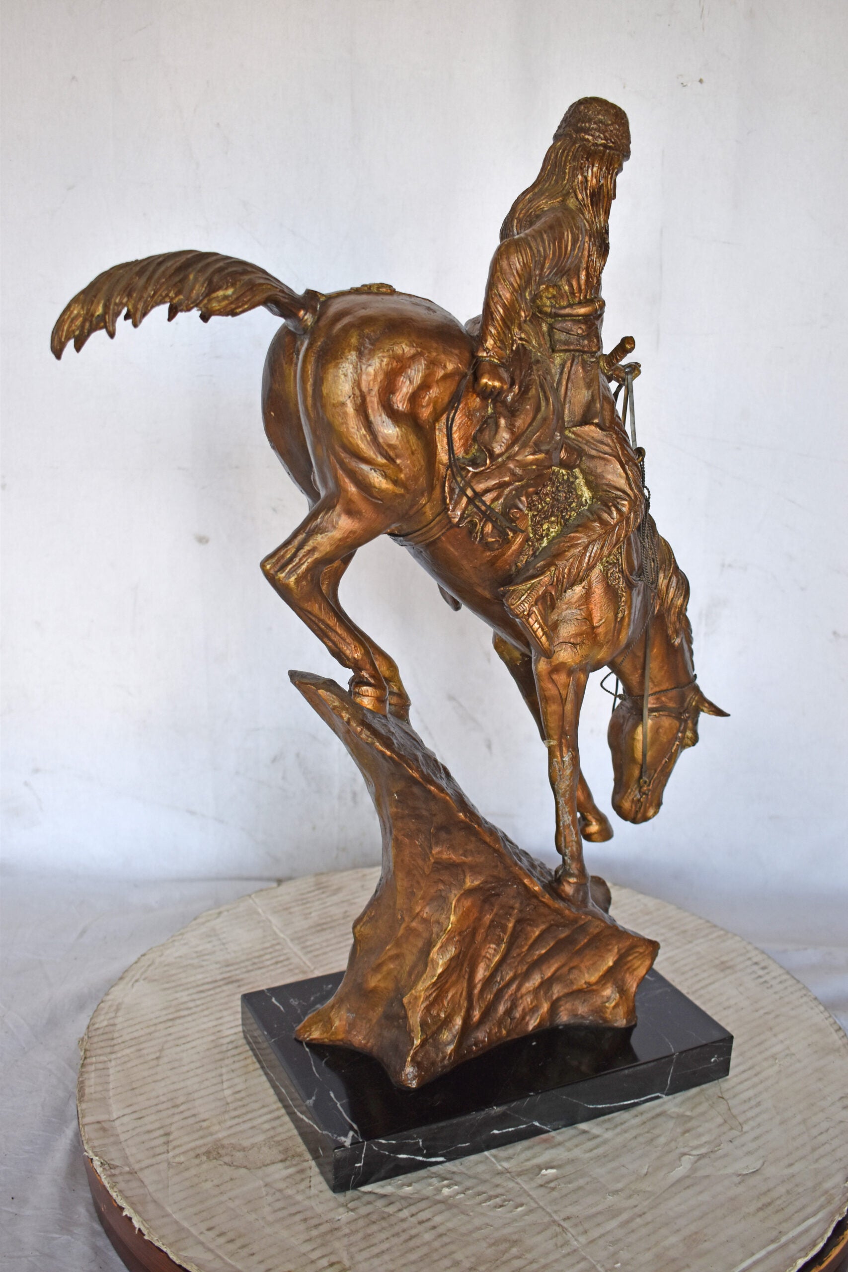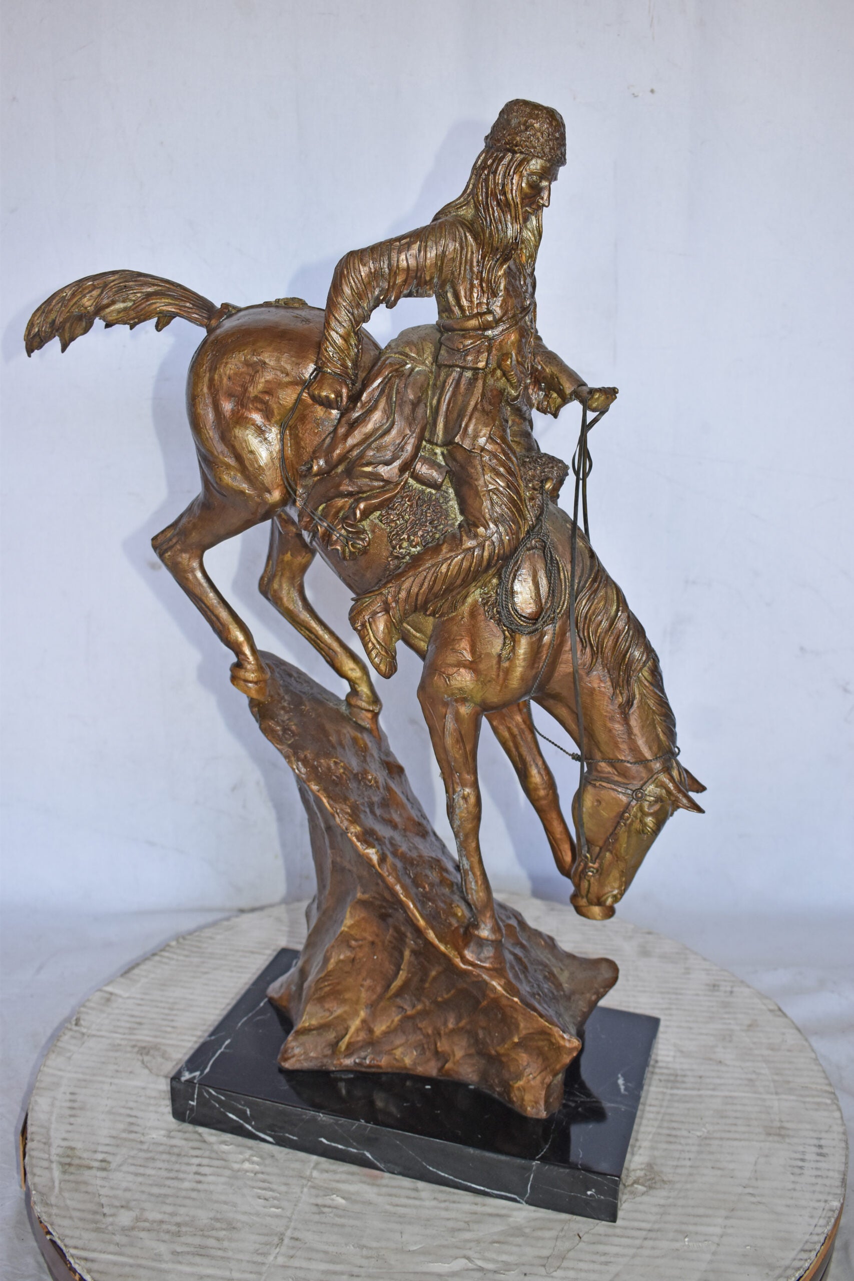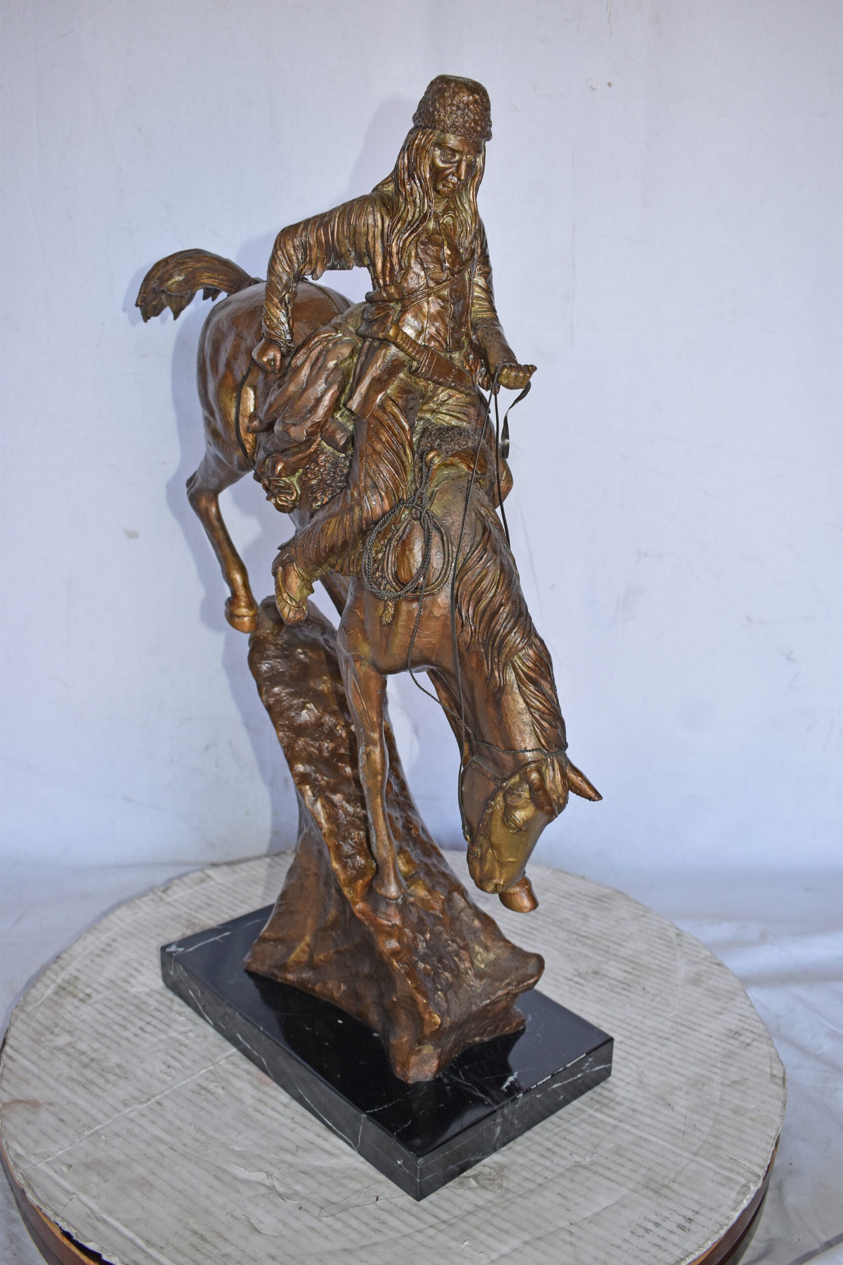 This is a medium size, pure bronze Statue of the Mountain Man replica by Frederic Remington mounted on a marble. The Mountain Man depicts a dramatic moment in the daily life of a frontier trapper, in which he and his mount work together to descend a precarious slope. Cast in the lost-wax technique, the Mountain Man statue is sharply delineated with a rich variety of textures, from the fringed buckskin garment to the animal’s hairy coat to the rocklike base. This replica will add another perspective of the American history to your home. Size: 18"L x 8"W x 28"H. Weight is: 40Lb
