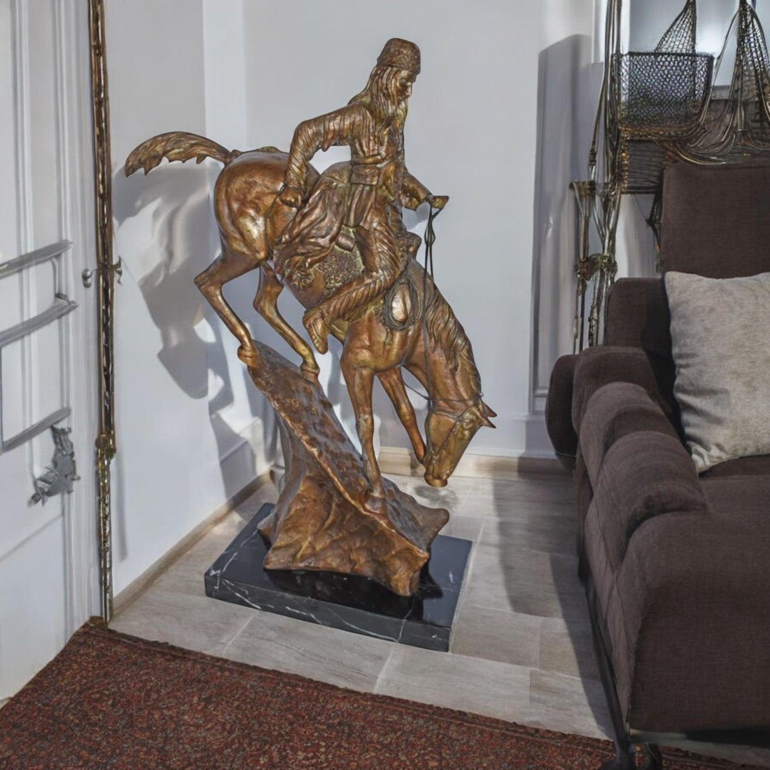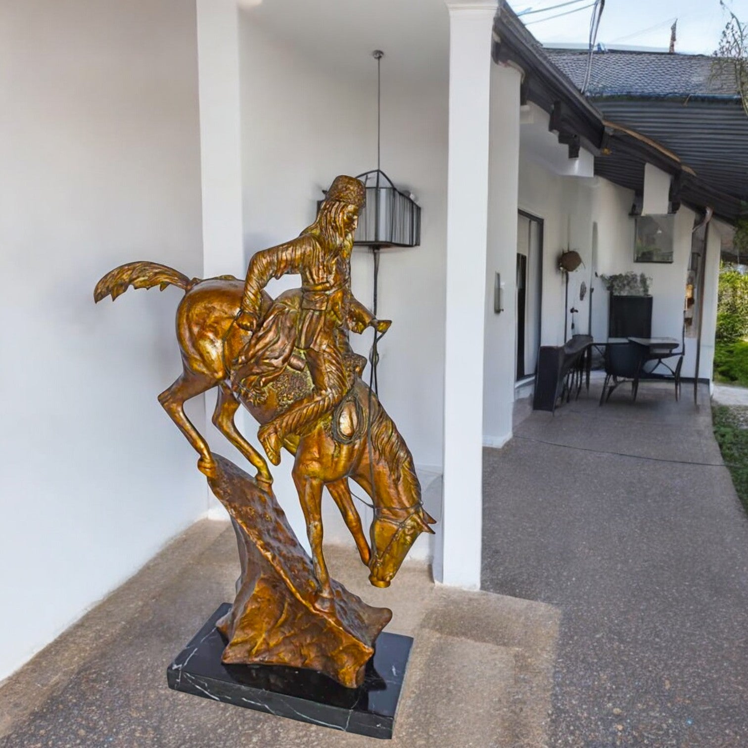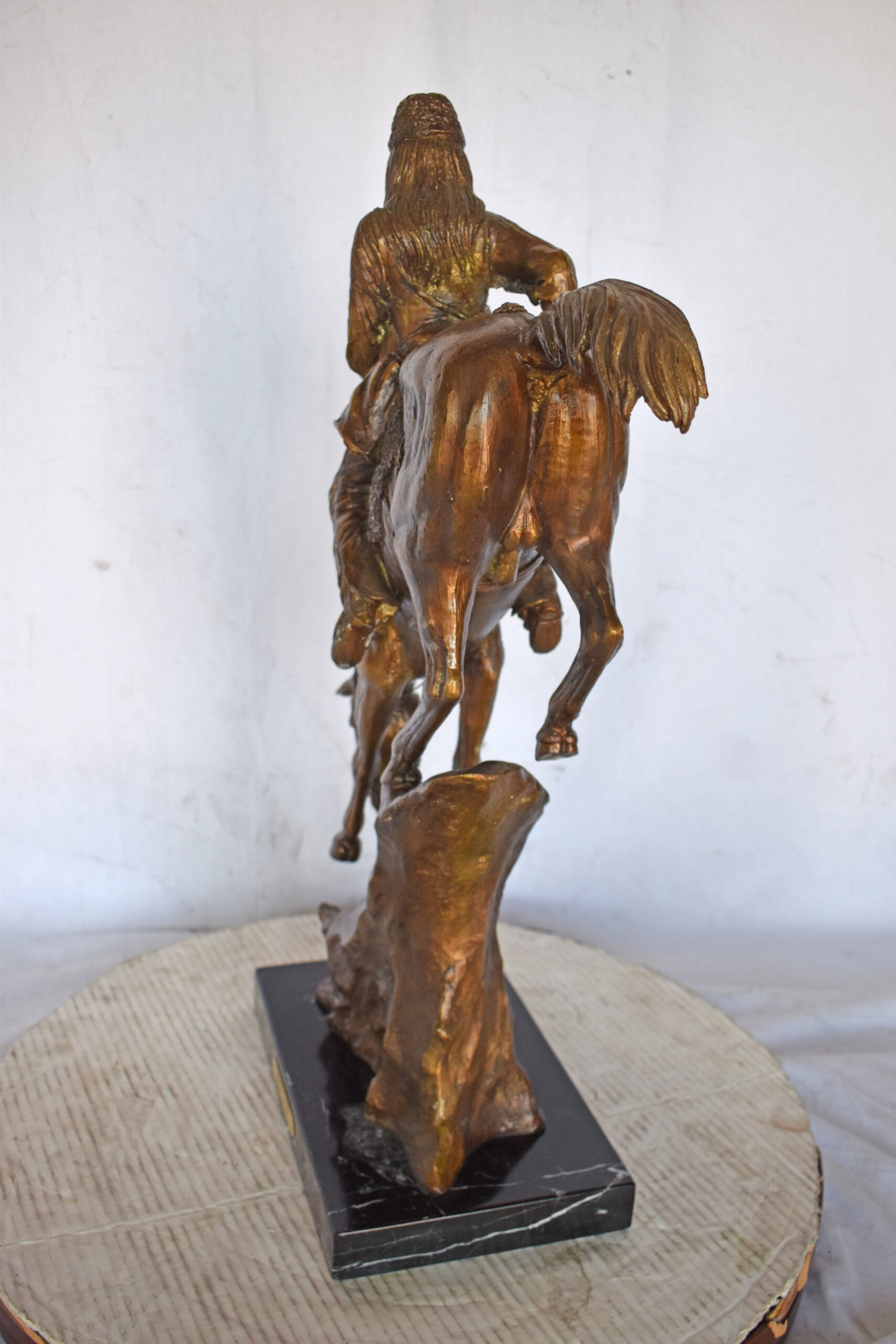 This is a medium size, pure bronze Statue of the Mountain Man replica by Frederic Remington mounted on a marble. The Mountain Man depicts a dramatic moment in the daily life of a frontier trapper, in which he and his mount work together to descend a precarious slope. Cast in the lost-wax technique, the Mountain Man statue is sharply delineated with a rich variety of textures, from the fringed buckskin garment to the animal’s hairy coat to the rocklike base. This replica will add another perspective of the American history to your home. Size: 18"L x 8"W x 28"H. Weight is: 40Lb