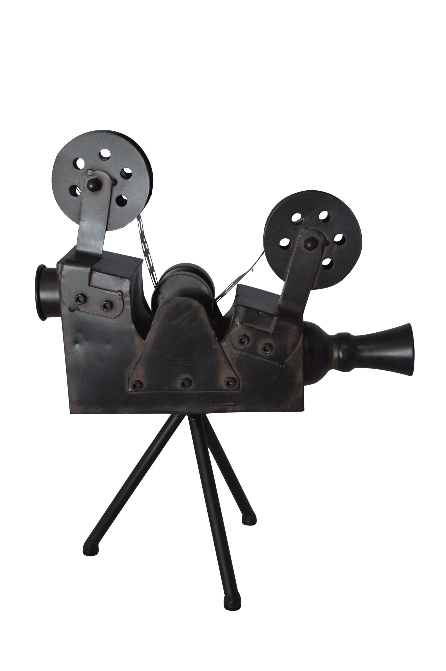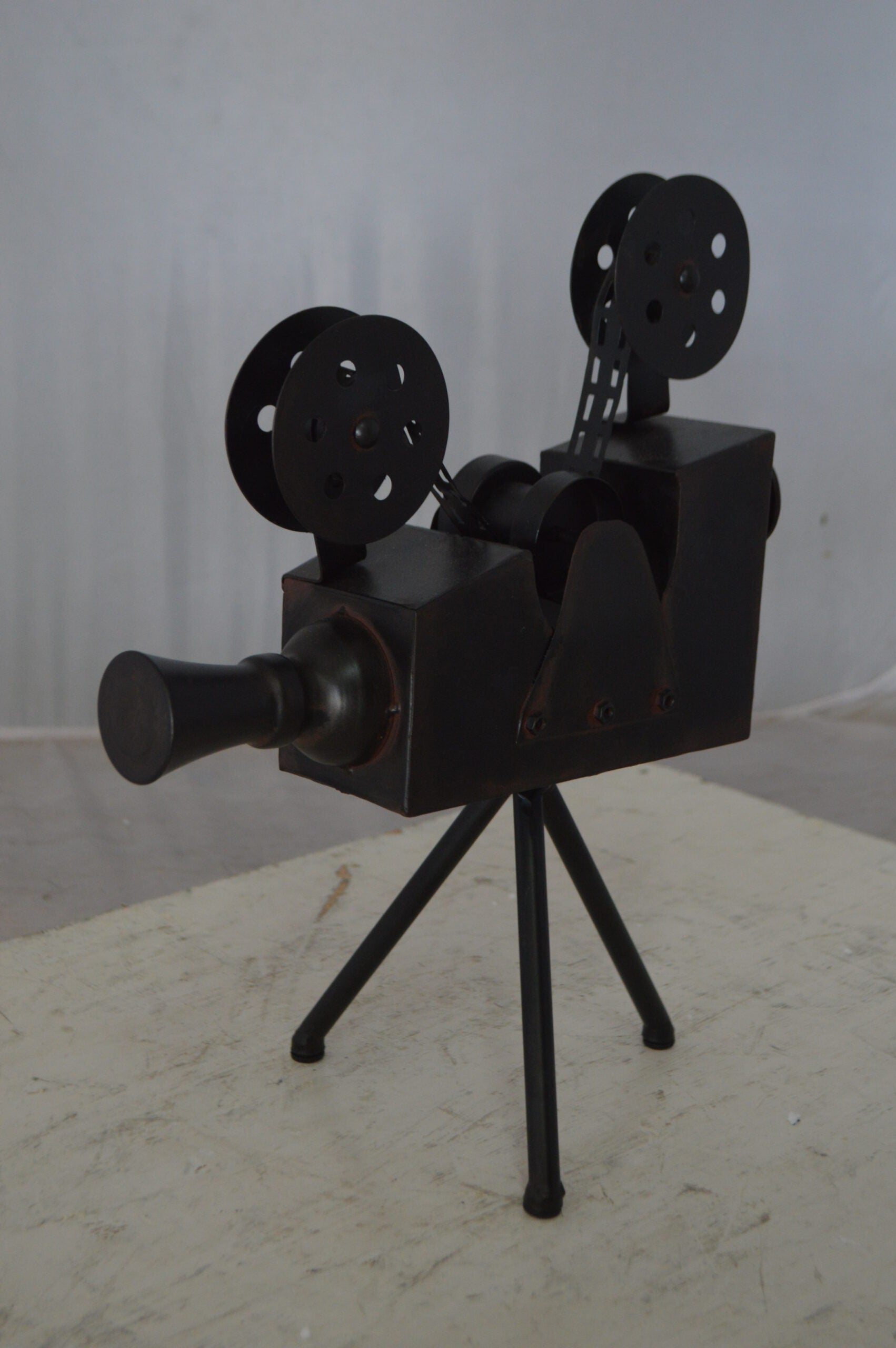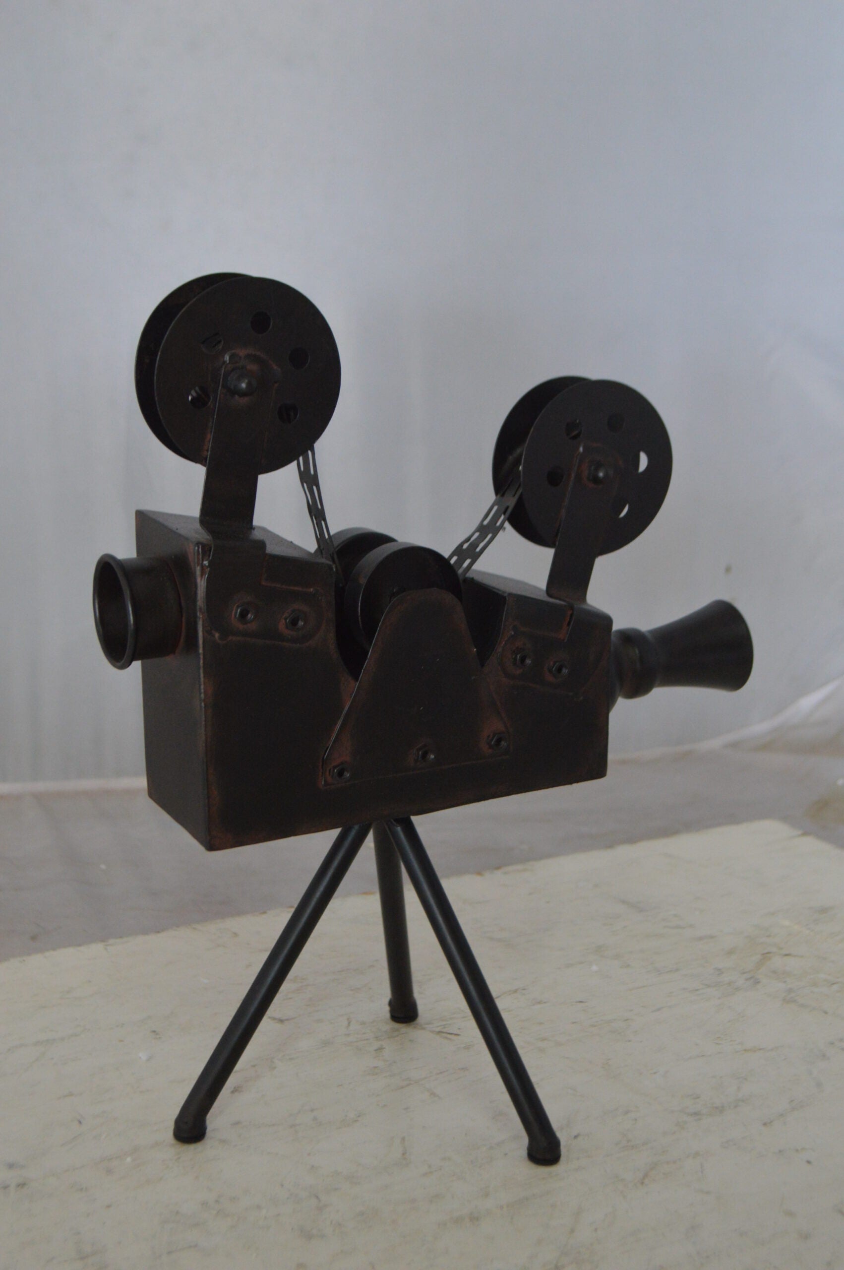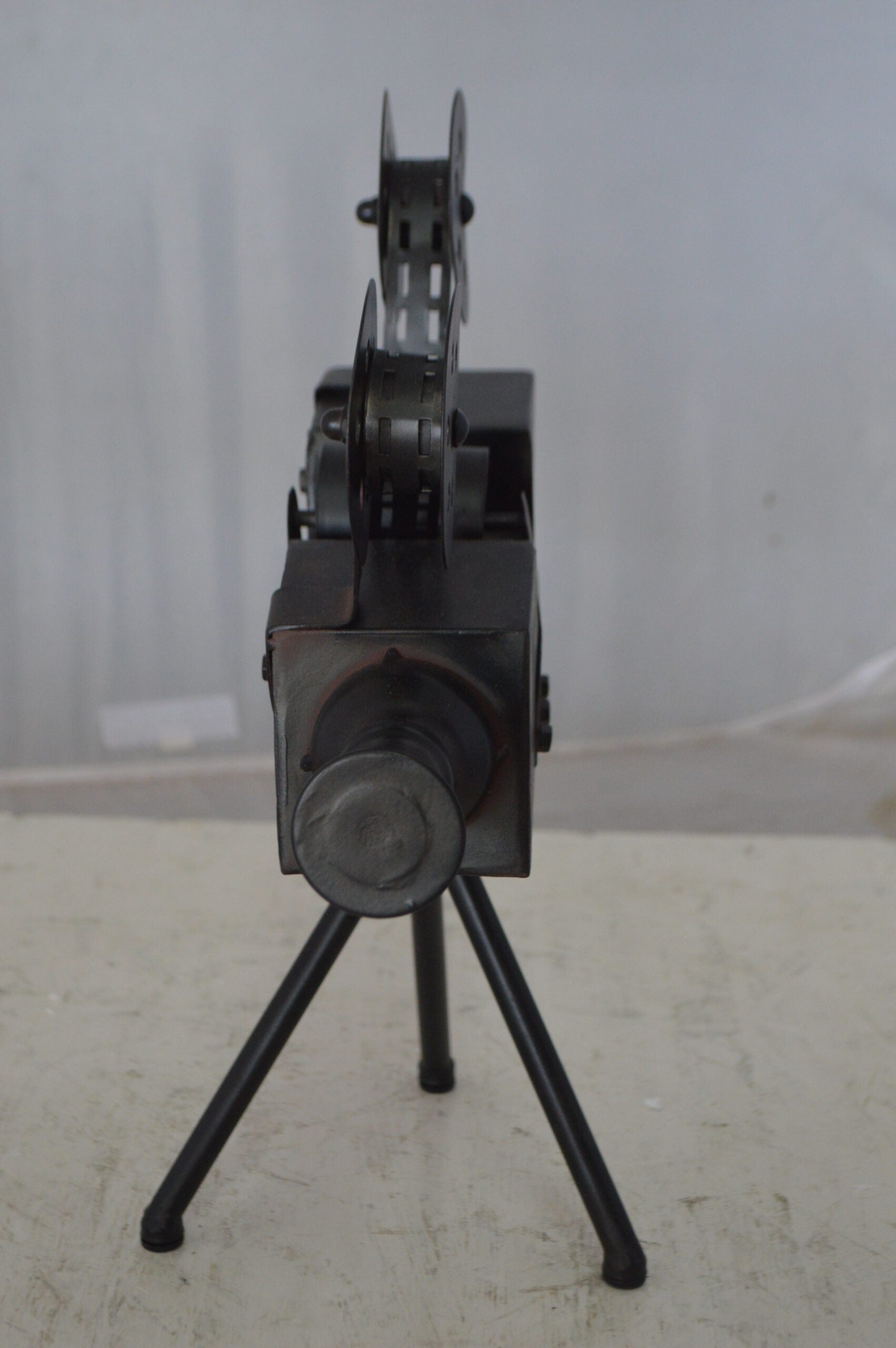 This is a metal statue depicting a vintage movie reel camera decorative abstract, reminds us the good old days before the smartphones era. This is a perfect addition to a home, and reminds us of the simple things in life. Size: 12"L x 6"W x 15"H. Weight is: 2Lb