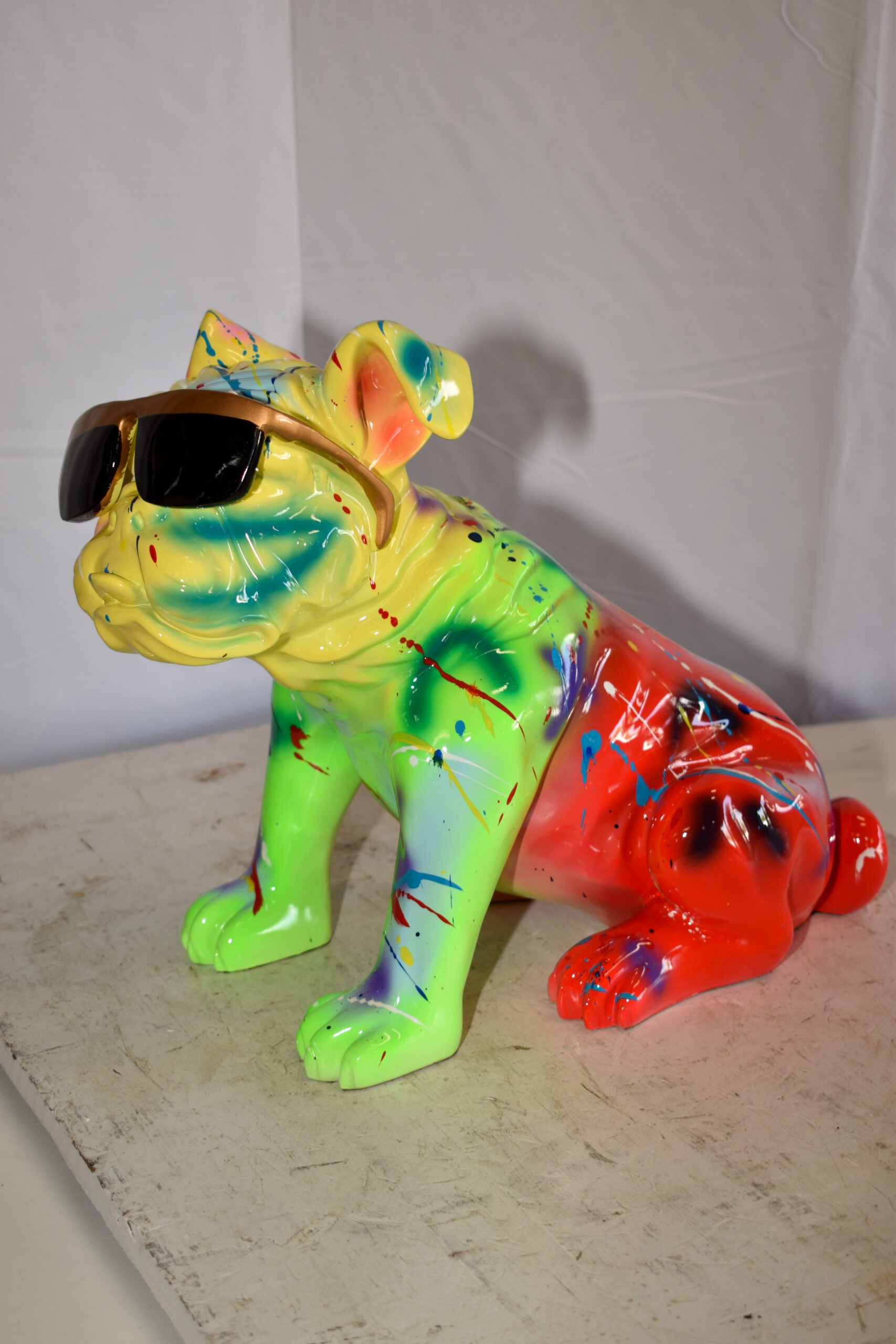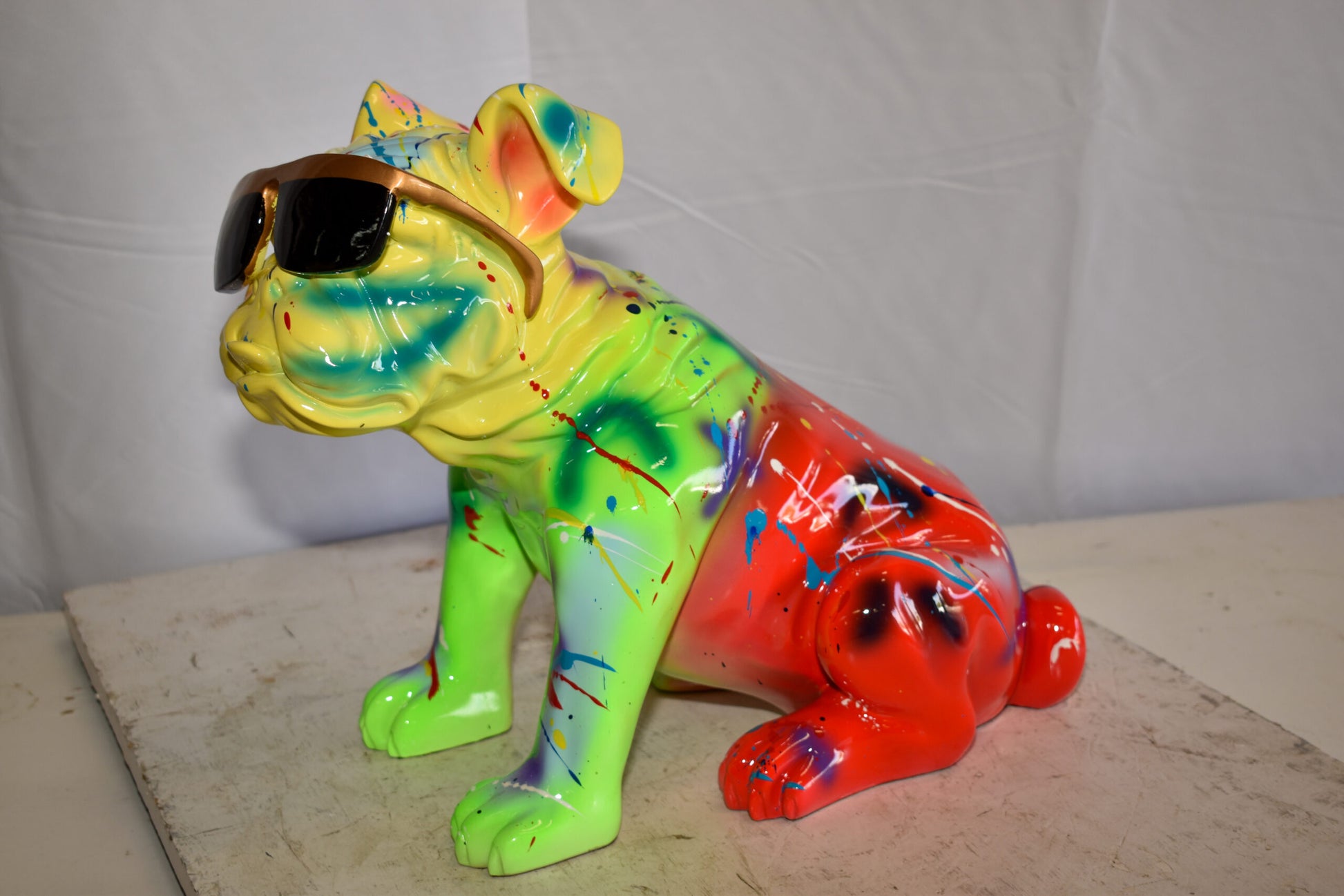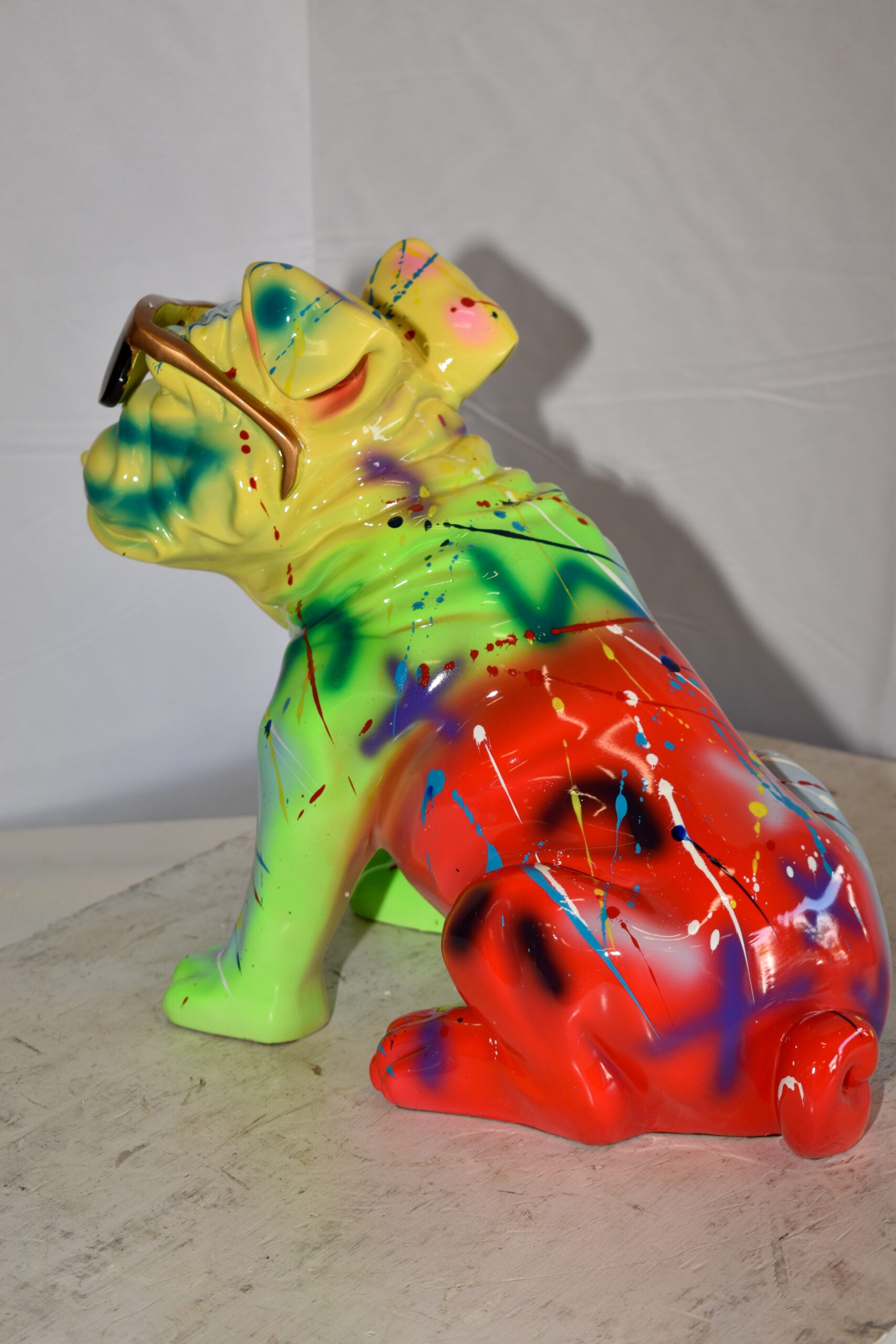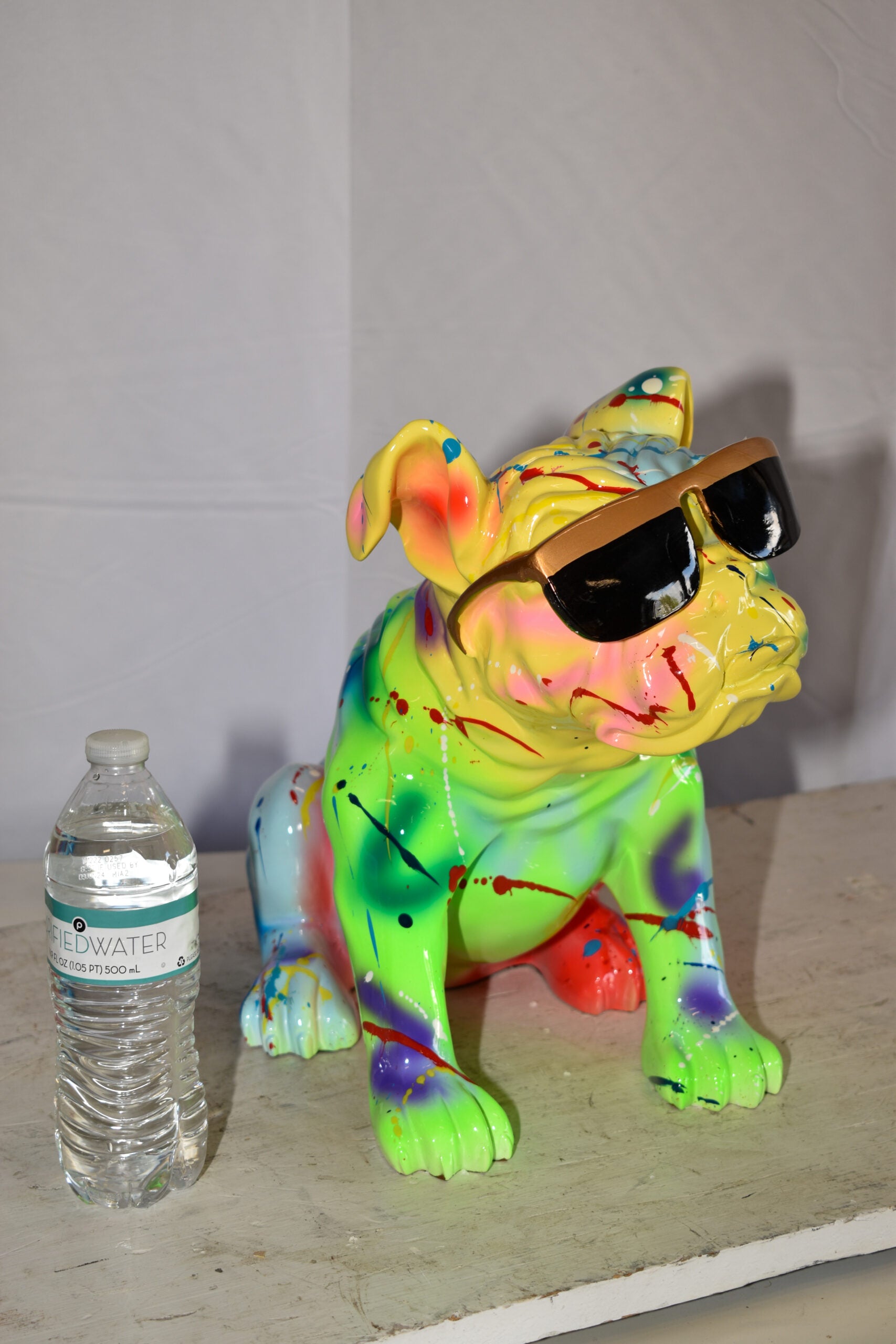 This multicolored graffiti patterned resin statue of a bulldog with shades on is humorous, colorful, and fun! It will be sure to stop eyes in any room and add vibrance to any space. Size: 16"L x 9"W x 13"H. Weight is: 6Lb