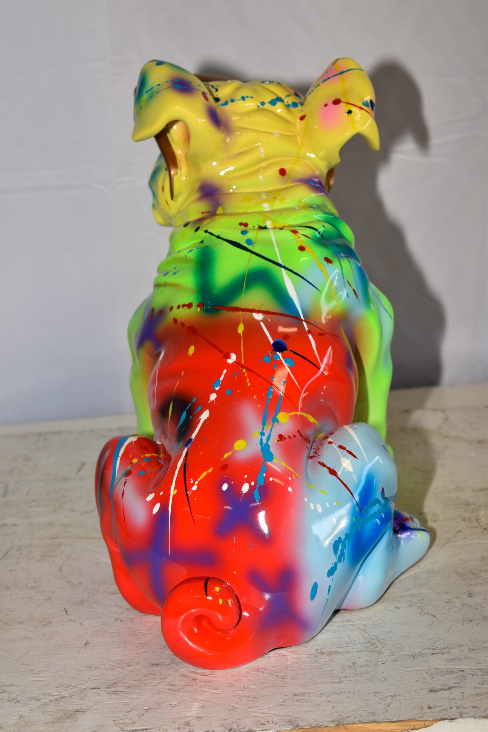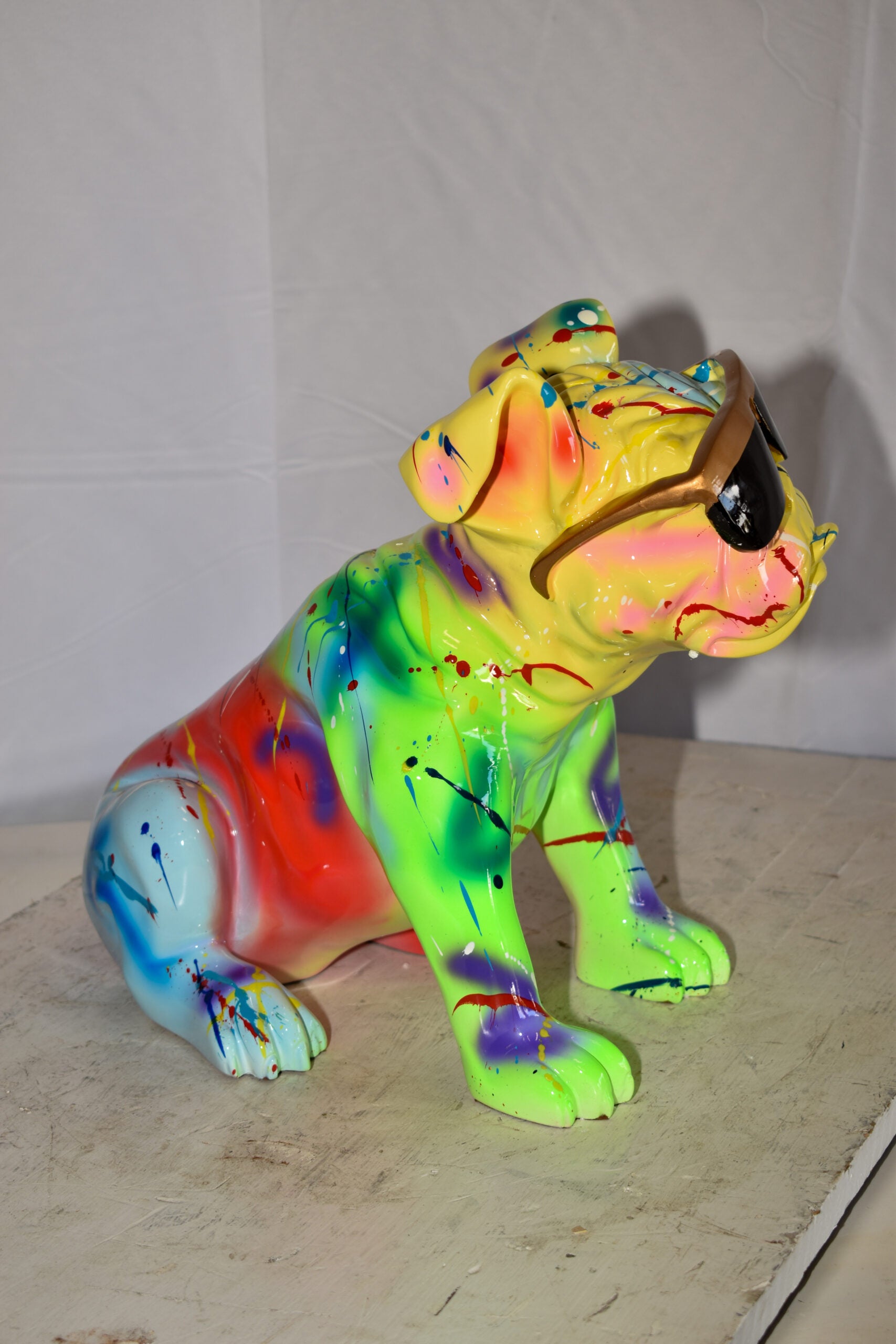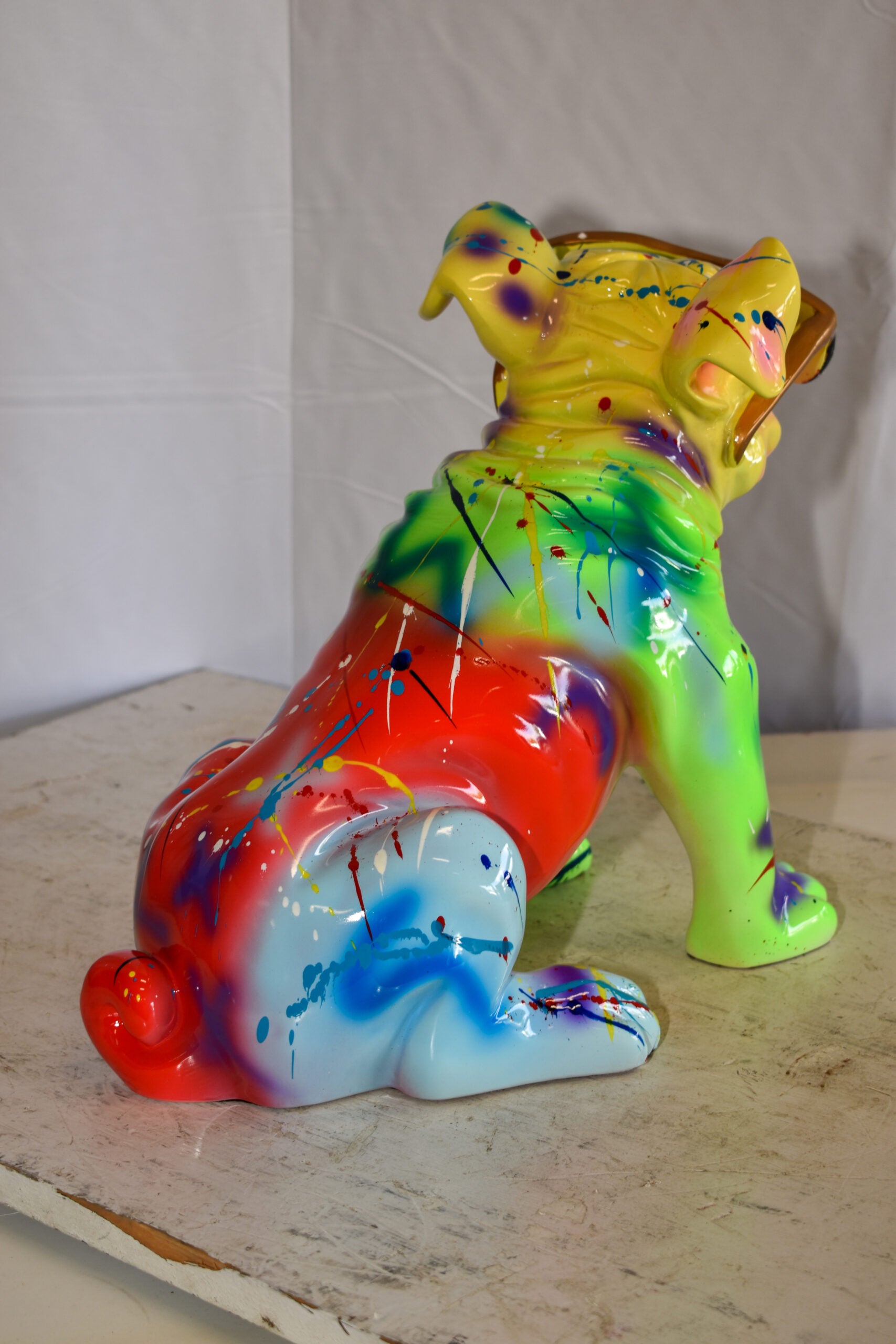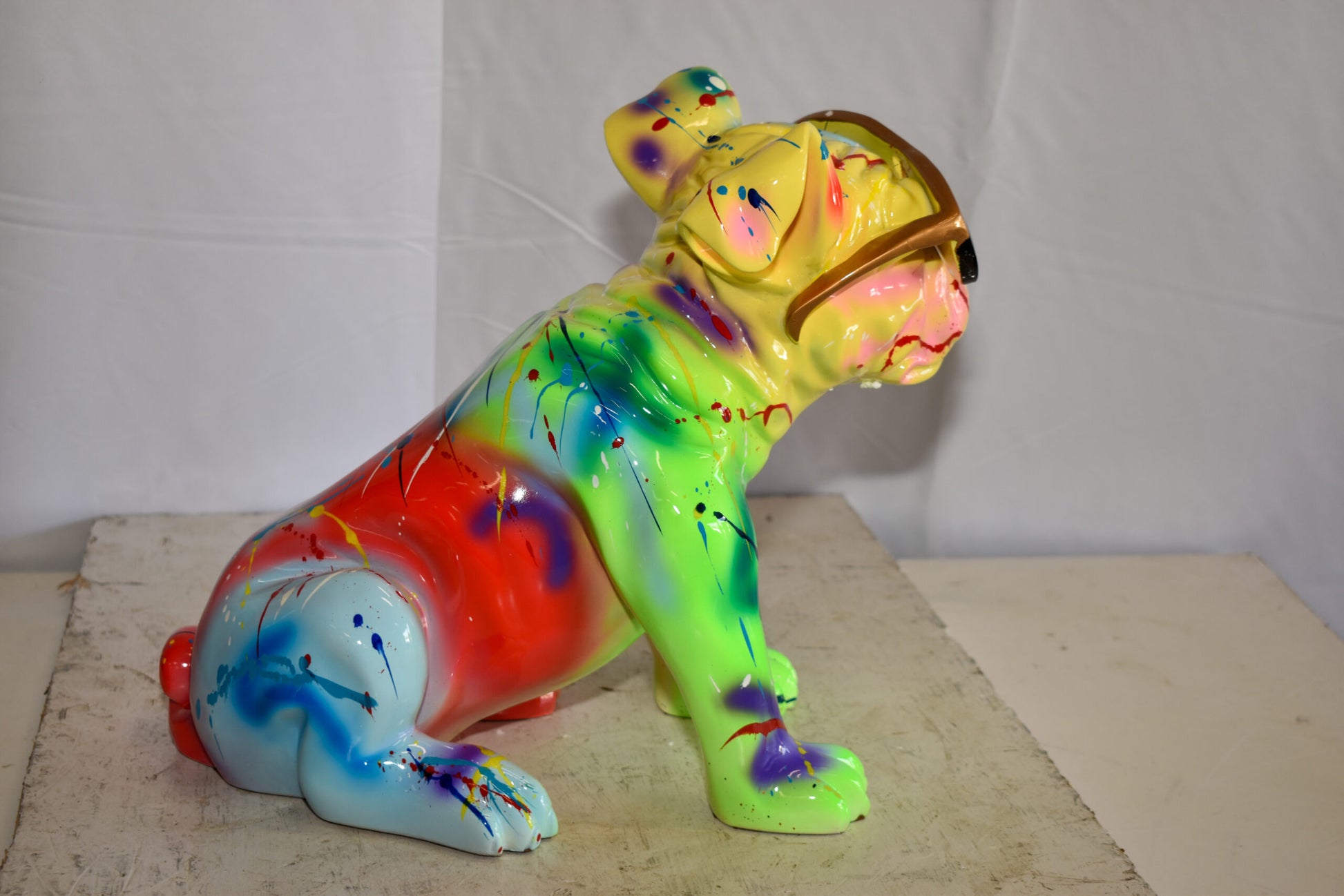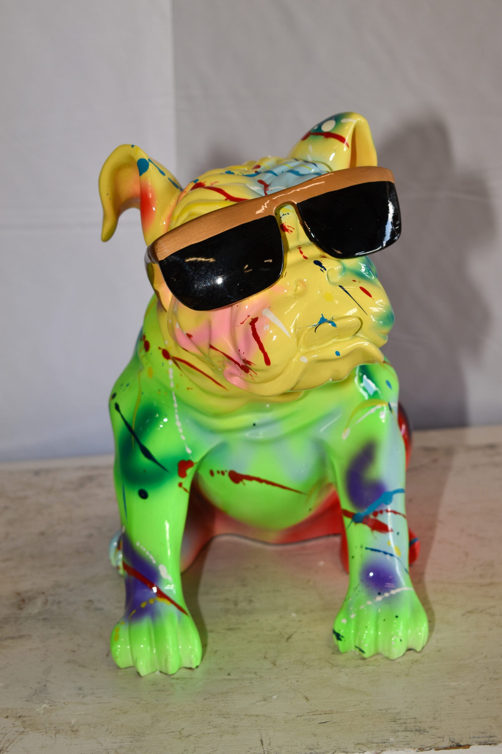 This multicolored graffiti patterned resin statue of a bulldog with shades on is humorous, colorful, and fun! It will be sure to stop eyes in any room and add vibrance to any space. Size: 16"L x 9"W x 13"H. Weight is: 6Lb