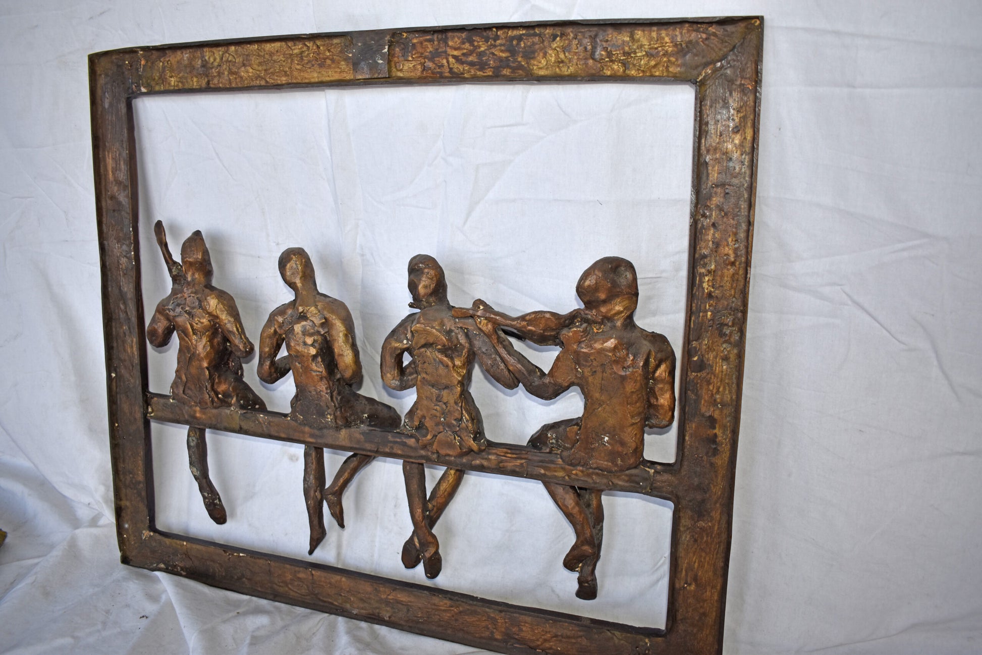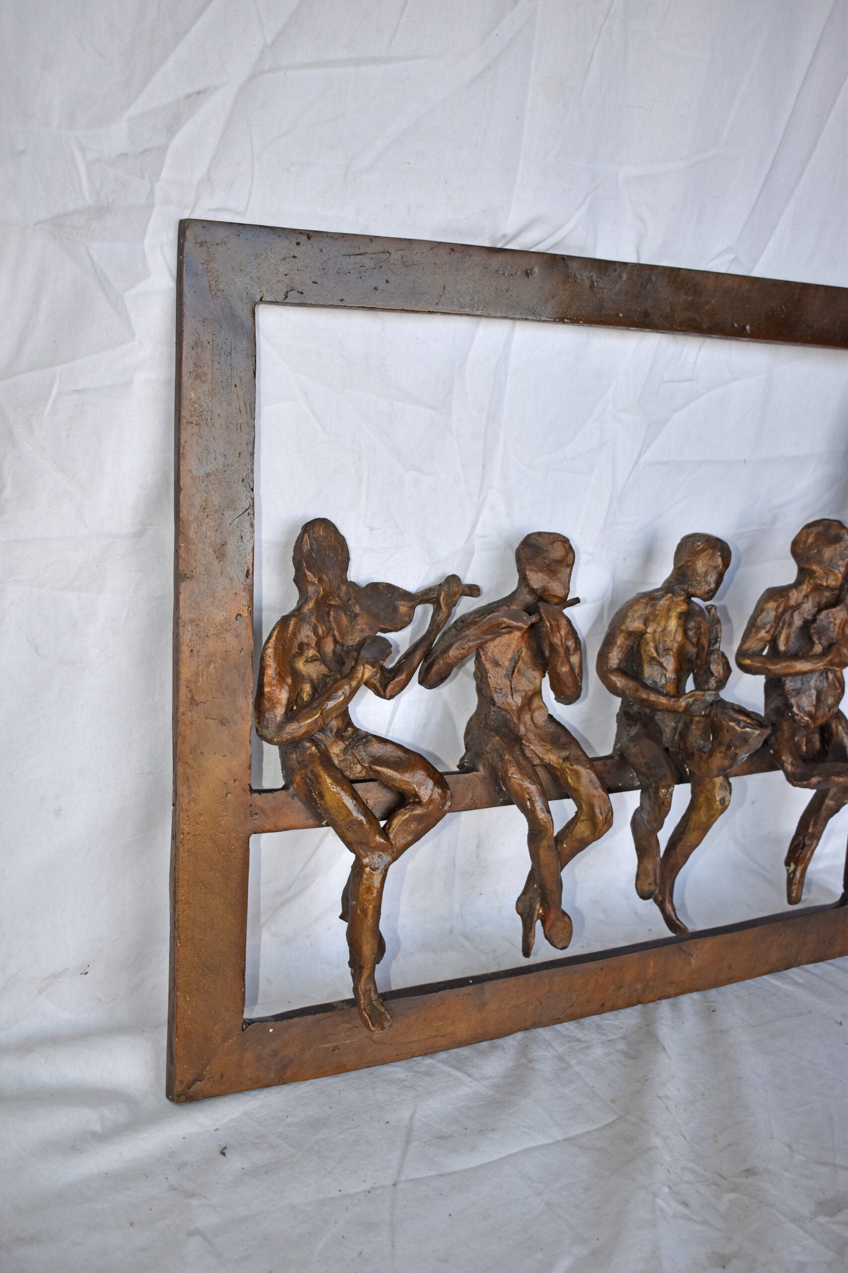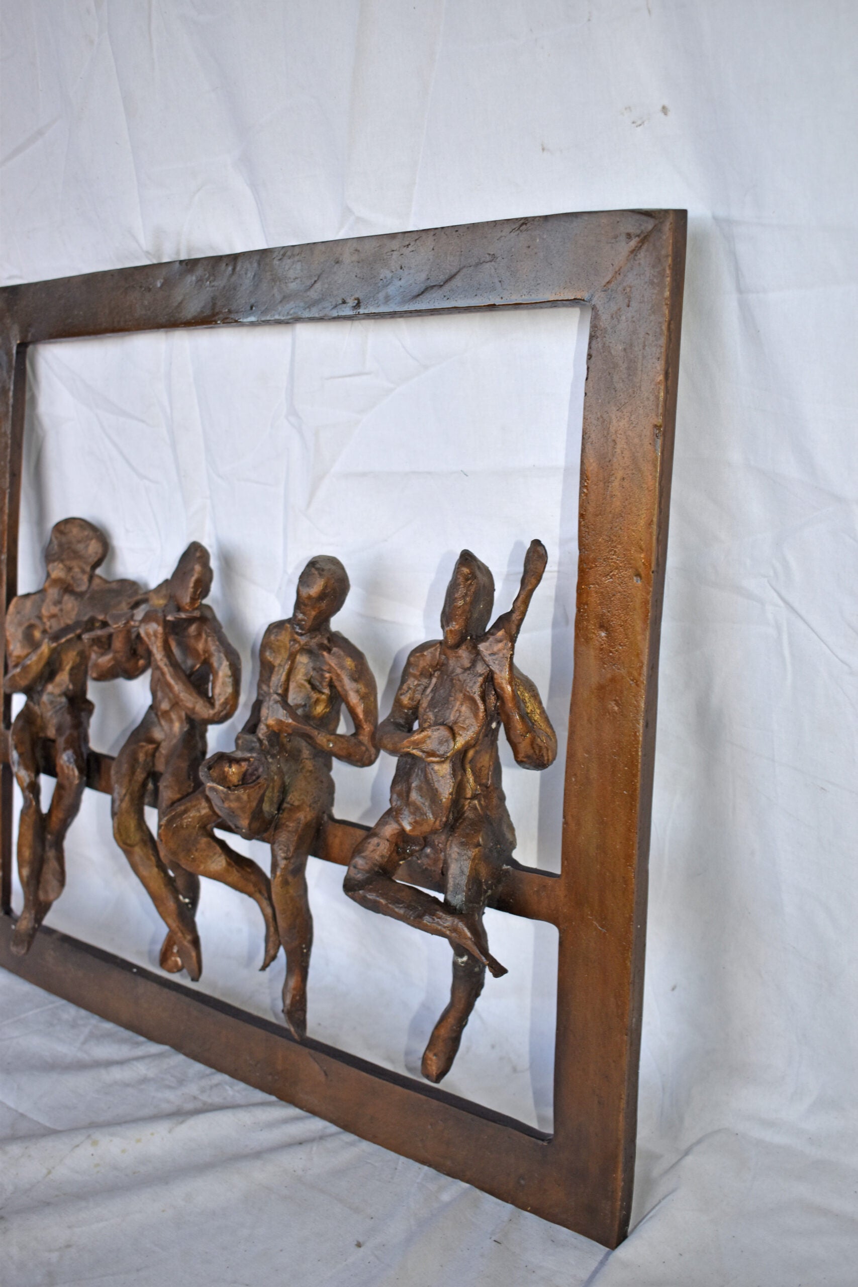 This impressive jazzy wall frame made of 4 musicians can be mounted on any wall desiring a happy addition for any music lover. The immense detail in both the iridescent color of the patina and the shape makes it both surrealistic looking and unique in design. The frame features 4 musicians playing the Violin, Flute, Saxophone, and guitar in a natural form. This bronze statue is cast in the traditional lost-wax method, which highlights the exceptionally fine detail and guarantees lasting heirloom beauty. This work of art would pair well with any of the other musical art you may have. Size: 21"L x 25"W x 4"H. Weight is: 20Lb