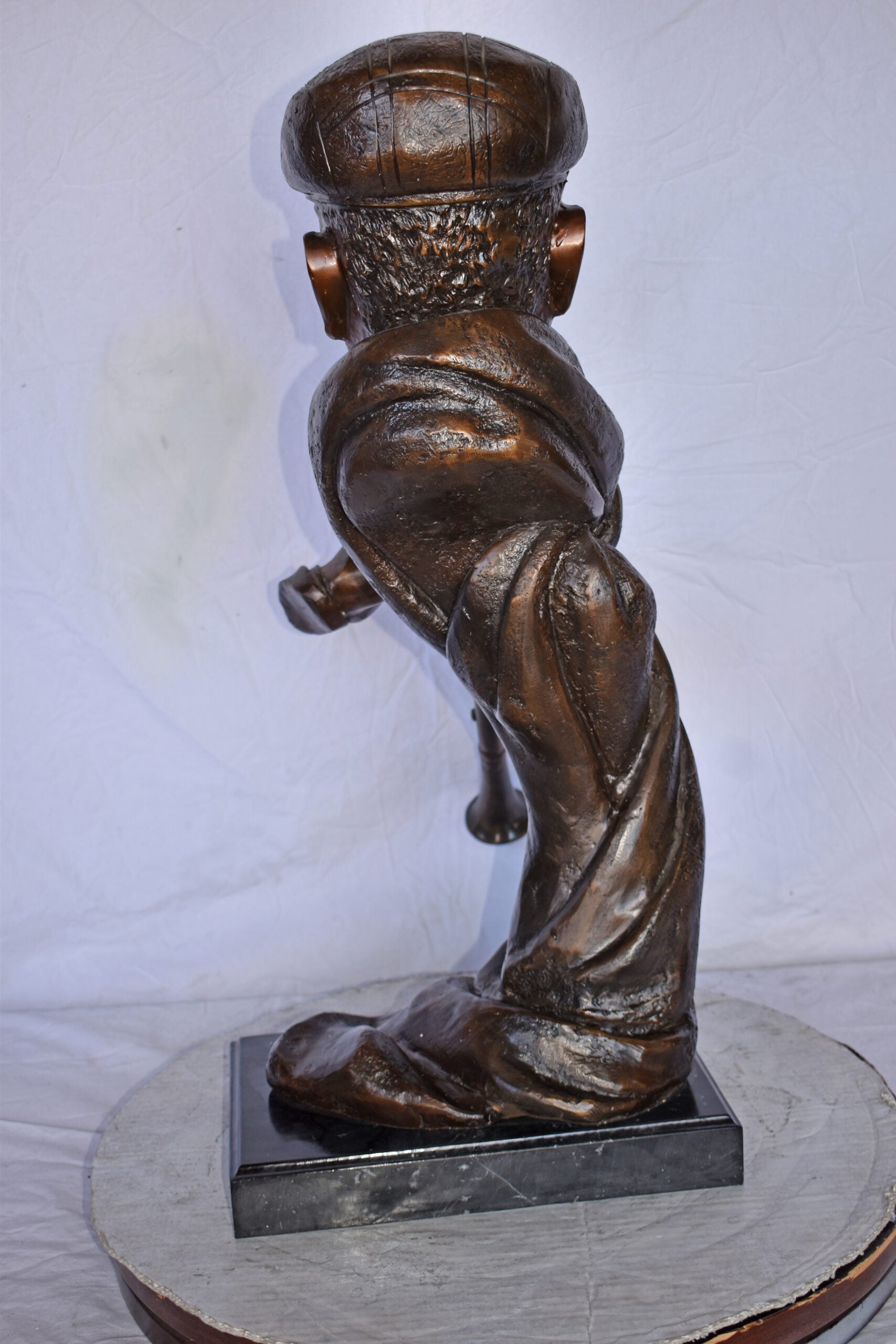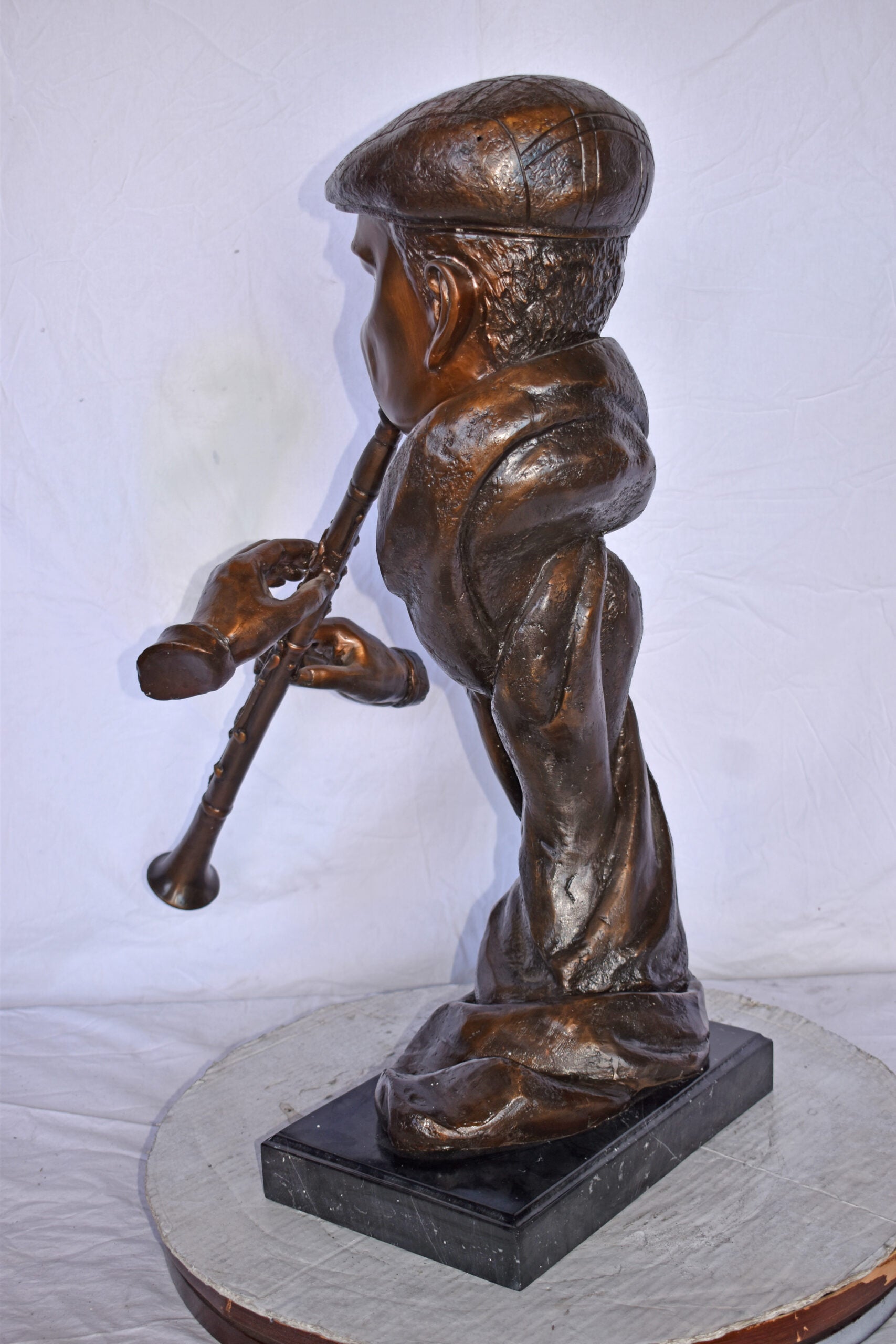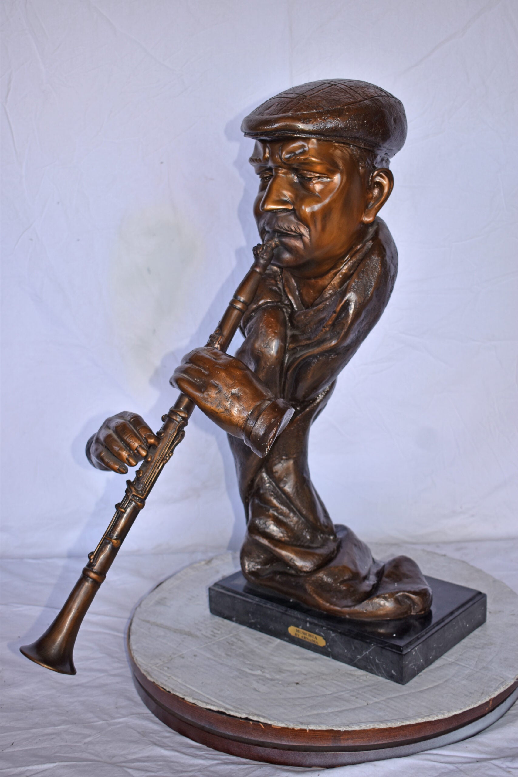 This amazing and creative abstract of a musician playing his Clarinet is a part of a series of 3 statues of a player with violin and Saxophone. The sculpture is made with the creation of your imagination. The artist only captures the man’s head, face, hands, Saxophone, and blazer's collar. This fine and unique abstract was casted using the ancient old Lost Wax Method, covered in brown patina finish, mounted atop a black marble base. Size: 17"L x 25"W x 31"H. Weight is: 70Lb