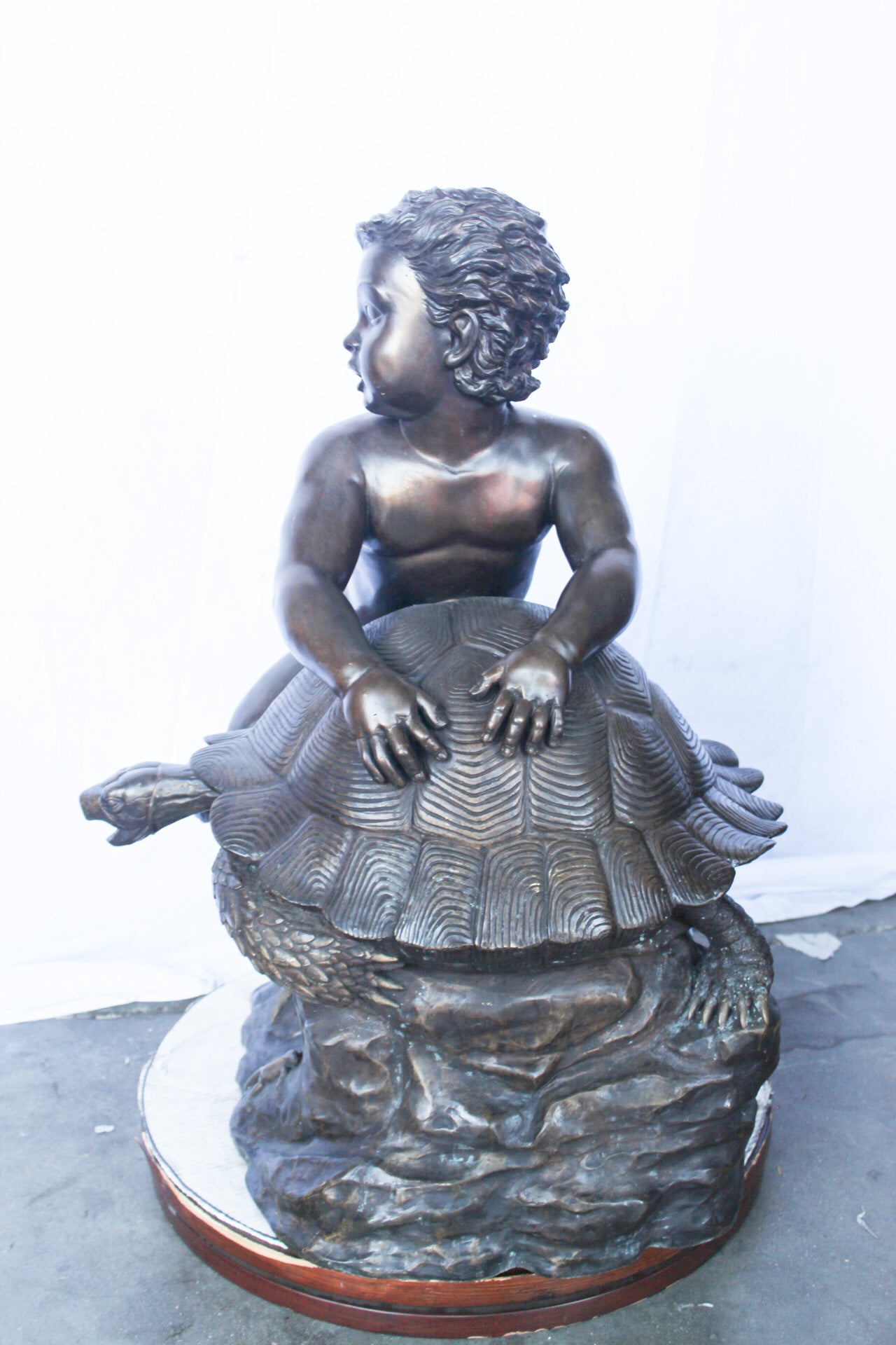 This bronze statue is unique and would look wonderful in a garden or outdoors area. In this piece of art, a young naked boy is grasping onto a turle who is calmly sitting on a bundle of rocks. The artist made sure to include an abundant amout of detail to this beautiful piece. Size: 23"L x 26"W x 34"H. Weight is: 104Lb