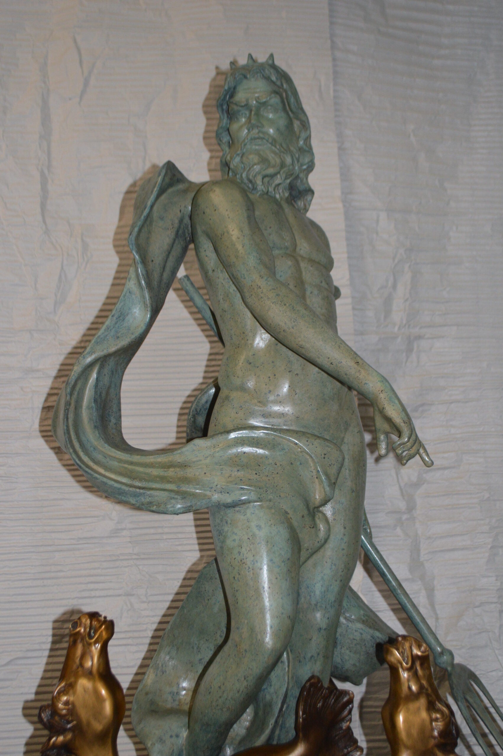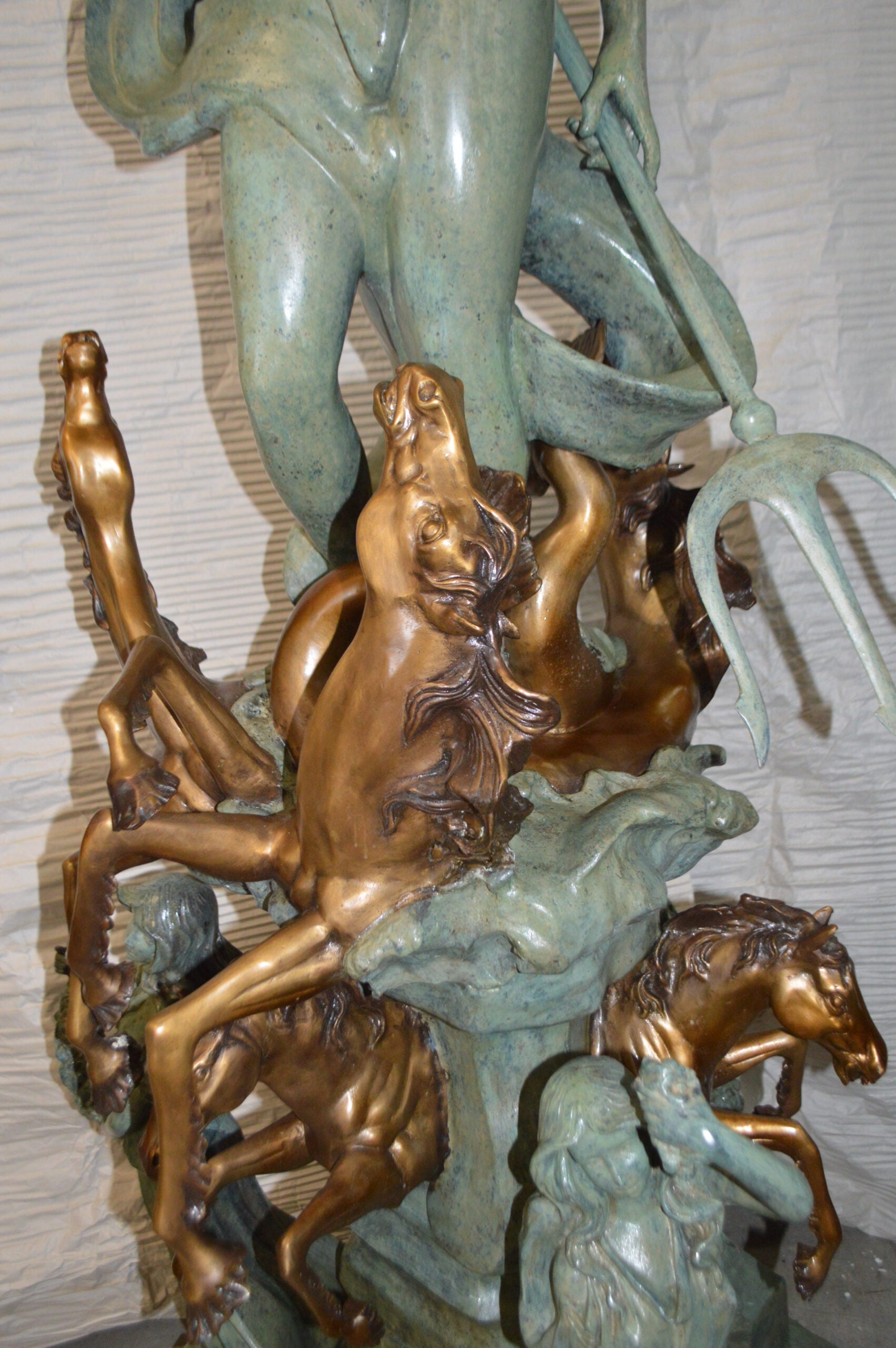 Surprise your garden guests with this large size outdoor Bronze fountain Statue, Replica of two Neptune with 6 horses. Each one of the horses is equipped with a hose that sprays water out of their mouth, with the use of a fountain pump (pump is not included). Produced using superior quality bronze and a traditional casting method that yields pristine details. . The patina chosen for this Timeless Creation is a mix of hand finishing with different colors and Polychrome techniques also referred to as enameling over bronze, sits on a marble base. This giant impressive Bronze Statue will be a permanent fixture on the grounds of your estate for years to come. Size: 38"L x 38"W x 90"H. Weight is: 410Lb
