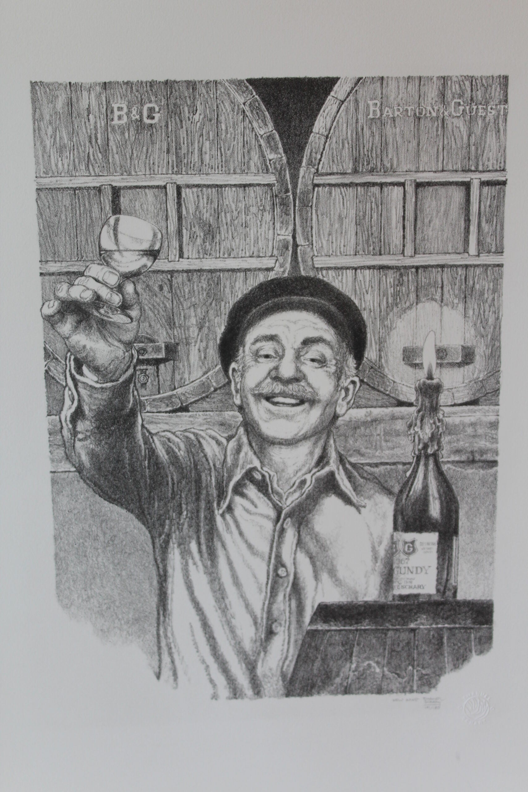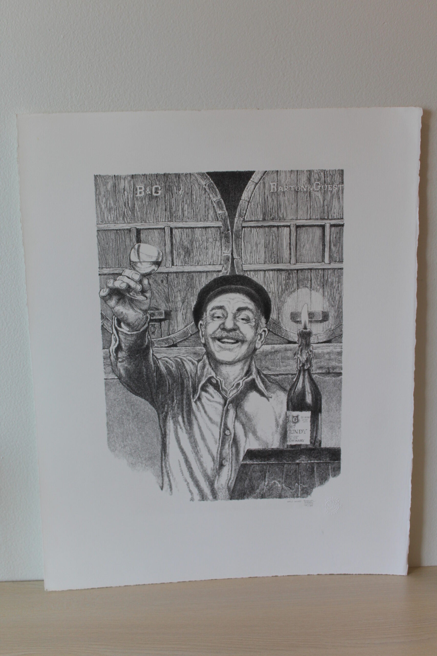 Indulge in the joy of tradition with Emanuel Schary's "New Wine." In this black and white Lithograph, a Jewish man's radiant smile accompanies the ritual of holding a glass of wine, the embodiment of celebration. The scene is infused with cultural richness as a bottle stands by, symbolizing continuity. Own a piece that radiates warmth and tradition, inviting you to savor the spirit of festivity. Size: 10"L x 14"W x "H. Weight is: 3Lb