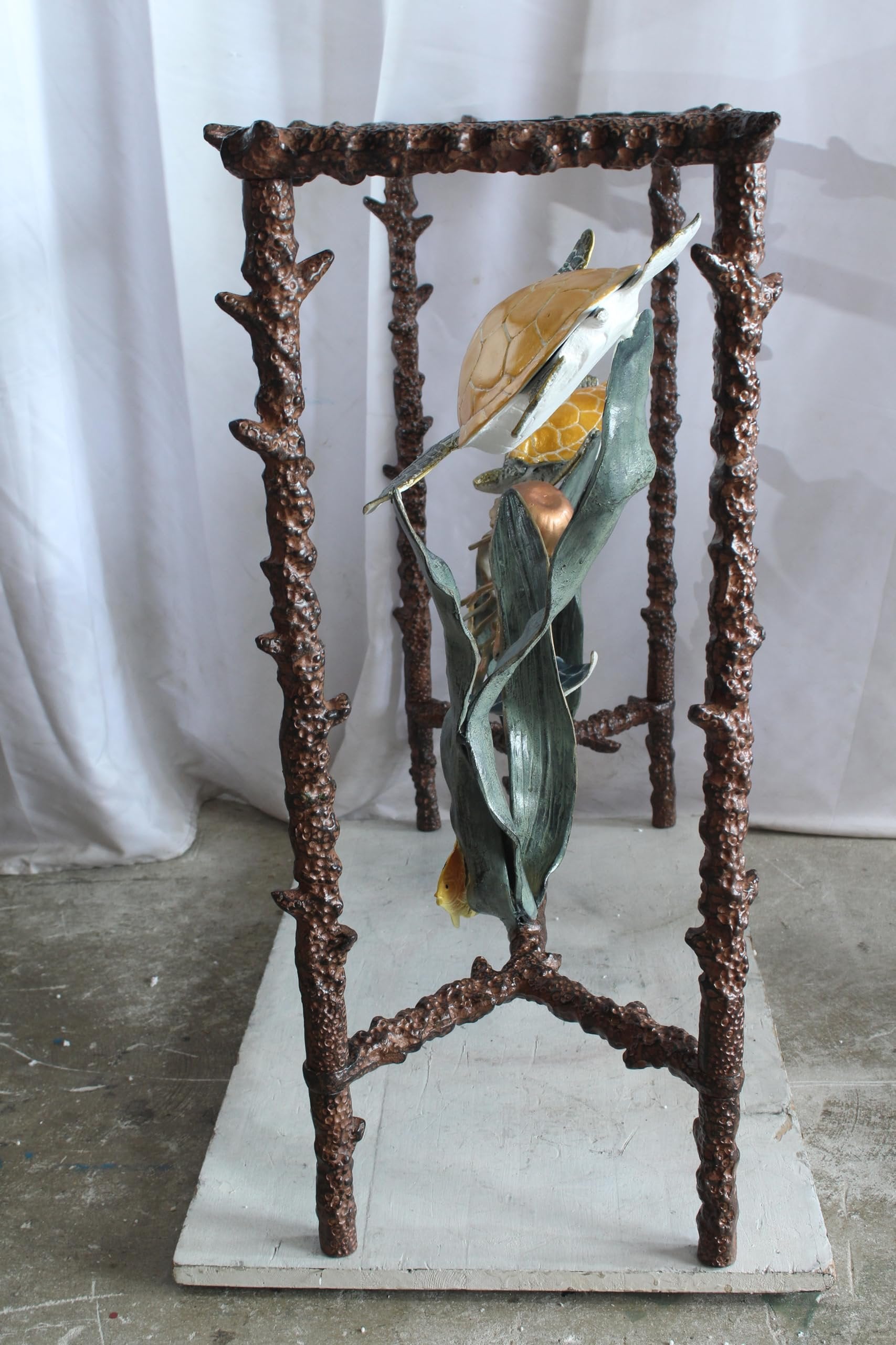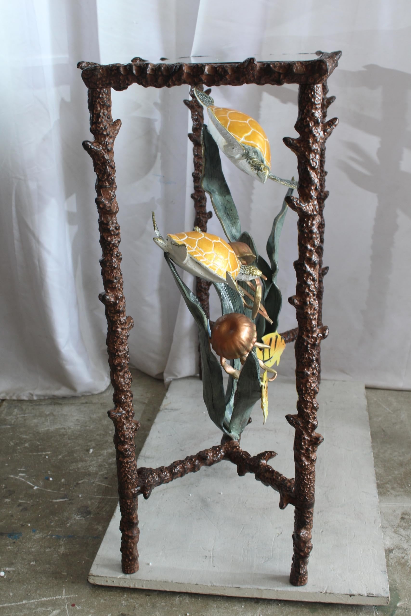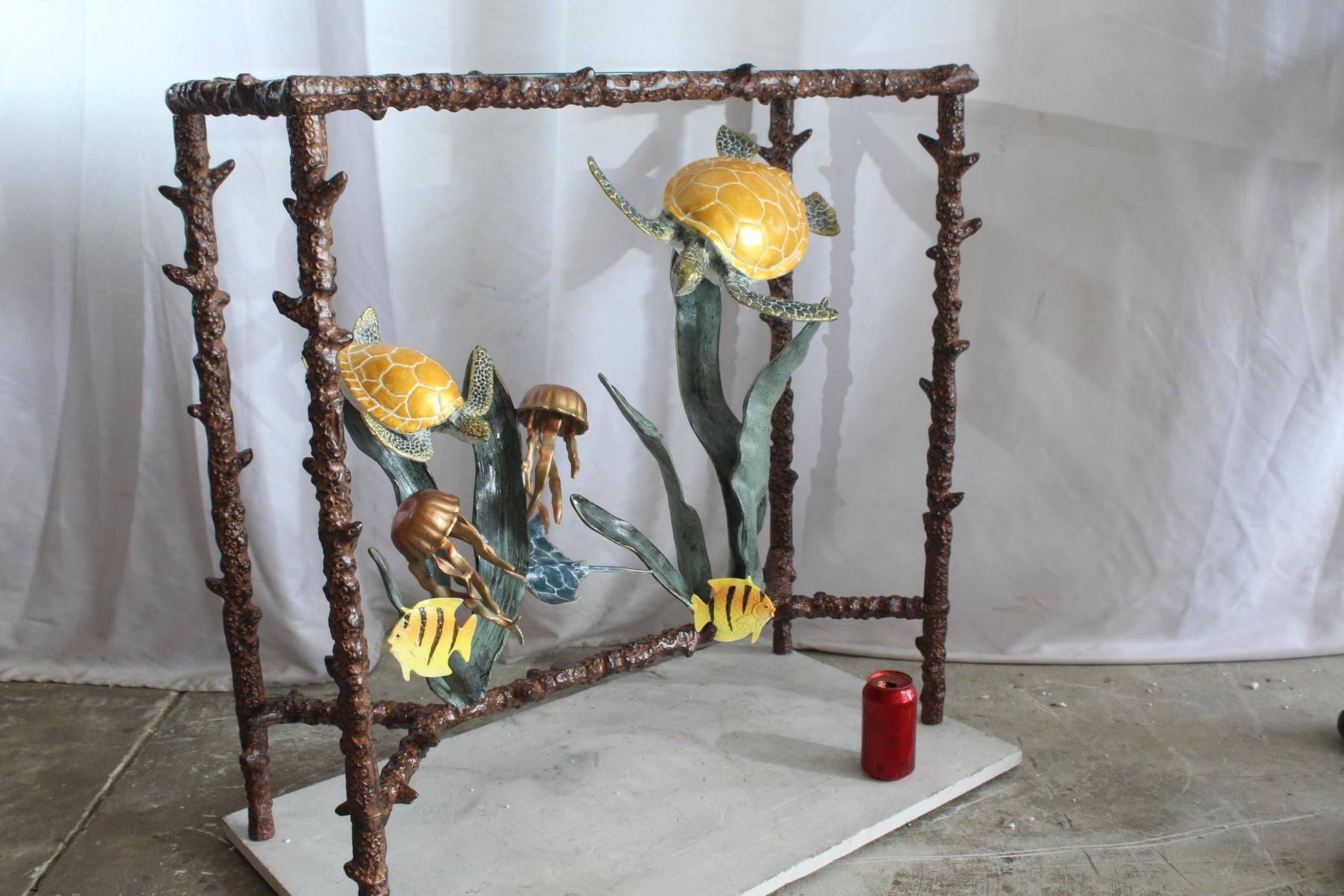 Handcrafted aluminum console table base featuring sea turtles gliding through seagrass with coral textured supports. The sculptural design brings ocean energy to entryways and living spaces while the open frame keeps the look light and airy. Pair with your preferred glass top for a custom finish. Ships well protected and arrives ready to place. Size: 34"L x 15"W x 33"H. Weight: 52LbHandcrafted cast aluminum frame with textured coral like detailsSea turtles and jellyfish motif creates a lively coastal statementSturdy construction ready to support a glass top for console or sofa table34 in x 15 in x 33 in height proportioned for entry or hallway52 lb weight approx with leveling pads for stable placement