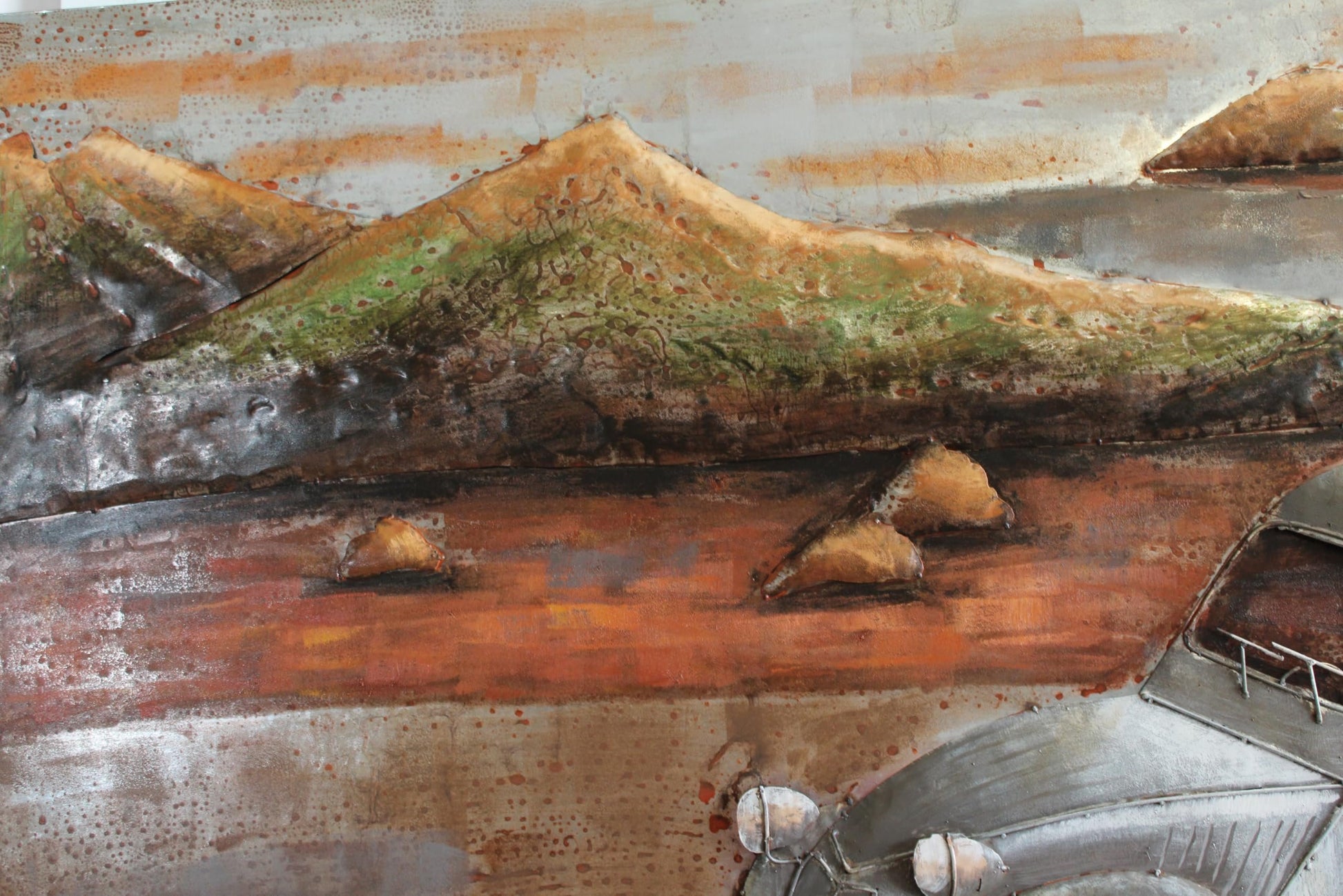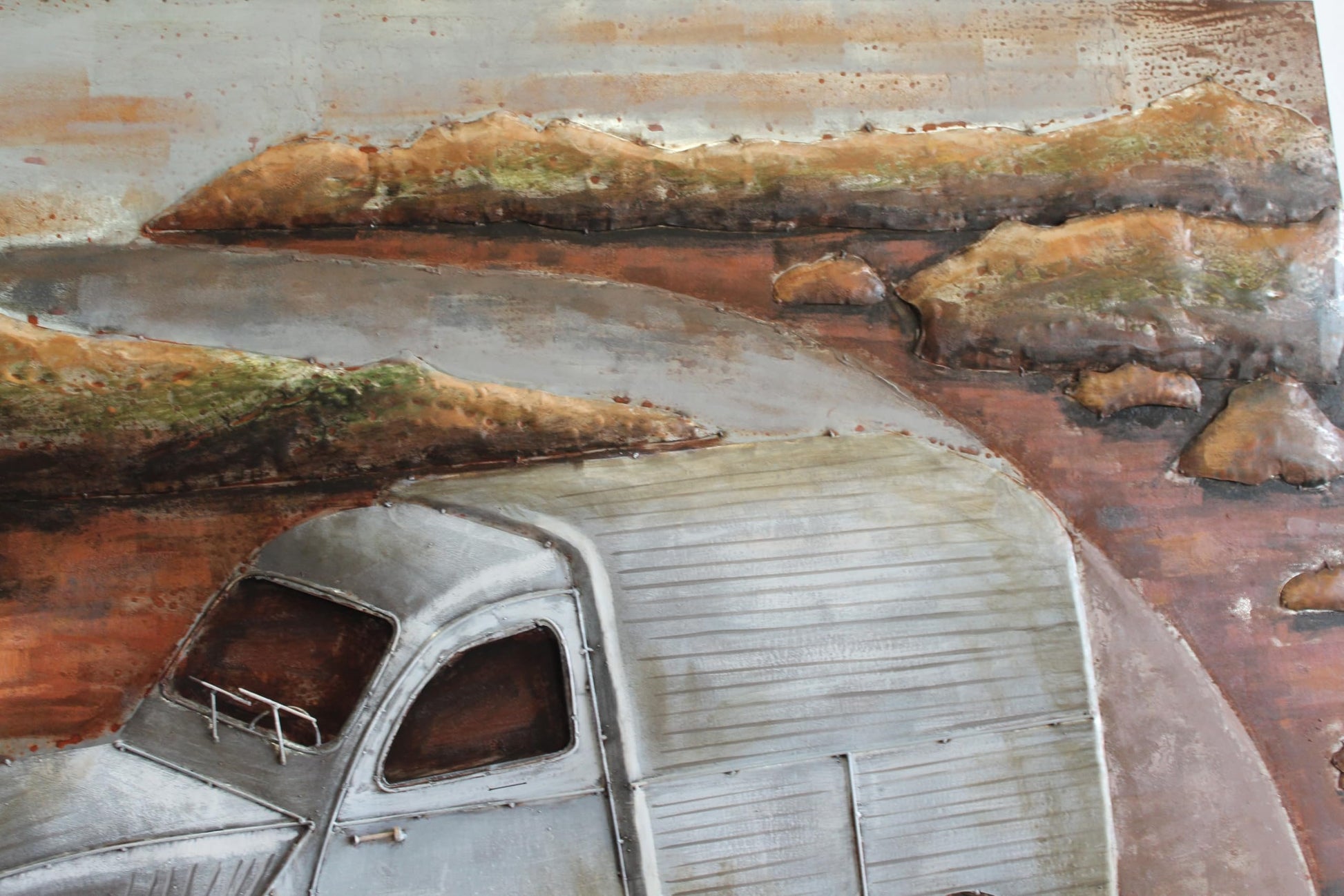 This artwork features a Citroen inspired classic delivery van, designed on a sheet metal base with raised metal parts that create a bold 3D effect. The rustic finish and hand painted details capture the charm of the iconic 2CV style, bringing vintage European character to any room. Perfect for collectors, car enthusiasts, or those who appreciate unique metal wall art with old world appeal. Size: 79"L x 2"W x 40"H. Weight: 30LbCitroen inspired classic delivery van metal wall artSheet metal base with raised metal parts for a bold 3D effectRustic finish with hand painted details evokes vintage European charmUnique statement piece for collectors car enthusiasts and retro interiorsLarge size 79 in x 2 in x 40 in weighing 30 lb