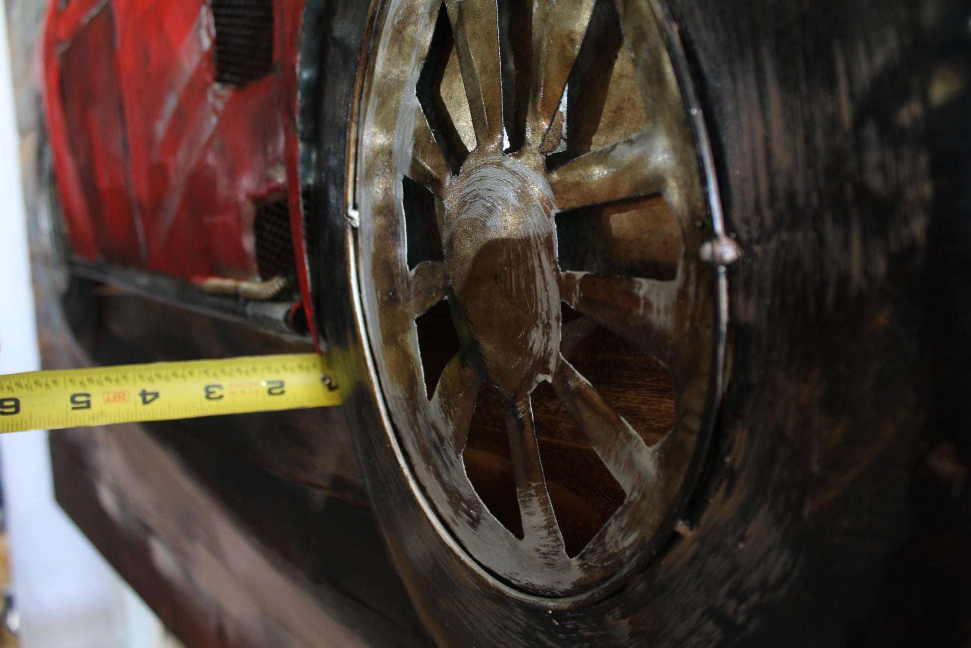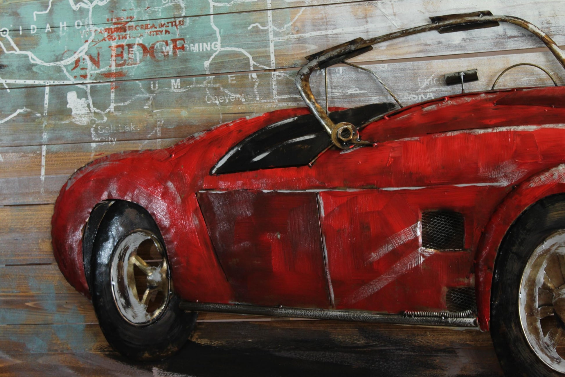 This handcrafted wall art features a classic roadster inspired red sports car, made with sheet metal parts mounted on a wood plank base for a rustic finish. Raised metal details create a striking 3D effect, highlighting the curves and character of the car. Perfect for automotive enthusiasts and collectors, this unique piece adds vintage charm to living rooms, offices, garages, or man caves. Size: 79"L x 2"W x 40"H. Weight: 30LbClassic roadster inspired red sports car wall artSheet metal parts mounted on wood plank base for rustic lookRaised metal details create a striking 3D effectVintage charm for living rooms offices garages or man cavesLarge size 79 in x 2 in x 40 in weighing 30 lb