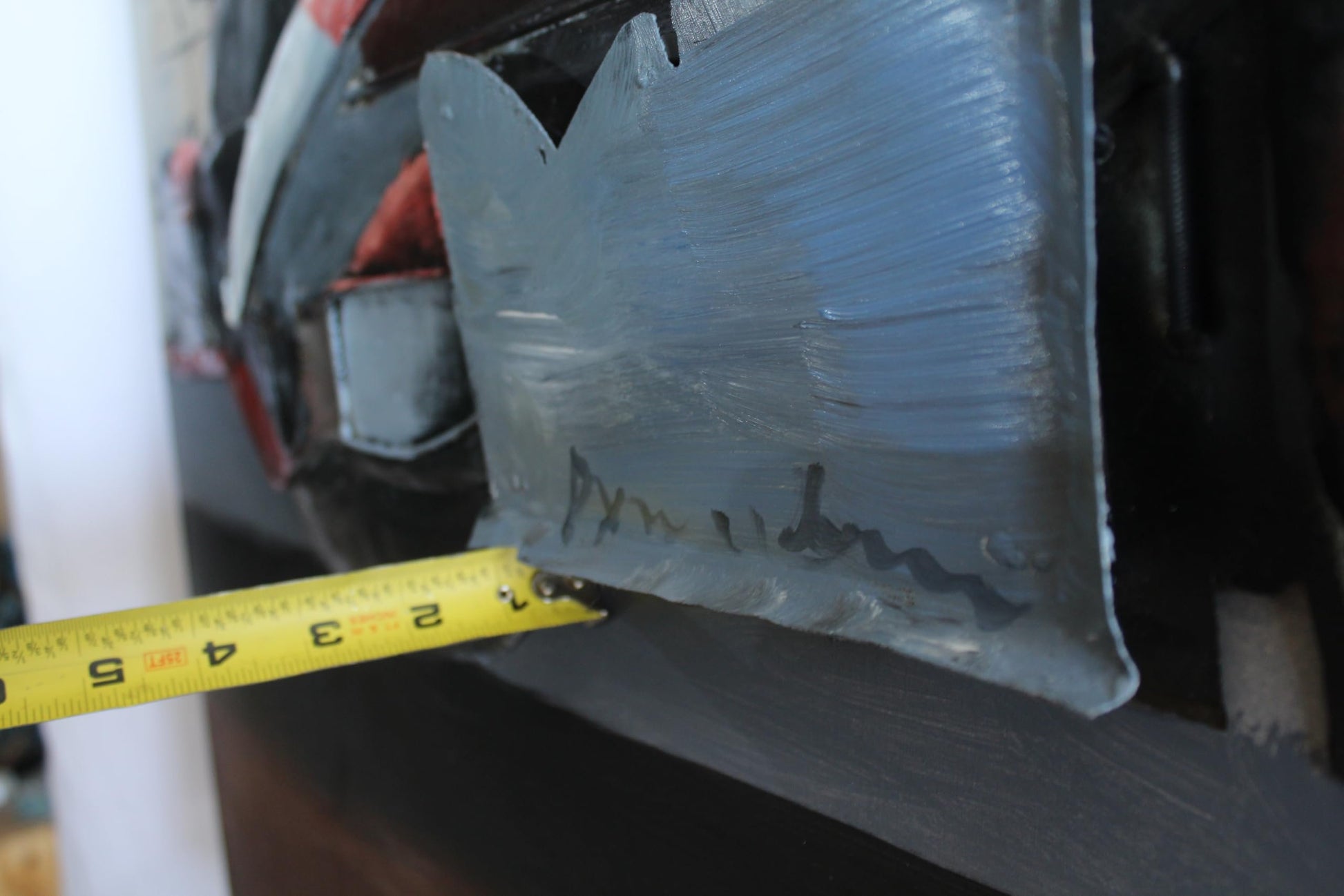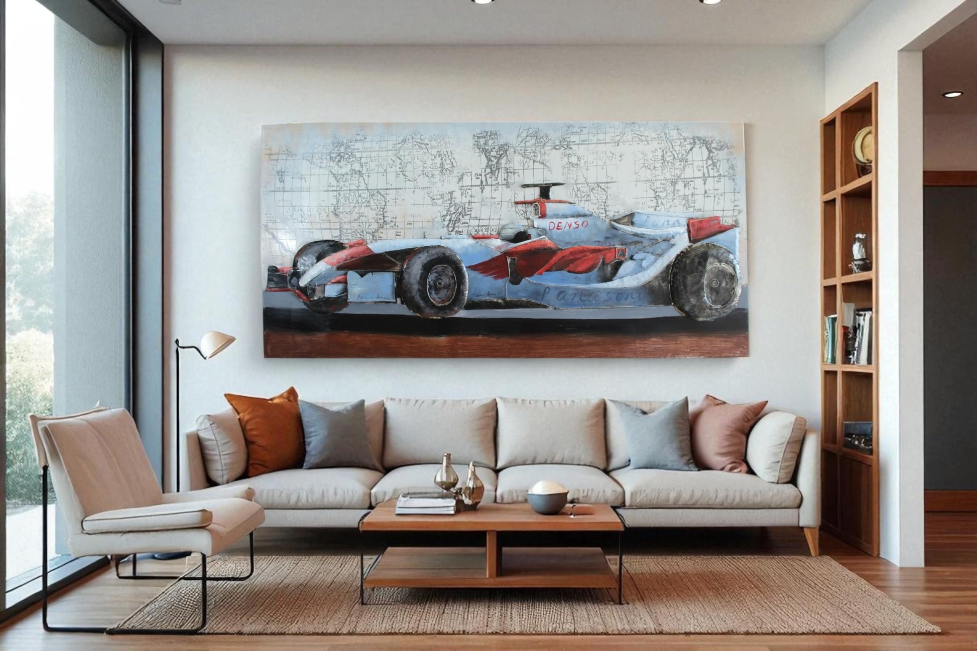 This wall artwork showcases a Formula 1 inspired race car, created on a sheet metal base with raised metal parts that give it a bold 3D effect. The sleek design highlights the aerodynamic body, racing tires, and sponsor-style details, capturing the spirit of high-speed motorsport. Perfect for racing fans and modern interiors, this unique piece blends painting with sculptural metalwork for a dynamic wall statement. Size: 79"L x 2"W x 40"H. Weight: 30LbFormula 1 inspired race car metal wall artSheet metal base with raised metal parts for a bold 3D effectSleek aerodynamic body racing tires and sponsor style detailsDynamic statement piece for racing fans and modern interiorsLarge size 79 in x 2 in x 40 in weighing 30 lb