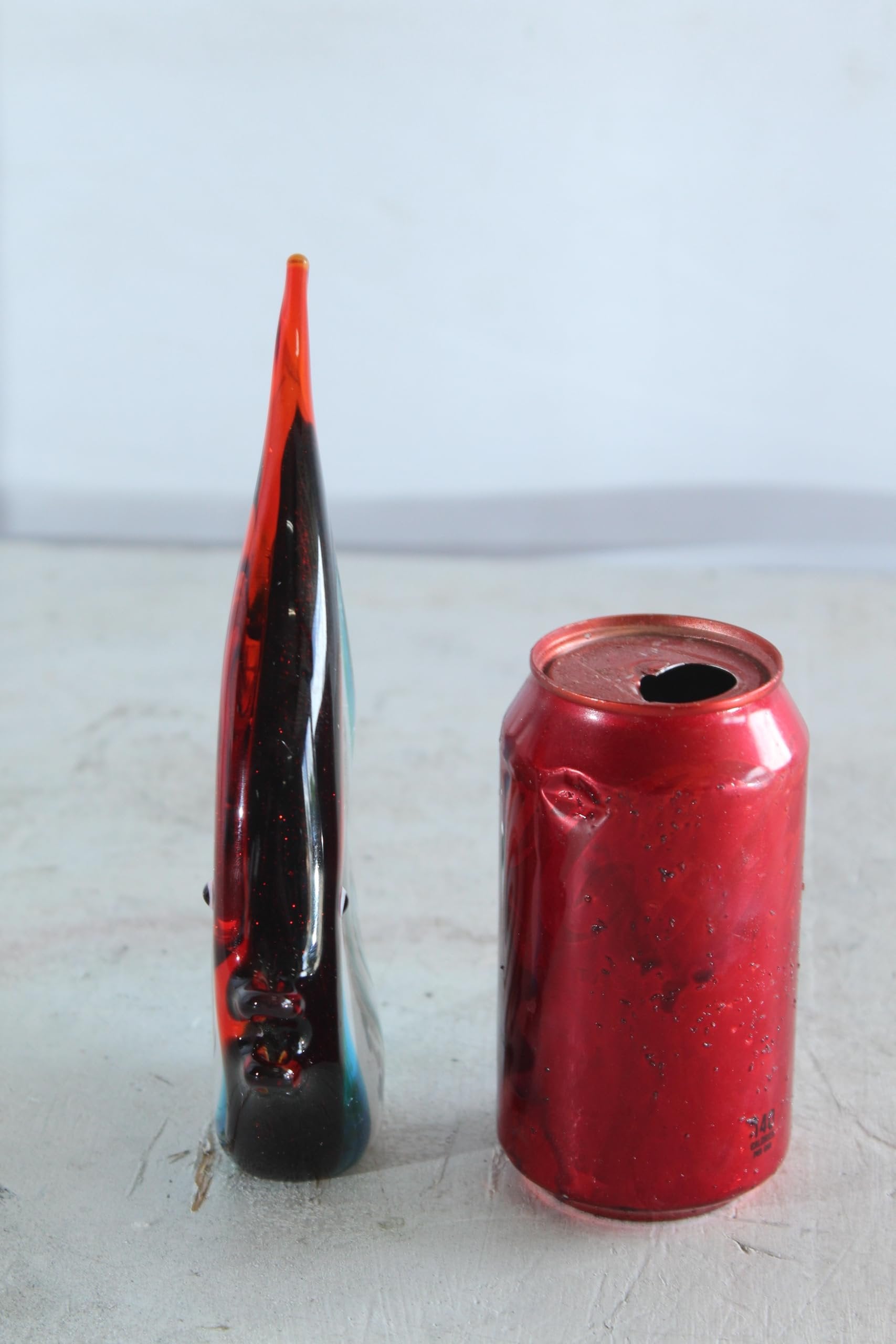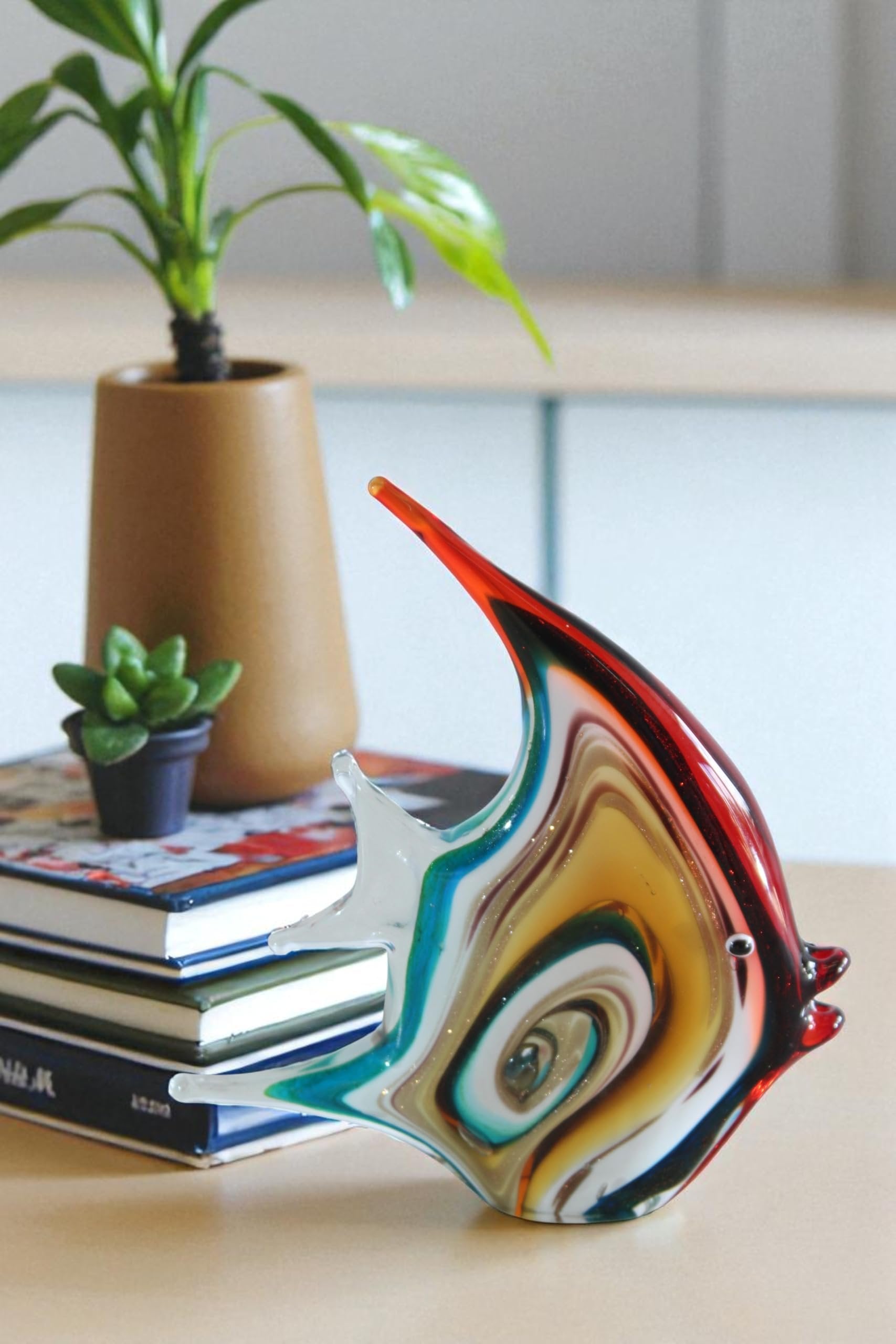 Hand crafted art glass angelfish with dynamic multicolor swirls and clear fins. The sea toned palette and tiny bubbles create depth and movement while the polished surface catches light from every angle. Ideal as a coastal accent for bookshelves consoles or office desks, this compact sculpture adds a bright pop of color. Ships well protected and arrives ready to display. Size: 8"L x 2"W x 9"H. Weight: 1Lb Hand blown art glass with flowing multicolor swirls and clear fins Vibrant coastal palette adds depth shimmer and movement Polished flat base for stable tabletop display 8 in x 2 in x 9 in height compact size for shelf desk or console 1 lb weight approx with protective pads ready to display