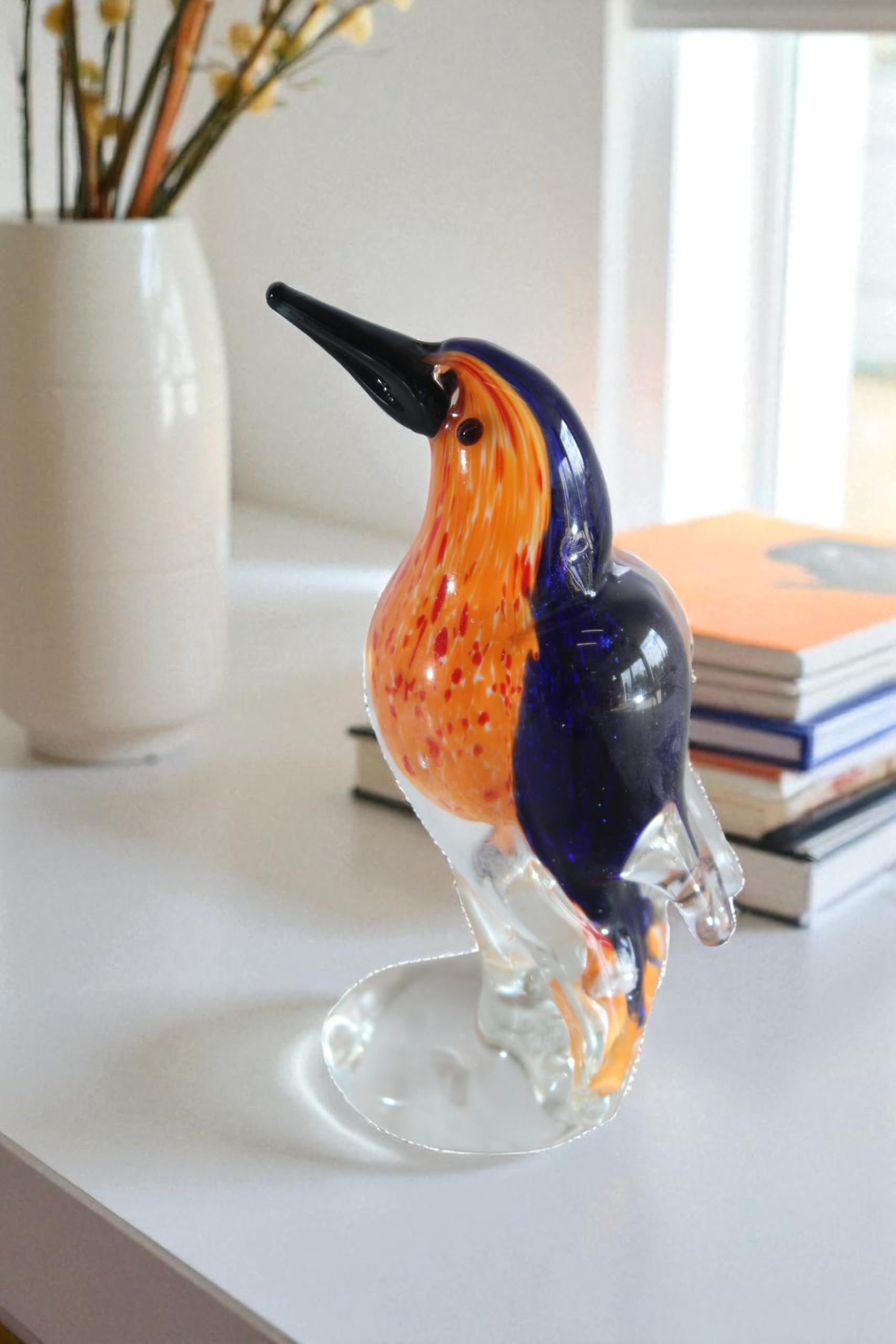 Hand crafted art glass bird in bright coastal hues that catch and reflect the light. The smooth polished finish and graceful form make an eye catching accent for bookshelves consoles or office desks. Each piece is handmade so natural variations in color and pattern make it unique. Ships well protected and arrives ready to display. Size: 4"L x 3"W x 7"H. Weight: 2LbHand blown glass with vibrant orange blue and clear tonesPolished surface with a flat stable base for secure tabletop displaySlender beak and clean contours create an elegant bird silhouette4 in x 3 in x 7 in height compact accent for shelf desk or mantel2 lb weight approx for a substantial quality feel