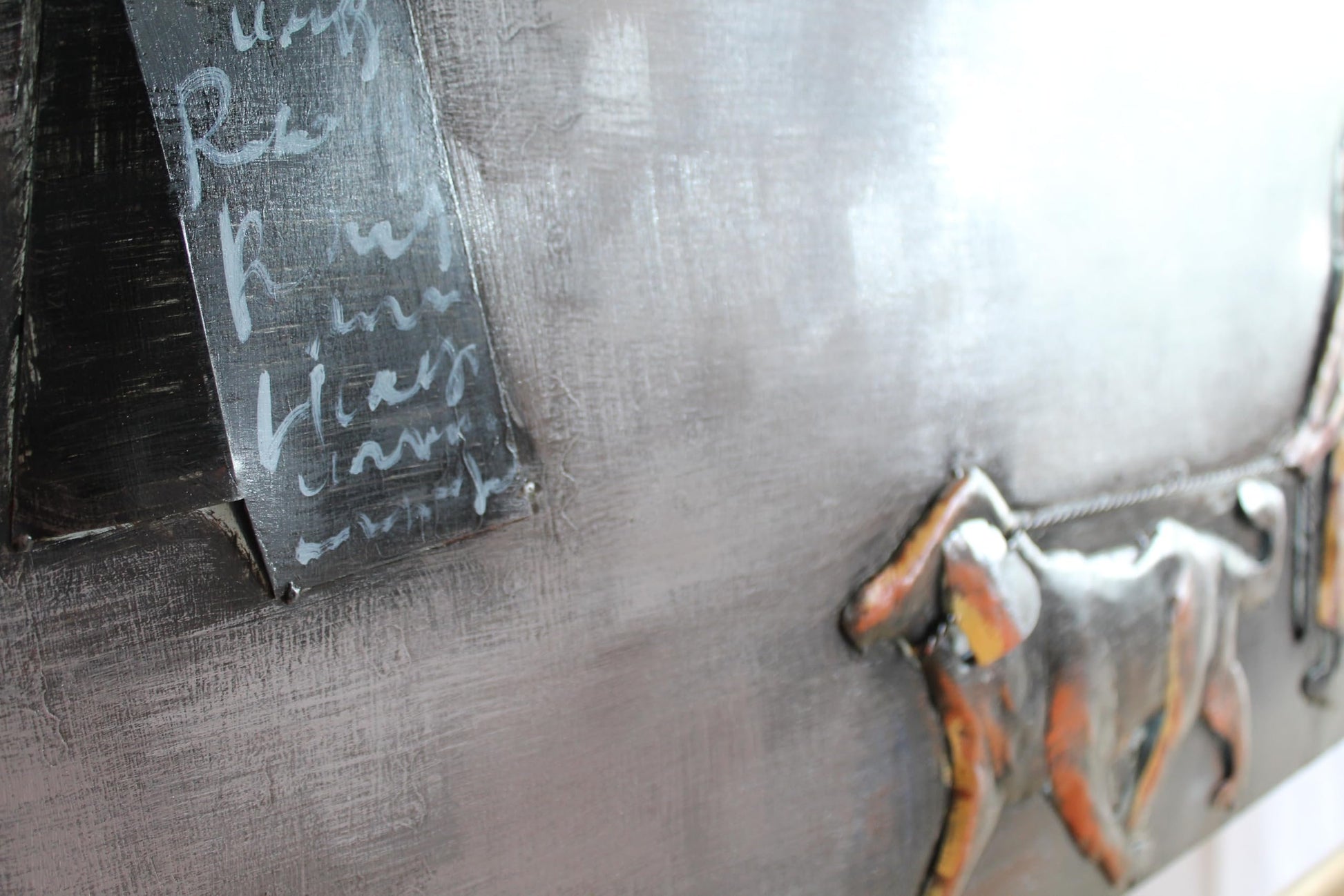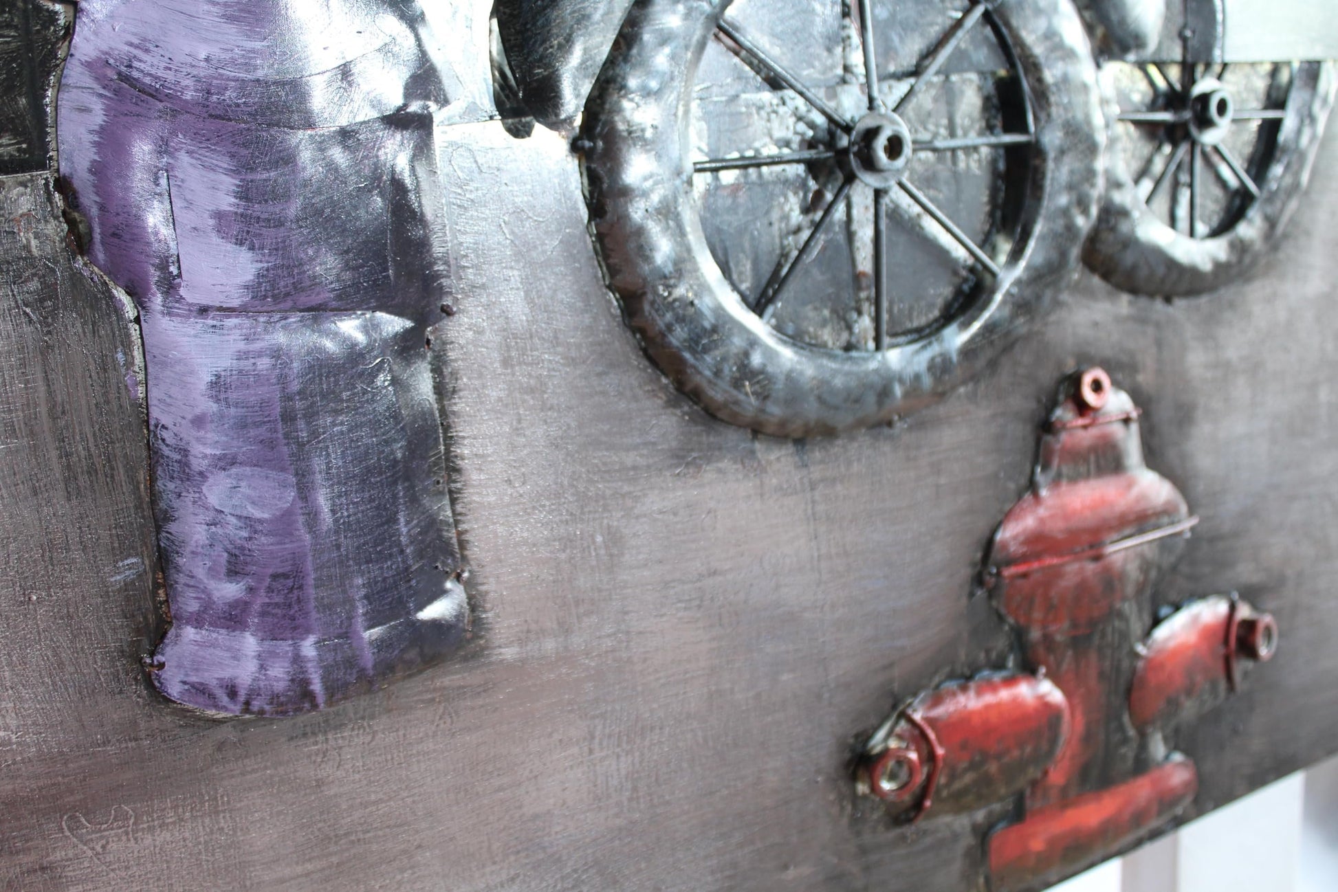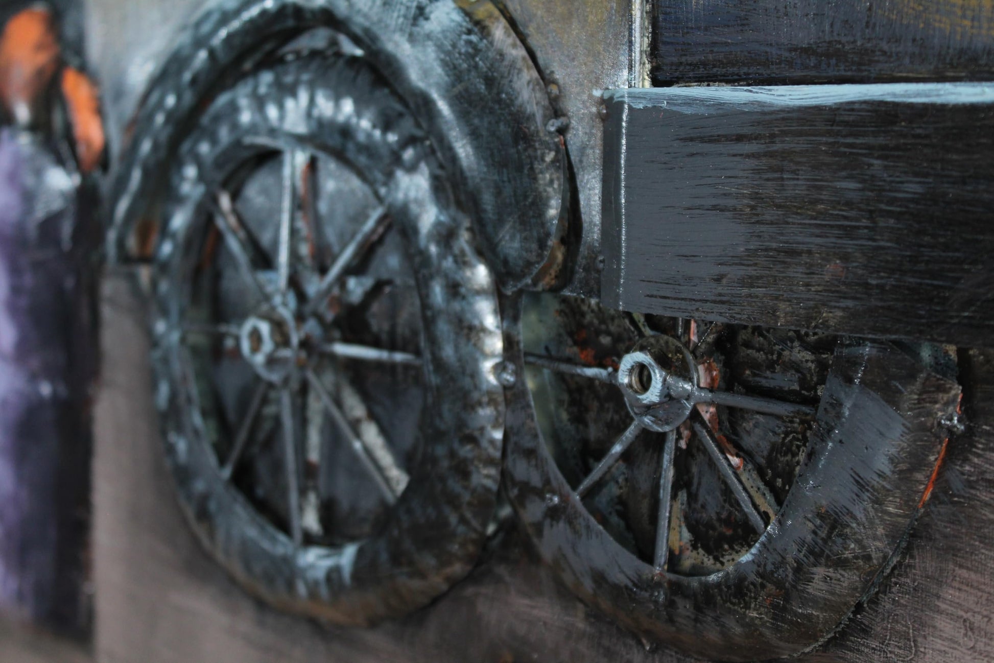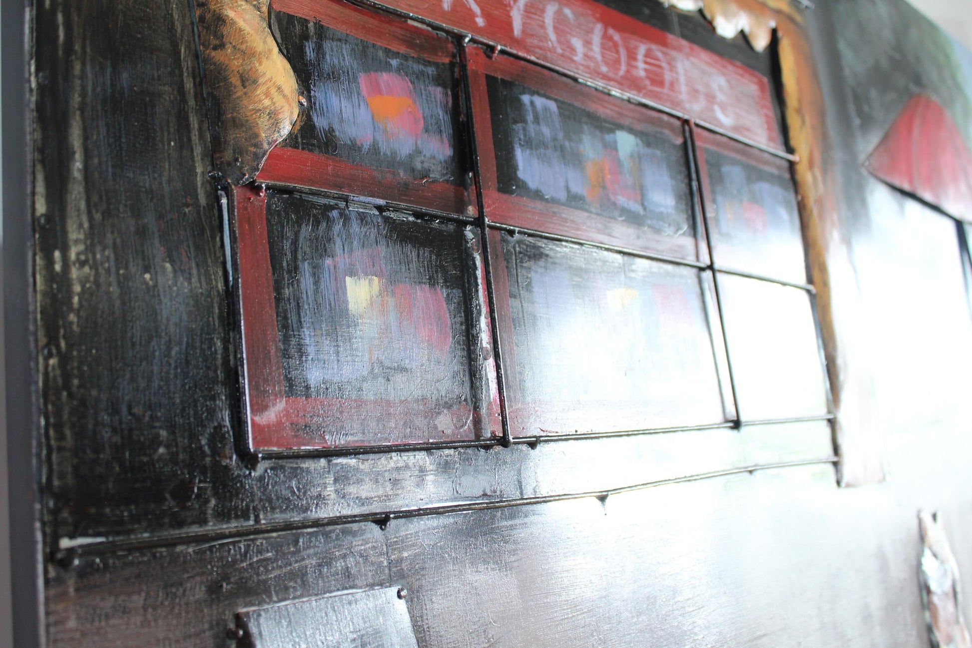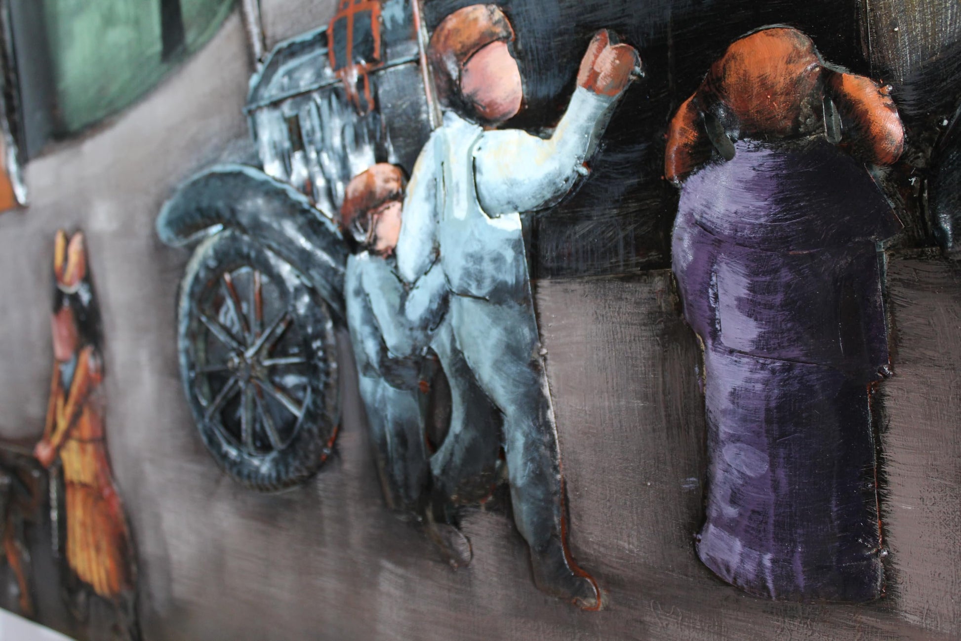 This handmade wall art is crafted from sheet metal with raised metal details, creating a unique dimensional effect. The vintage street scene features figures, a classic car, and storefronts, all carefully hand painted to highlight texture and depth. The raised sections add a sculptural touch, making this artwork stand out as both a painting and a three dimensional piece. A distinctive decor accent for home or office. Size: 79"L x 39"W x 1"H. Weight: 40LbHandmade sheet metal wall art with raised detailsVintage street scene with figures classic car and storefrontsHand painted finish highlighting texture and depthSculptural relief creates a dimensional statement for home or officeSize 79L x 39W x 1H weight 40 lb