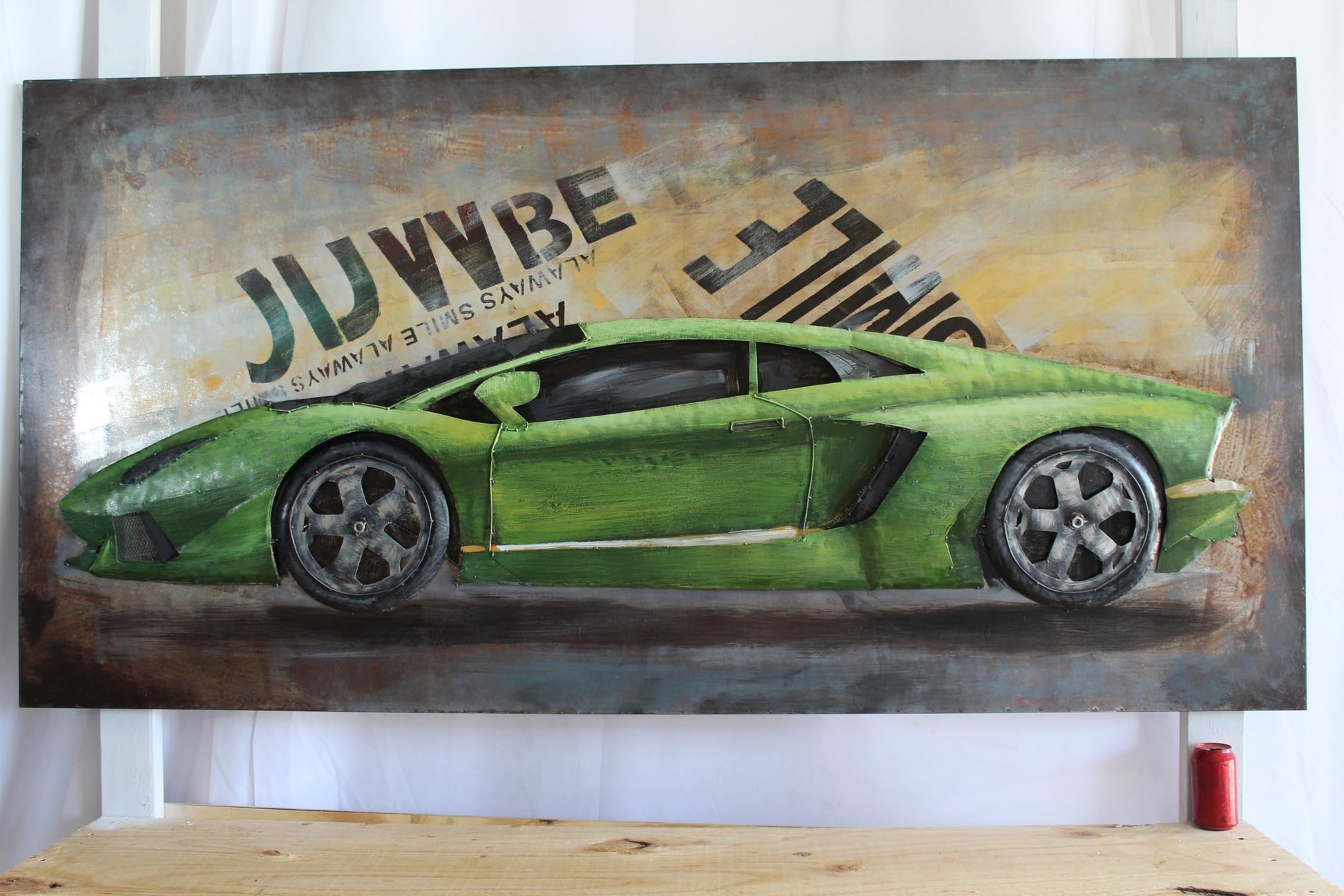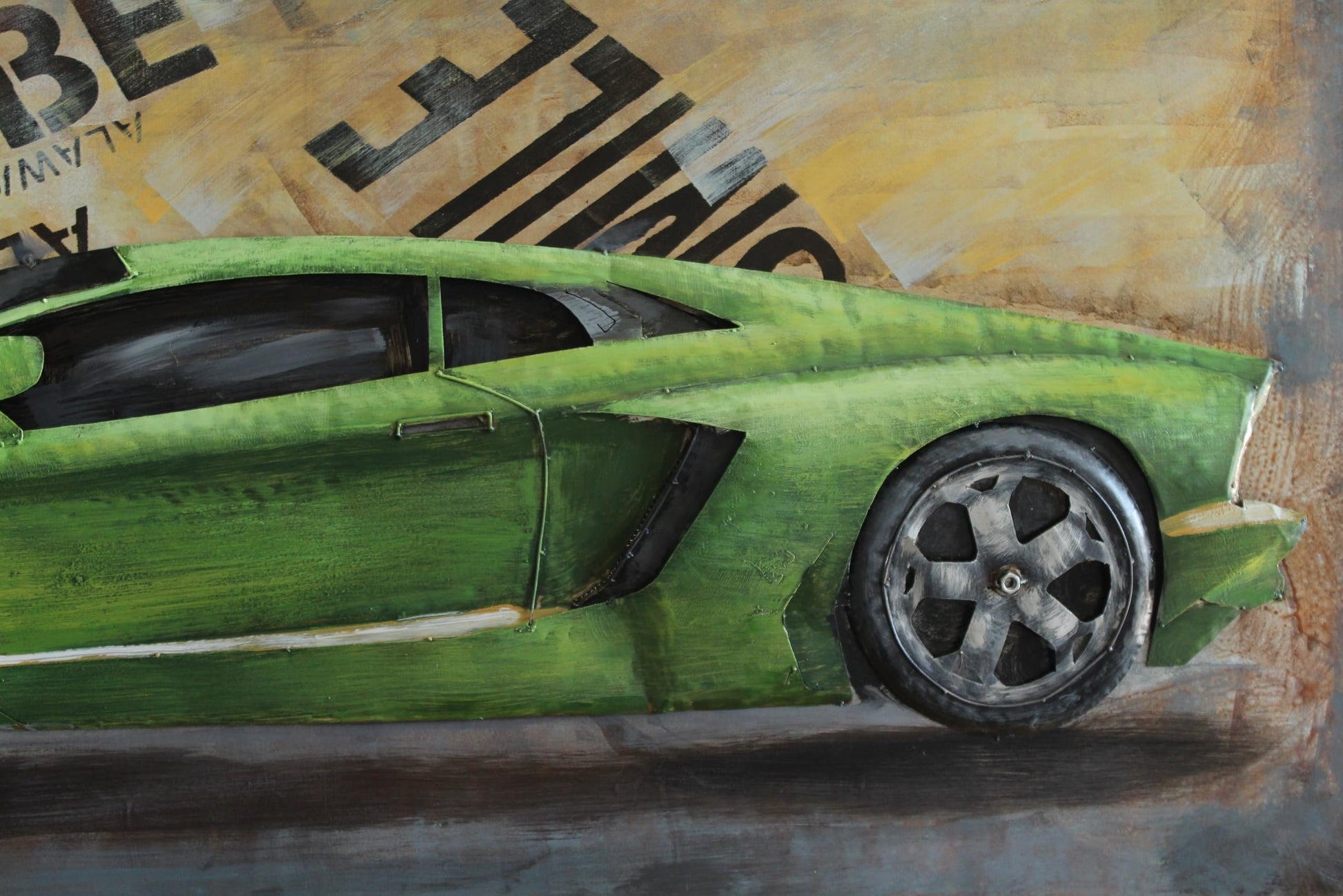 This handcrafted wall artwork features a Lamborghini inspired green supercar, created on a sheet metal base with raised metal parts for an impressive 3D effect. The bold design highlights sharp lines, sleek bodywork, and metallic textures, capturing the essence of exotic performance cars. Perfect for automotive enthusiasts and modern interiors, this piece blends painting with sculptural metalwork for a unique wall statement. Size: 79"L x 2"W x 40"H. Weight: 30LbLamborghini inspired green supercar metal wall artSheet metal base with raised metal parts for a 3D effectSharp lines sleek bodywork and metallic texturesModern statement piece for automotive enthusiasts and interiorsLarge size 79 in x 2 in x 40 in weighing 30 lb