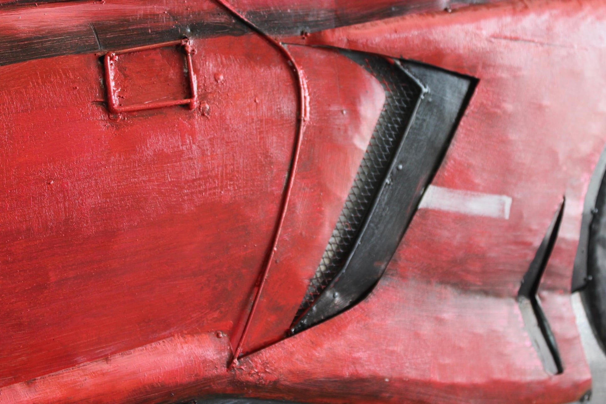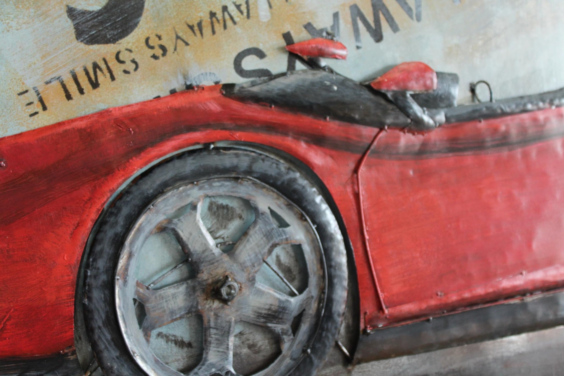 This bold artwork showcases a Lamborghini inspired red convertible supercar, crafted entirely from metal with raised details for a striking 3D look. The dynamic design highlights the car’s sleek lines, vents, and wheels, bringing out the aggressive styling of exotic performance cars. Perfect for car enthusiasts and modern interiors, this piece blends painting and sculptural metalwork into a unique wall statement. Size: 79"L x 2"W x 40"H. Weight: 30LbLamborghini inspired red convertible metal wall artRaised metal details create a striking 3D effectSleek lines vents and wheels emphasize exotic stylingModern statement piece for car enthusiasts and interiorsLarge size 79 in x 2 in x 40 in weighing 30 lb