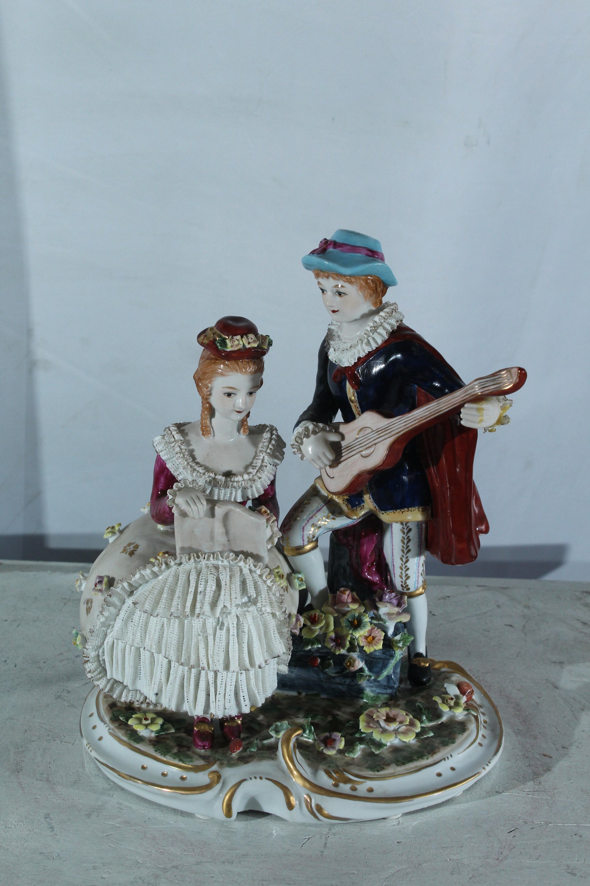Elegant porcelain figurine of a courting couple. A gentleman plays the guitar while the lady reads on an ornate base with floral details. Glossy finish adds a romantic accent to living room office or bedroom decor. A thoughtful pick for music lovers and figurine collectors. Size: 11"L x 8"W x 13"H. Weight: 6Lb Material porcelain Subject gentleman with guitar and lady with book Classic European styling with floral base Size L W H 11 x 8 x 13 in Weight 6 lb Ready to display giftable decor