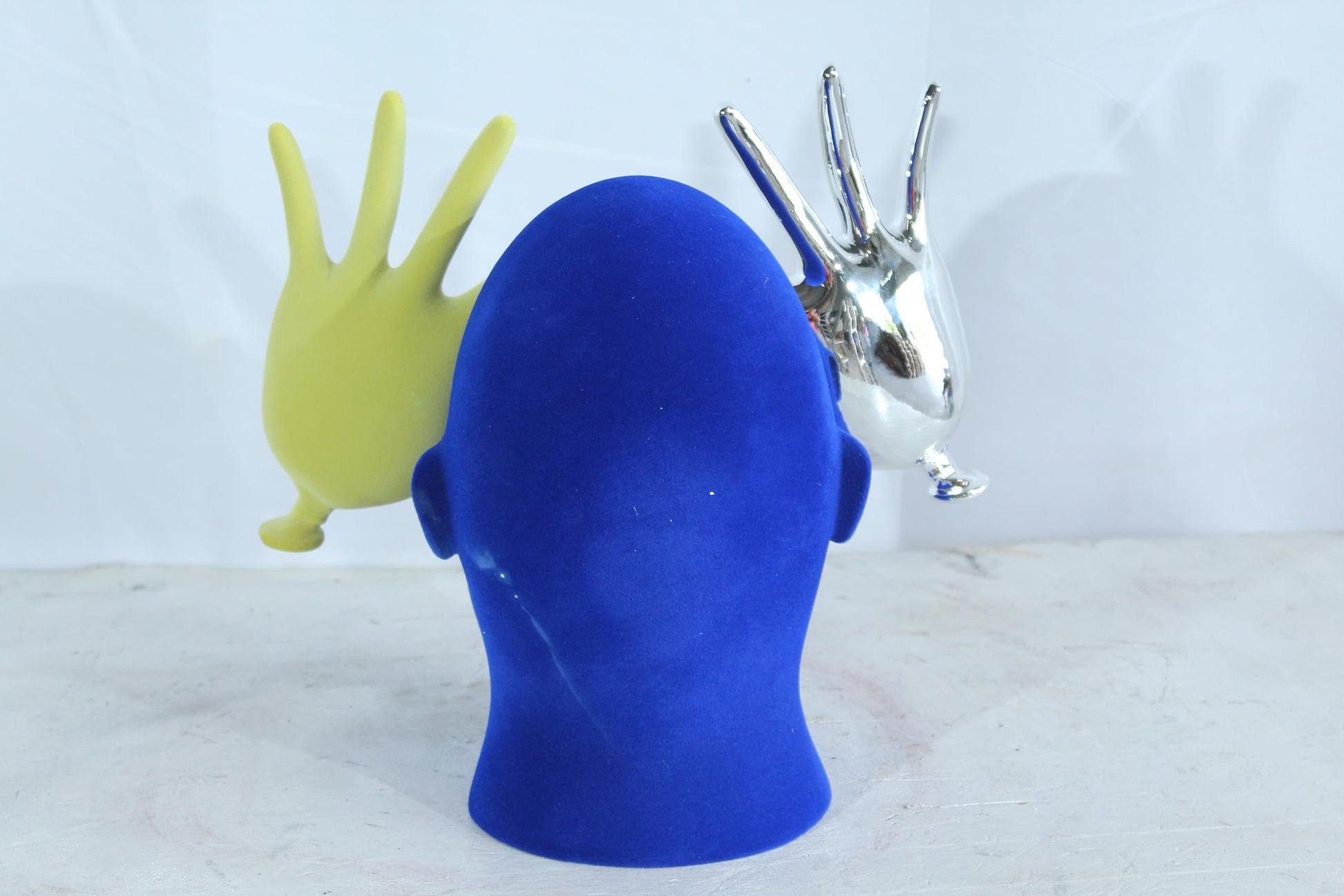 This abstract resin statue features a striking blue velvet covered head with surreal hand shaped accents in blue and yellow velvet. The bold design blends texture and color to create a unique contemporary art piece that draws attention in any setting. Crafted with smooth resin and soft velvet finish, it adds a playful modern edge to living rooms offices or galleries. A perfect choice for collectors and lovers of creative decor. Size: 12"L x 8"W x 12"H. Weight: 5LbAbstract resin statue with surreal blue velvet head and hand shaped accentsBold contemporary design blending texture and colorSmooth resin with soft velvet finish for modern edgeIdeal for living rooms offices galleries or collectors12 in x 8 in x 12 in 5 lb