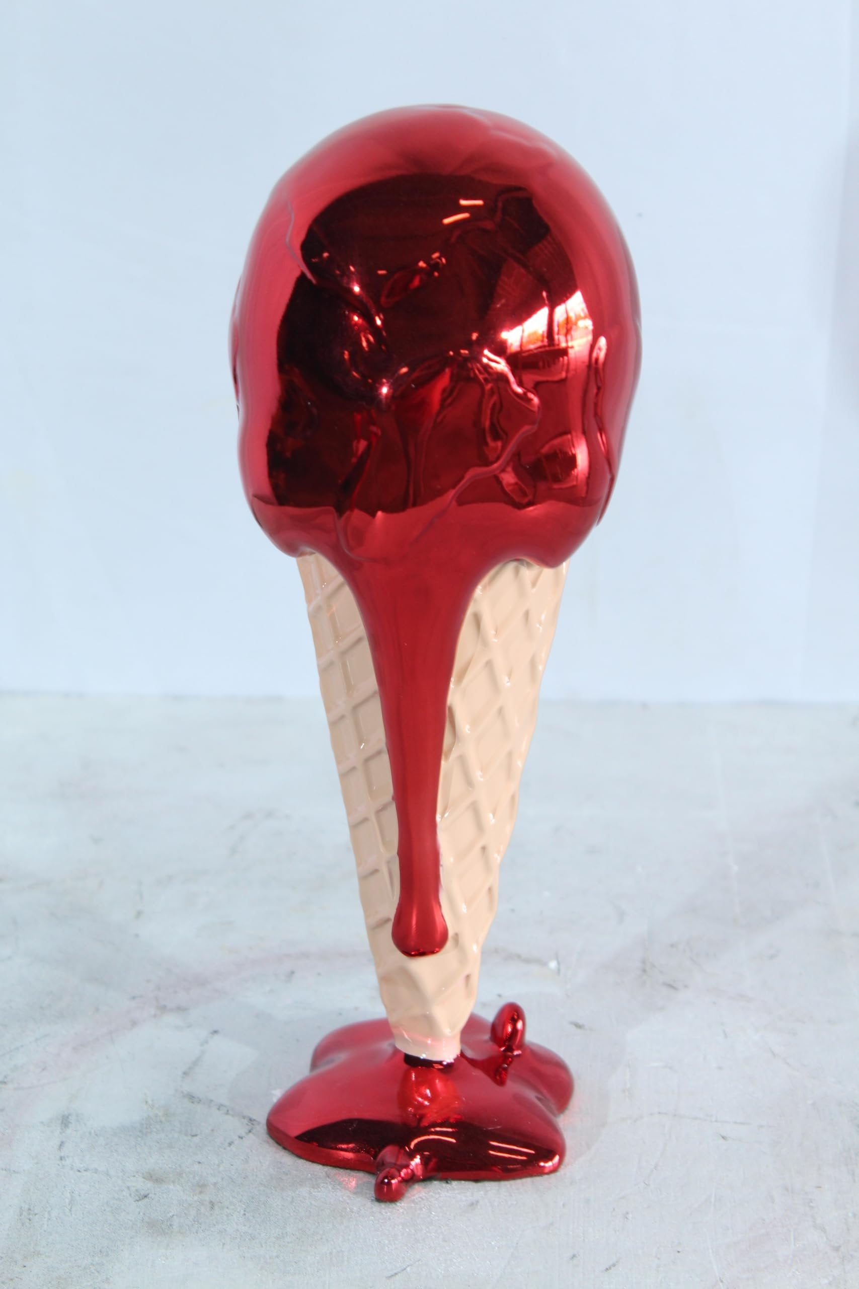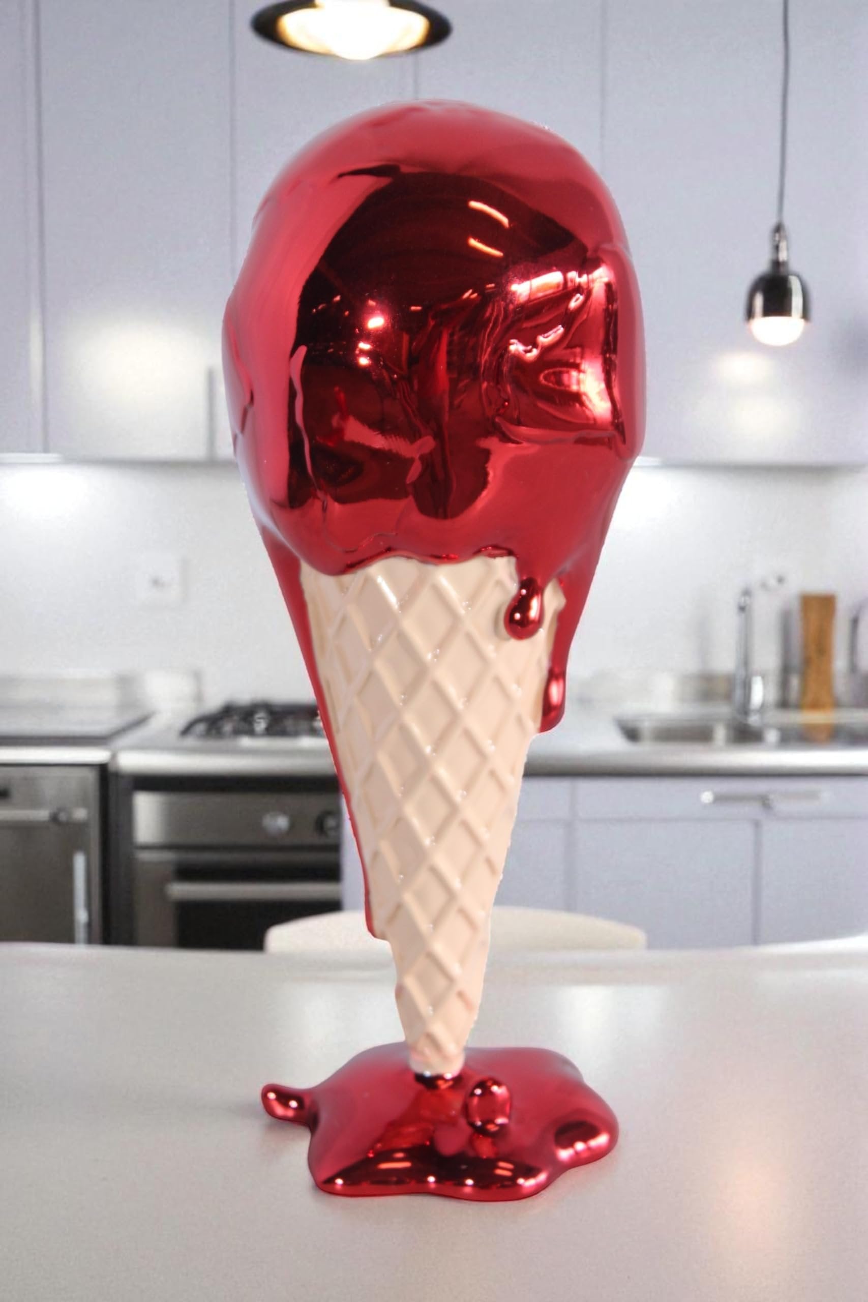 This resin ice cream cone statue features a bold metallic red scoop melting over a textured cone with drips pooling at the base. Designed in a pop art style, it brings playful energy and modern flair to any room. The glossy finish captures light beautifully, making it a unique accent for kitchens, living spaces, or offices. A fun and vibrant decorative piece that appeals to art lovers and collectors of contemporary design. Size: 5"L x 5"W x 14"H. Weight: 2LbPop art resin ice cream cone with metallic red scoop and melting dripsTextured cone and glossy finish add modern playful styleLight catching surface adds vibrant accent to kitchen living room or officeDurable resin construction for long lasting displaySize 5L x 5W x 14H weight 2 lb