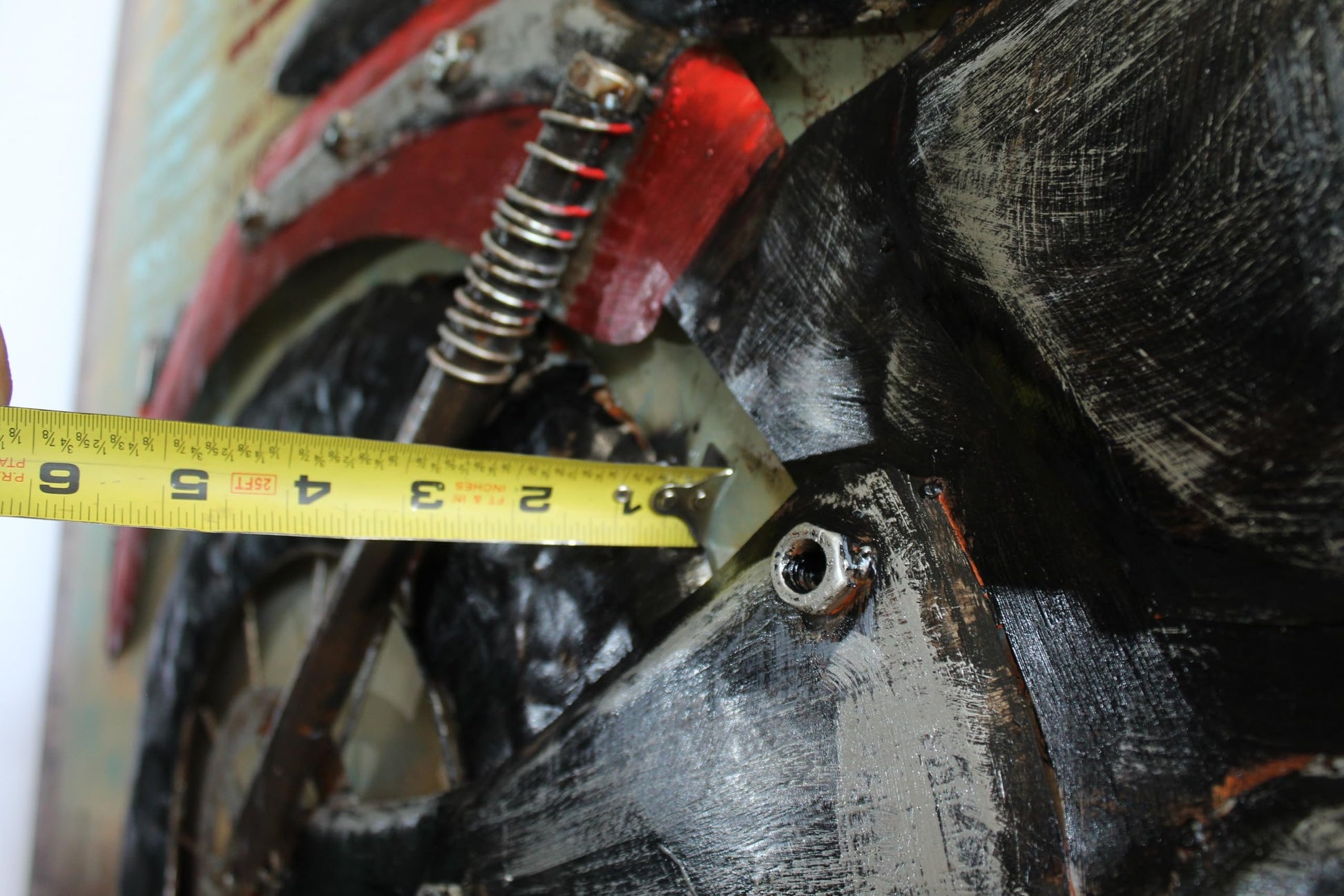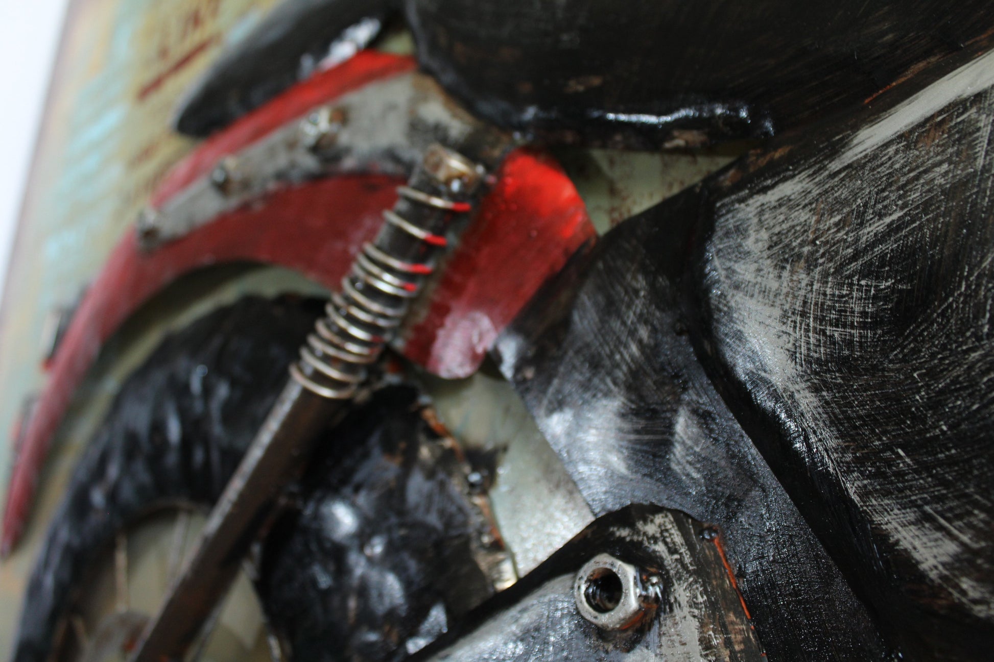 This artwork showcases a Triumph inspired classic motorcycle, crafted on a sheet metal base with raised metal parts that create a bold 3D effect. The hand painted details and metallic textures highlight the iconic cruiser design, making it a striking piece of wall decor. Perfect for motorcycle enthusiasts and collectors, this unique artwork blends painting and sculptural metalwork for a powerful statement. Size: 79"L x 2"W x 40"H. Weight: 30LbTriumph inspired classic motorcycle metal wall artSheet metal base with raised metal parts for a bold 3D effectHand painted details and metallic textures highlight cruiser designStriking statement piece for motorcycle enthusLarge size 79 in x 2 in x 40 in weighing 30 lb