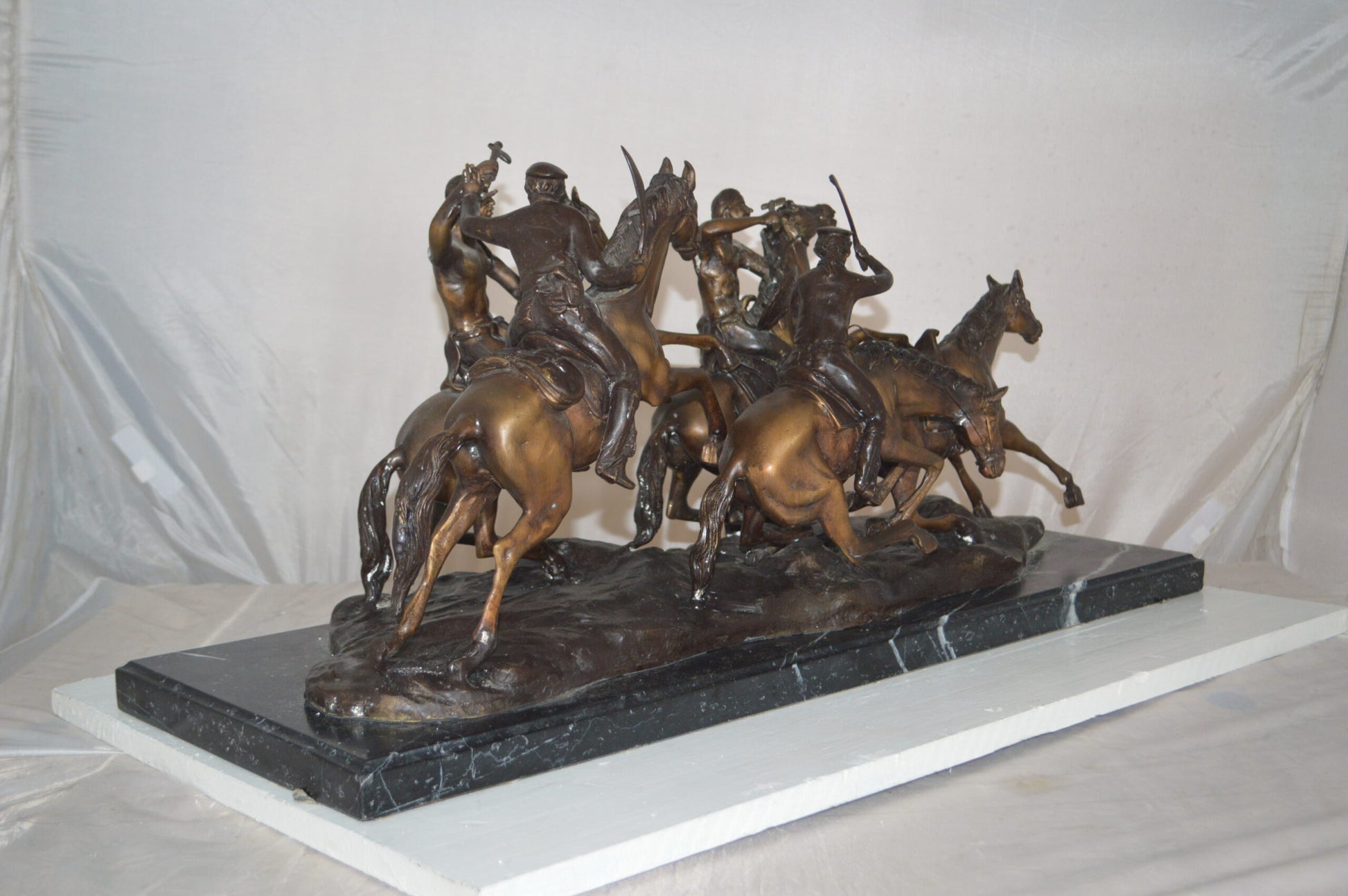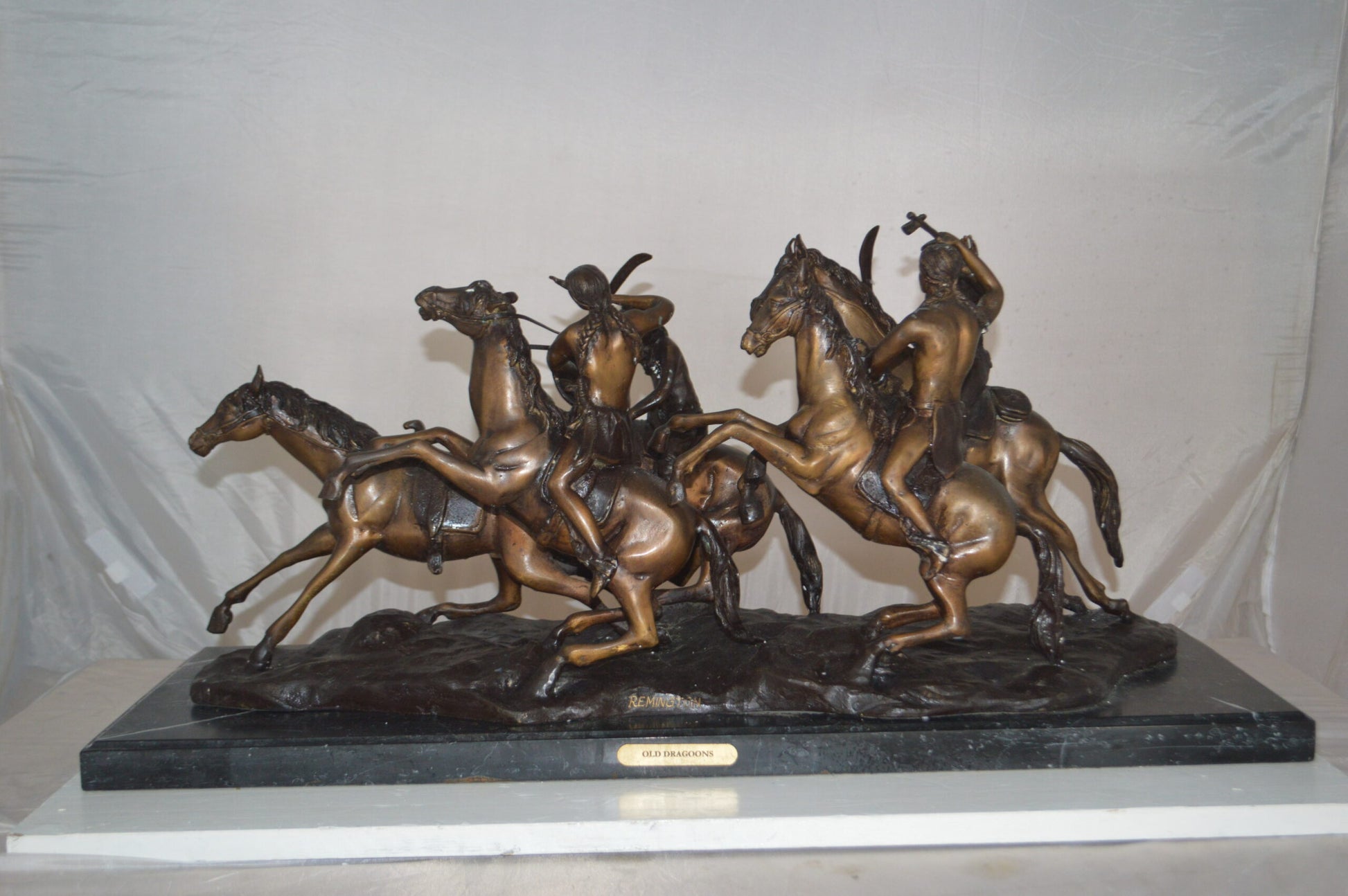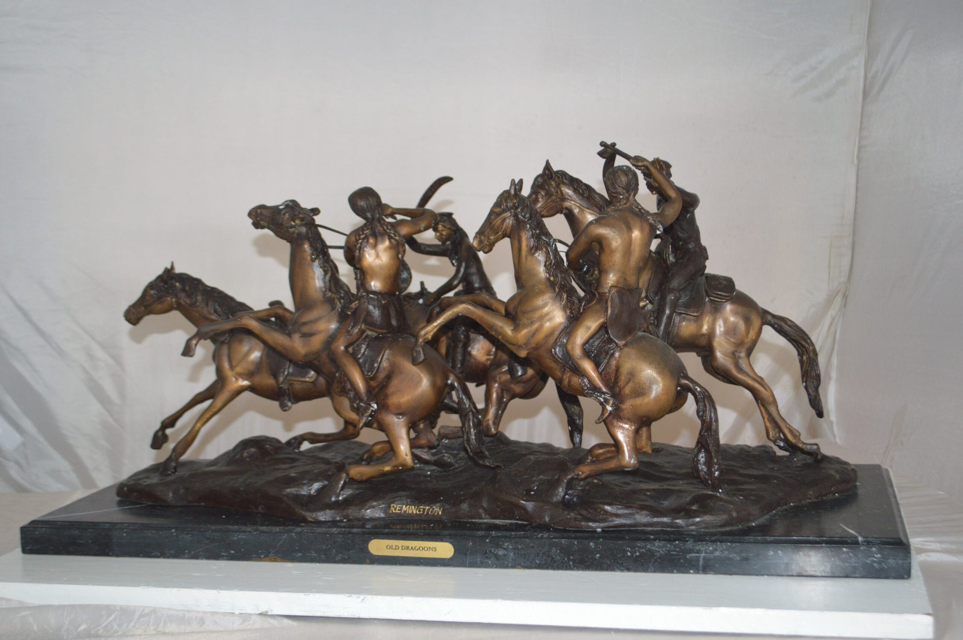 The Old Dragoons of 1850 replica, is a Remington ambitious sculpture which includes five horses and four riders: two American cavalrymen, from the United States Regiment of Dragoons, and two Plains Indians. The Dragoons, who patrolled the land west of the Mississippi River, have closed in on the fleeing Indians, and the men are locked in hand-to-hand combat. While the soldiers’ uniforms, rifles, and accoutrements are historically correct for 1850, Remington’s Indians are closer in type to those he had known in the West in the 1880s and 1890s. Cast in the lost-wax technique mounted on a marble base, the Old Dragons statue is sharply delineated with a rich variety of textures, from the fringed buckskin garment to the animals hairy coat to the rocklike base. Size: 32"L x 12"W x 13"H. Weight is: 93Lb