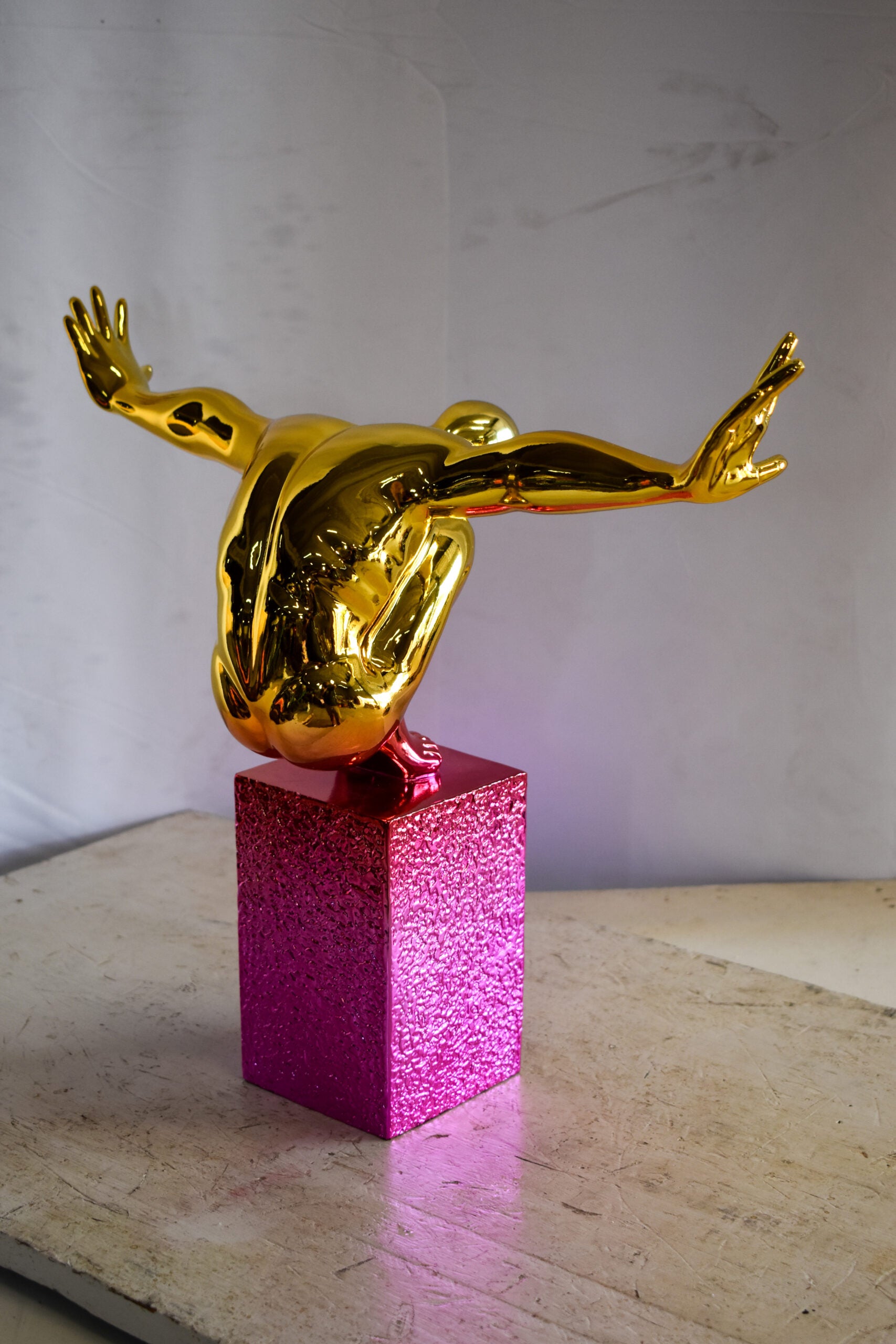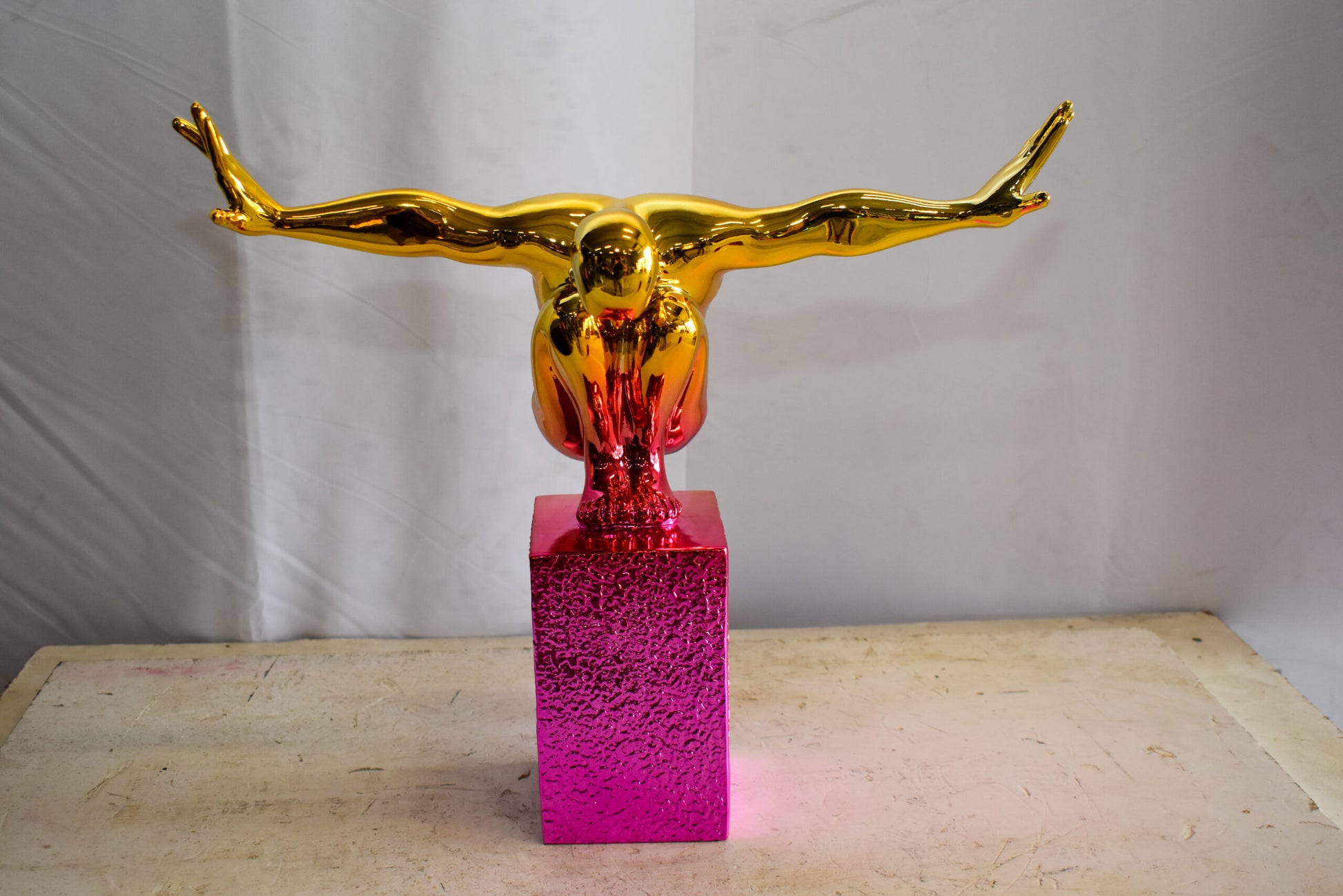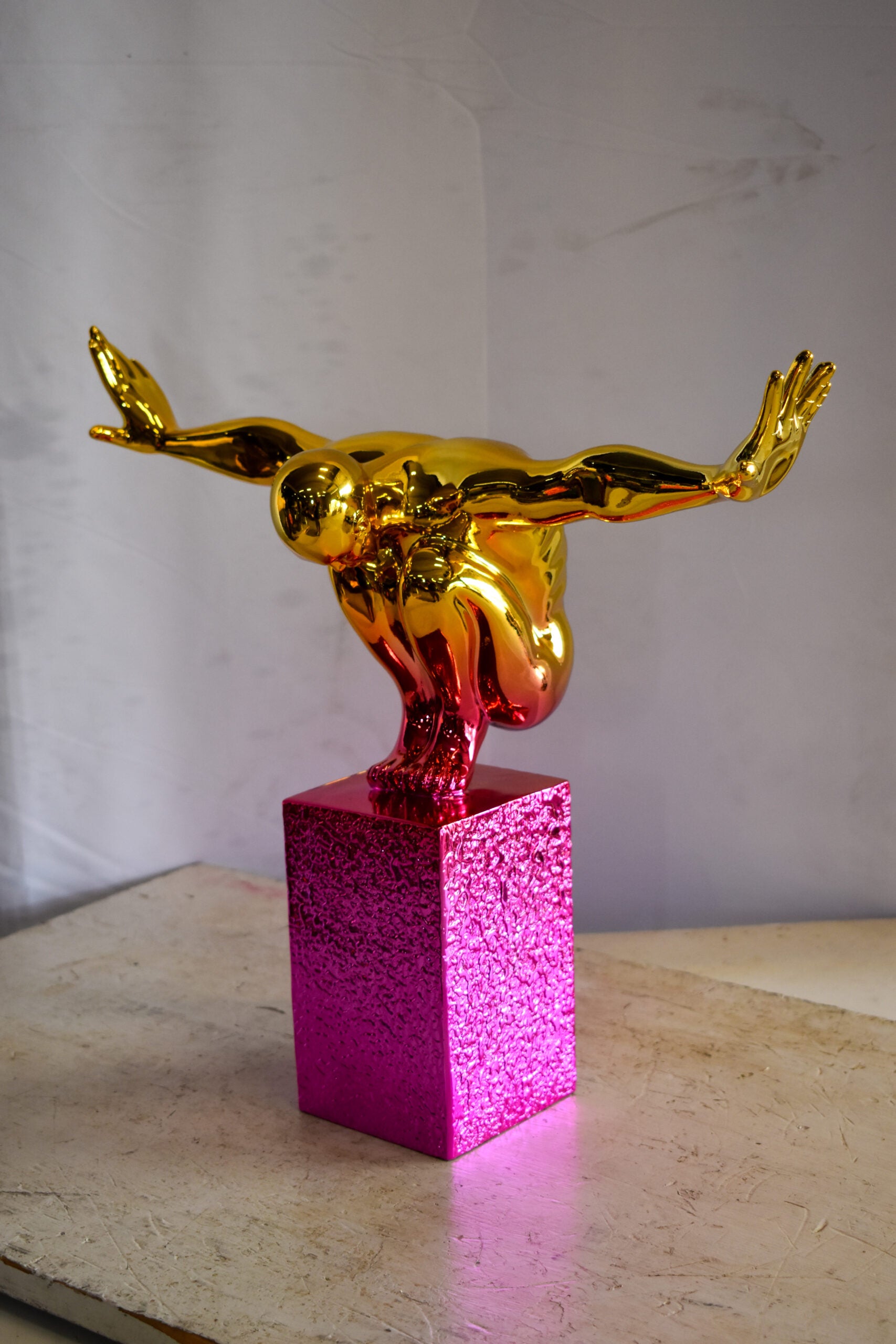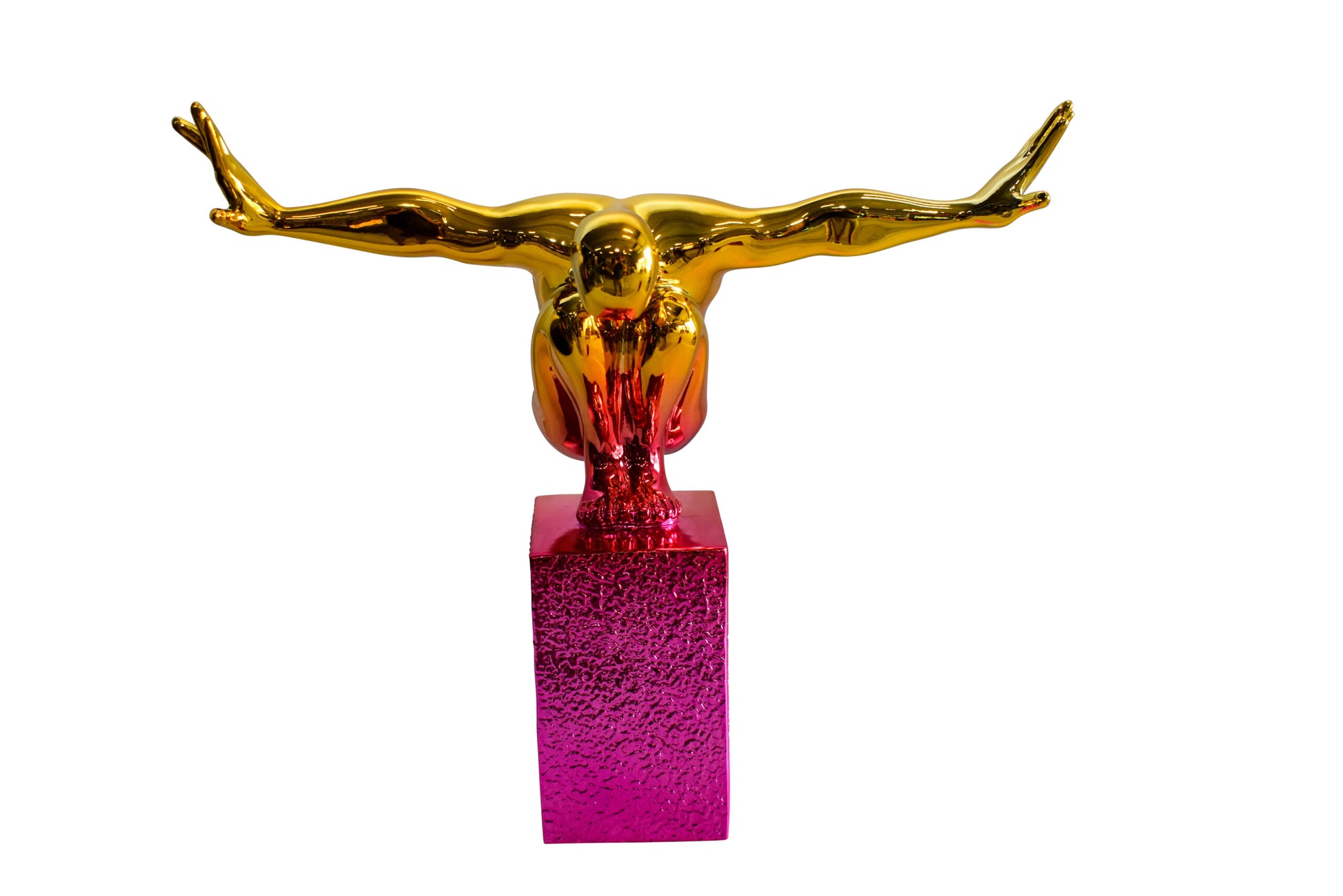 This unique statue poses an Olympian swimmer in a confident stance. With a textured bold pink chrome base, and a gold olympian on top, it will be sure to draw attention and bring artistic beauty to any room. Size: 20"L x 8"W x 17"H. Weight is: 8Lb