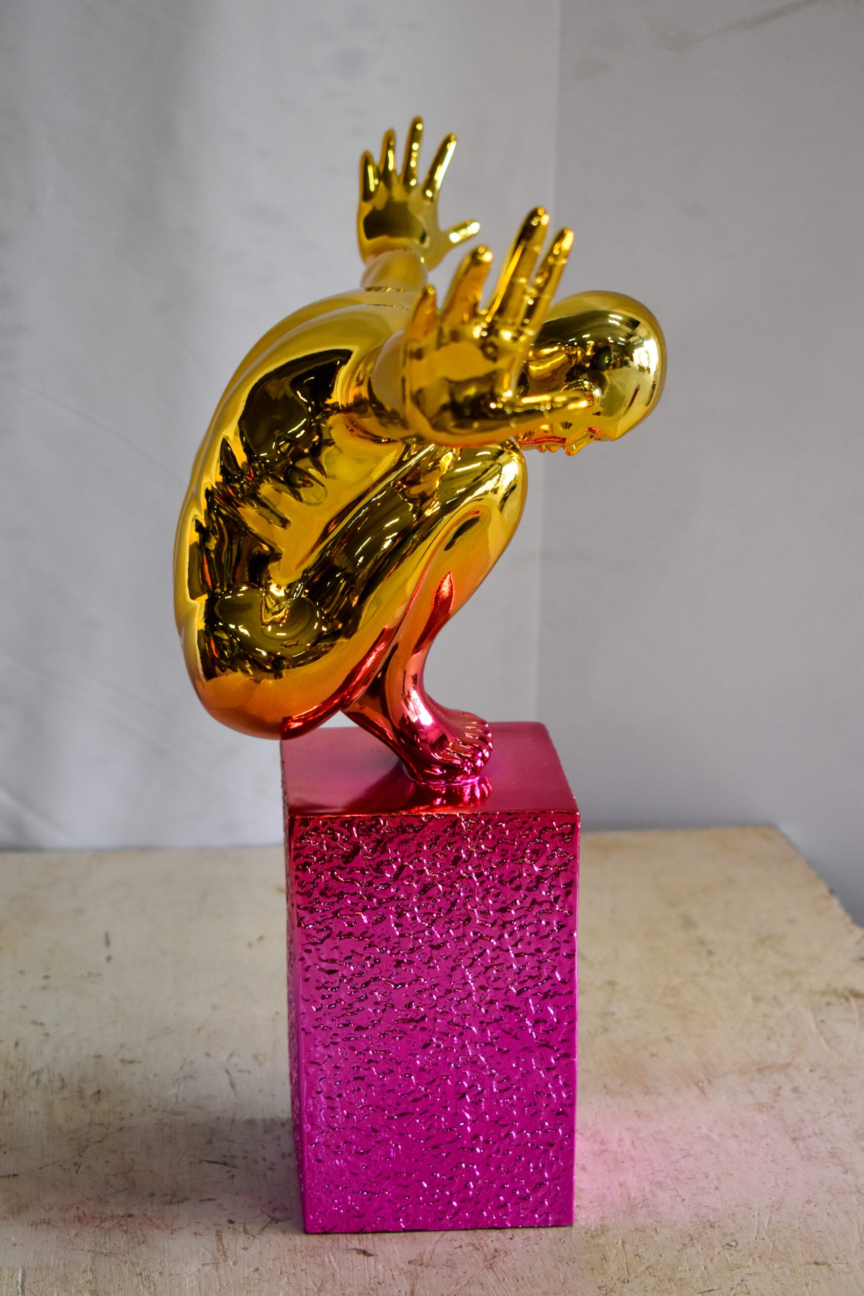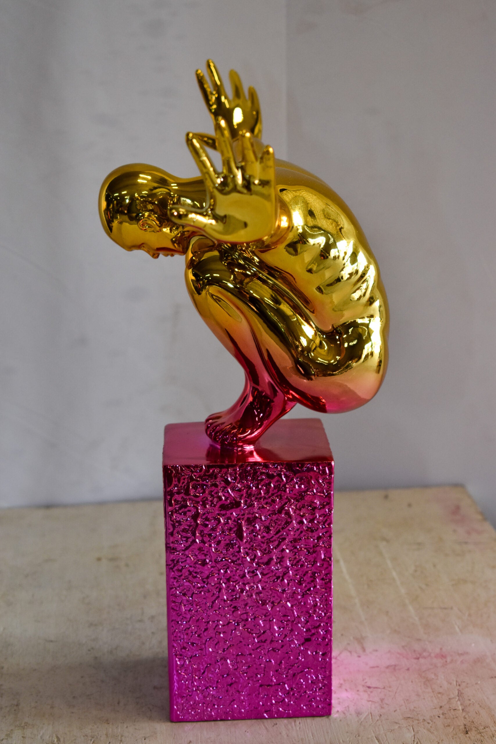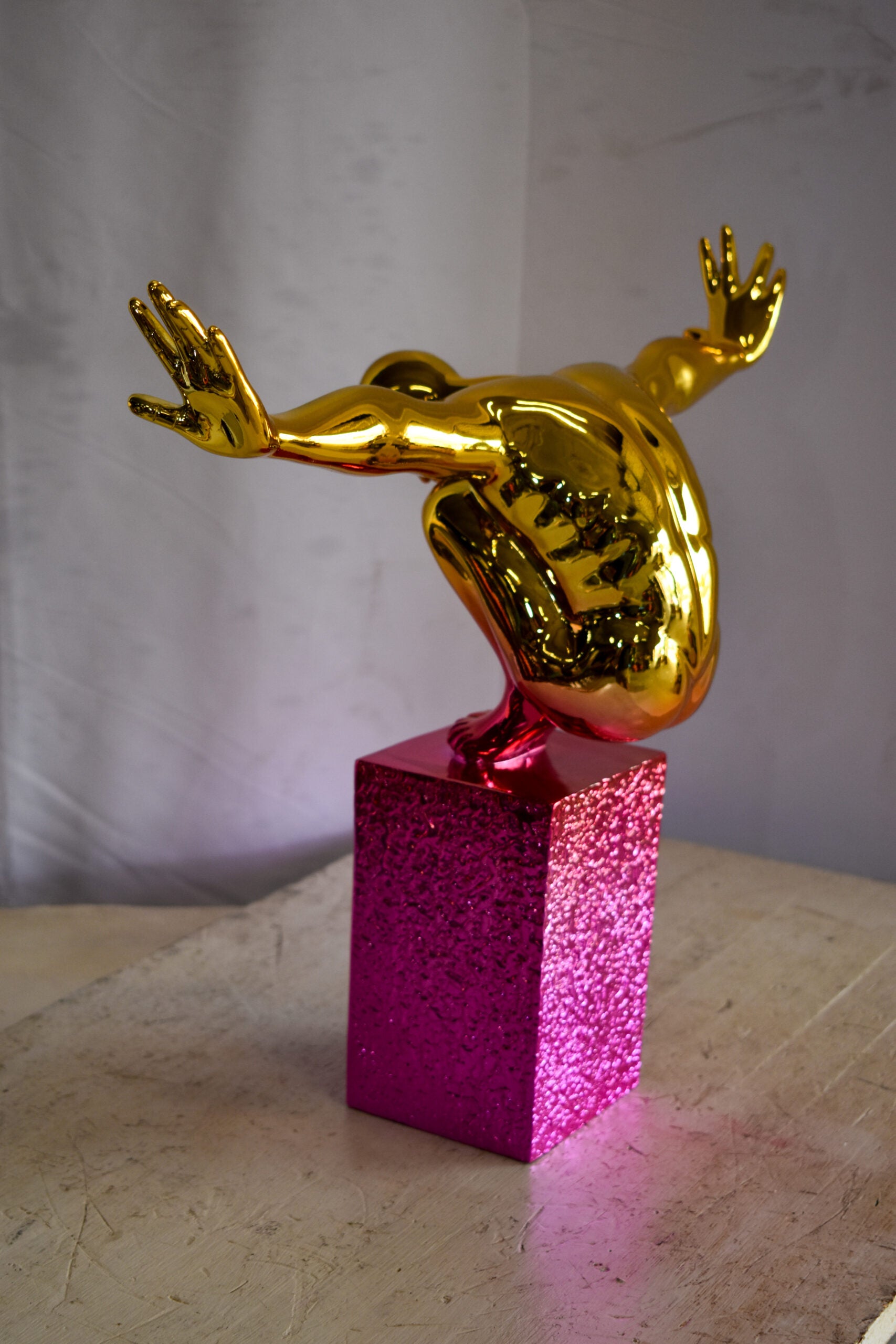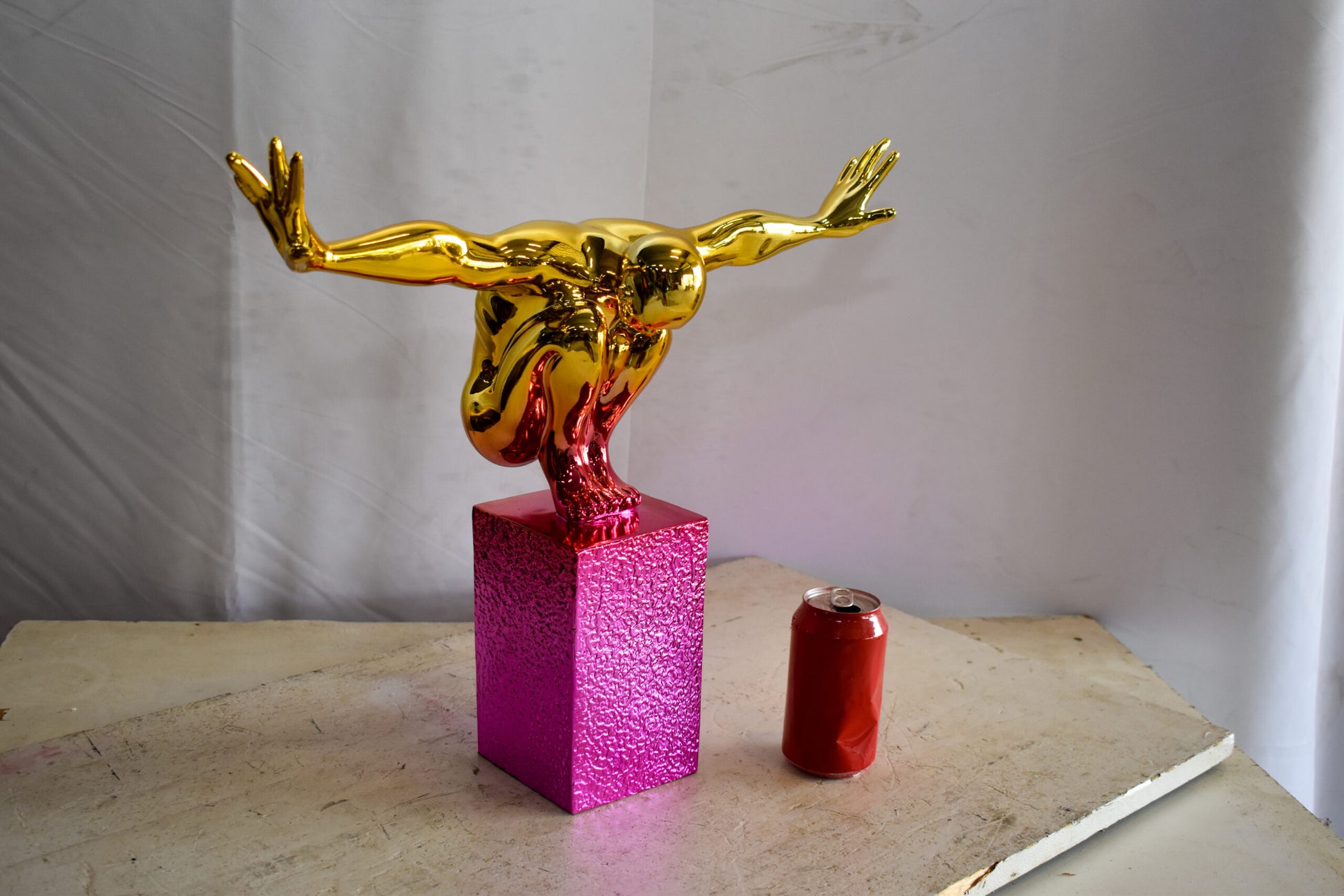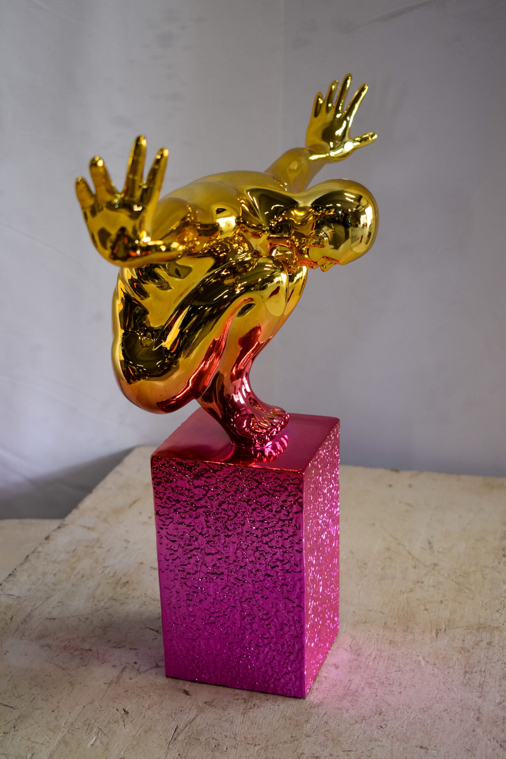 This unique statue poses an Olympian swimmer in a confident stance. With a textured bold pink chrome base, and a gold olympian on top, it will be sure to draw attention and bring artistic beauty to any room. Size: 20"L x 8"W x 17"H. Weight is: 8Lb