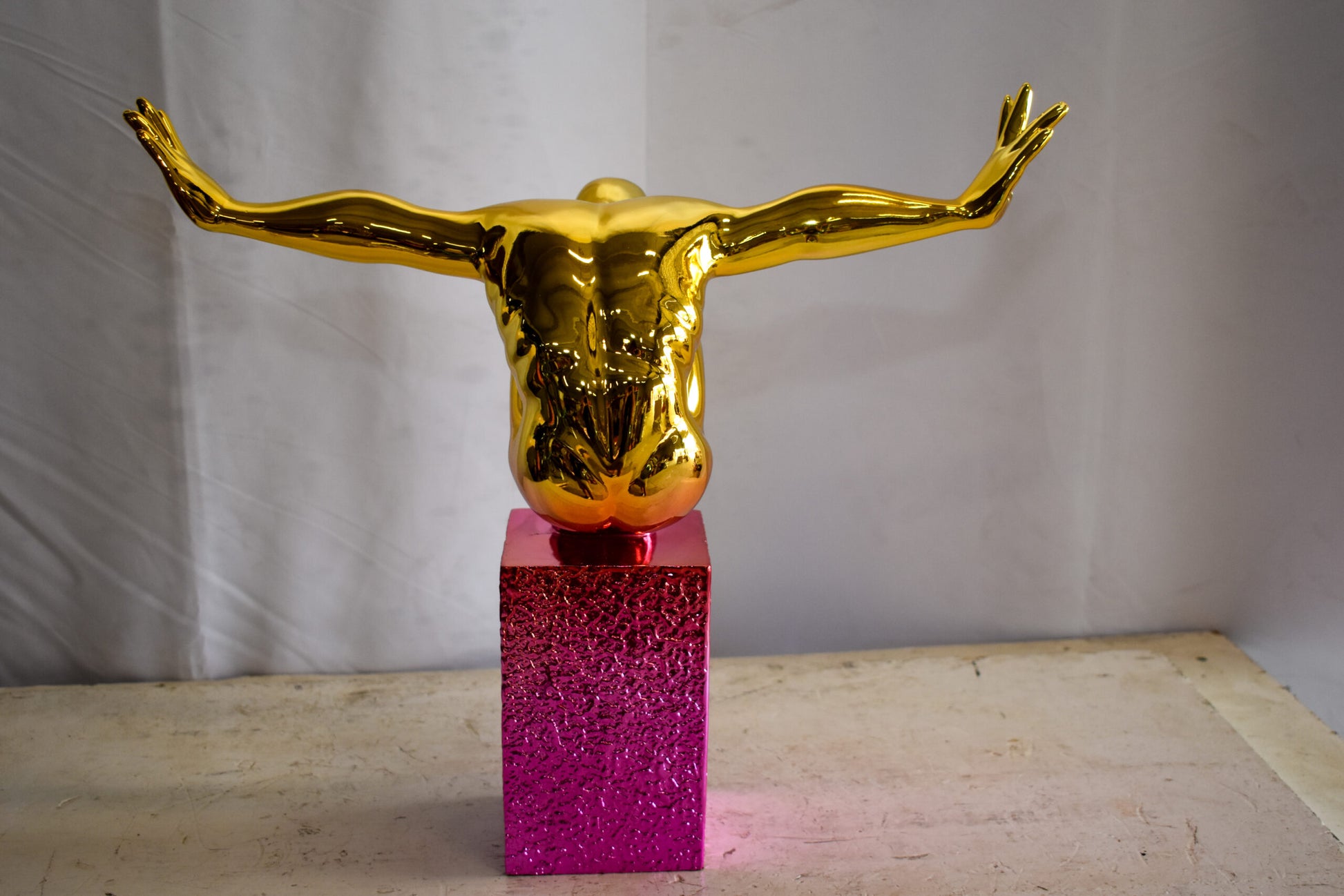 Olympian Stanced Man on Patterned Pink Chrome Base Resin Statue 20" x 8" x 17"H