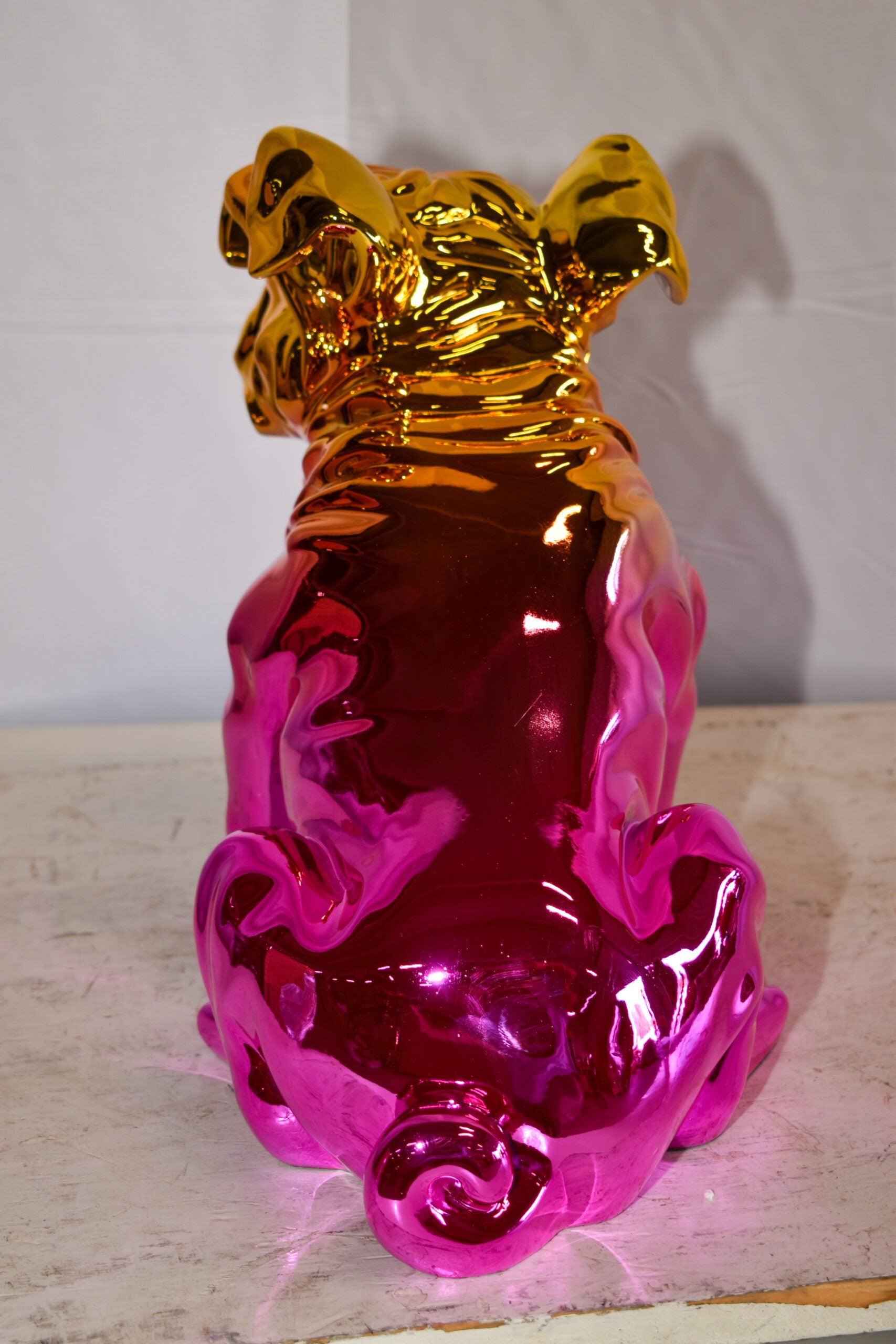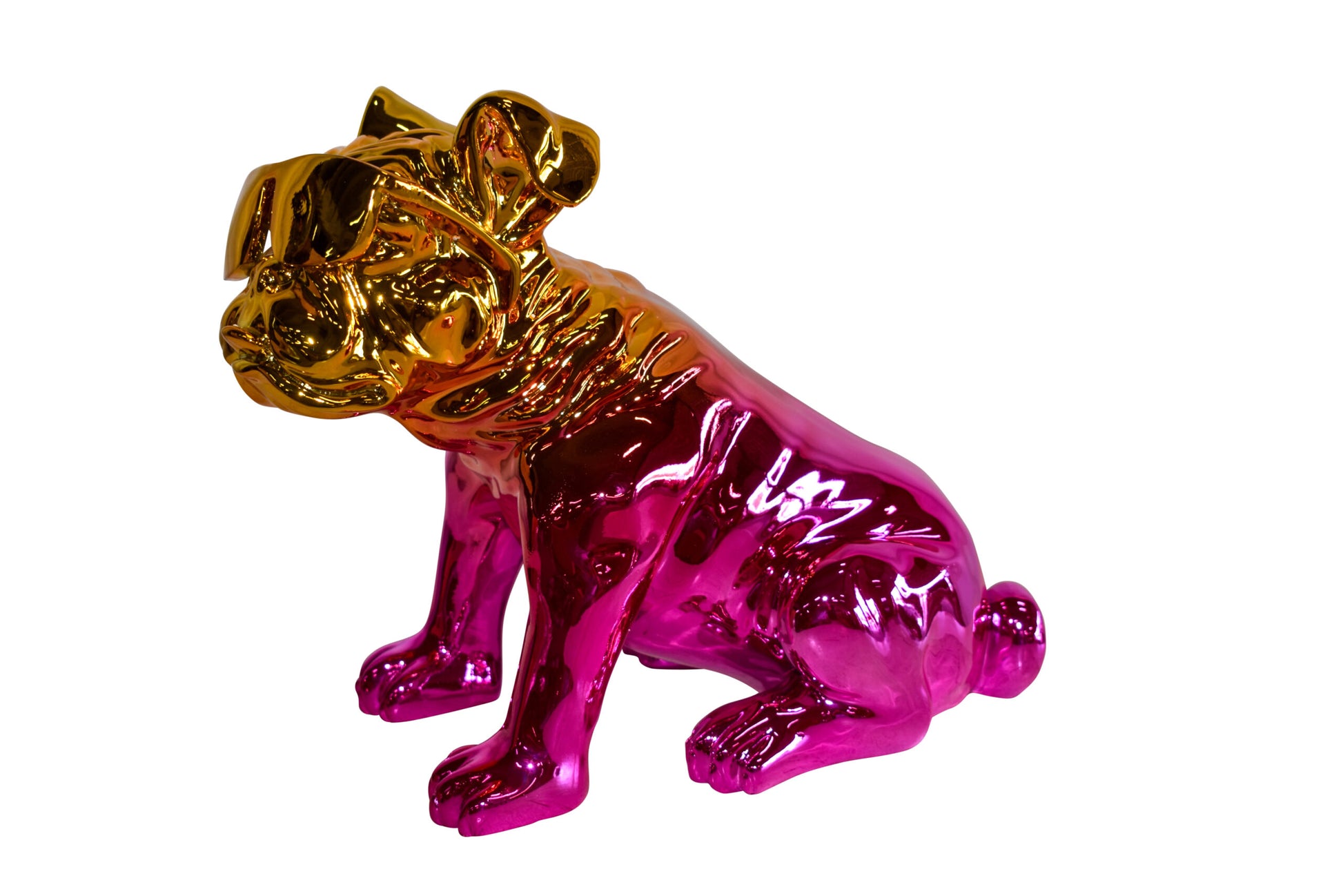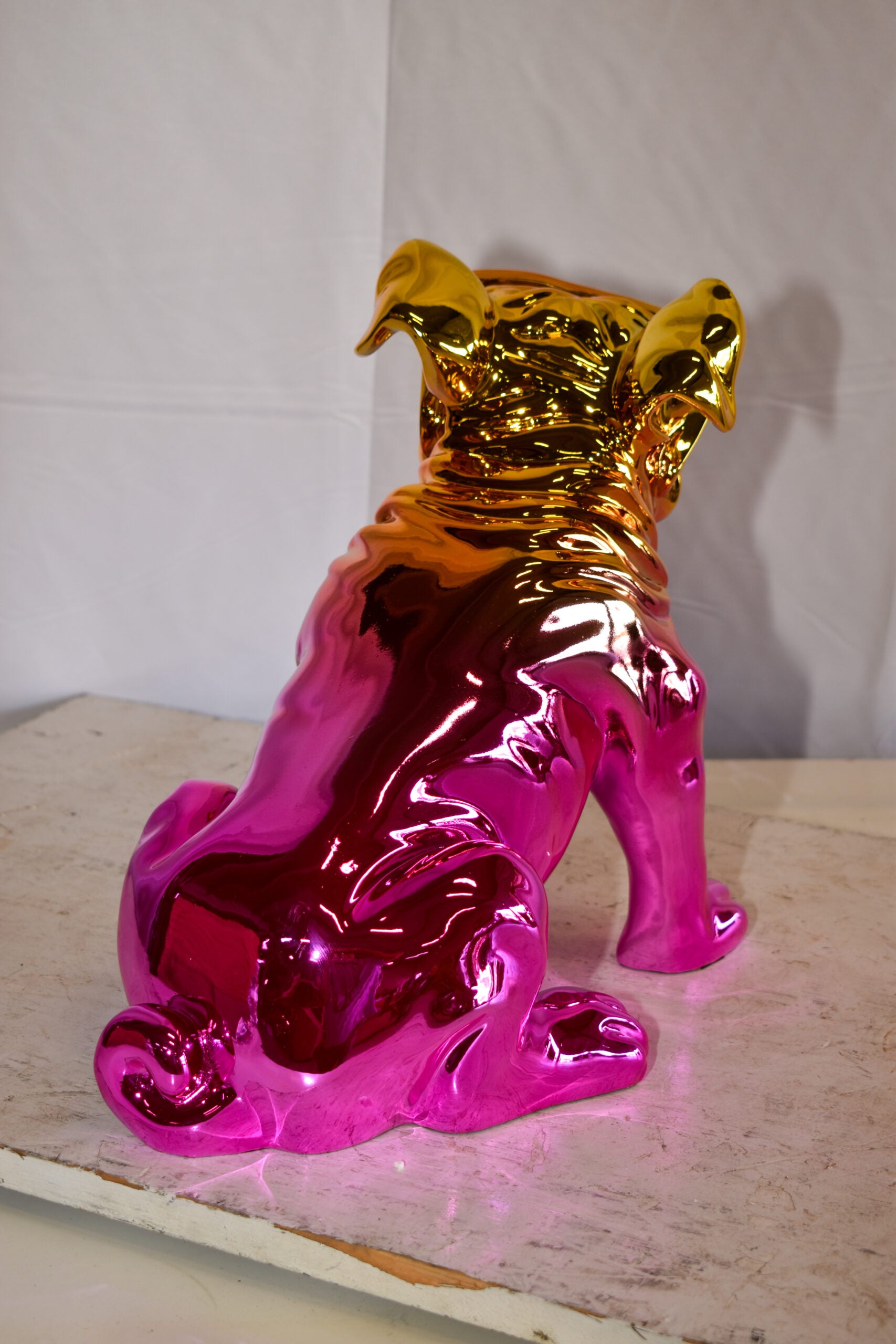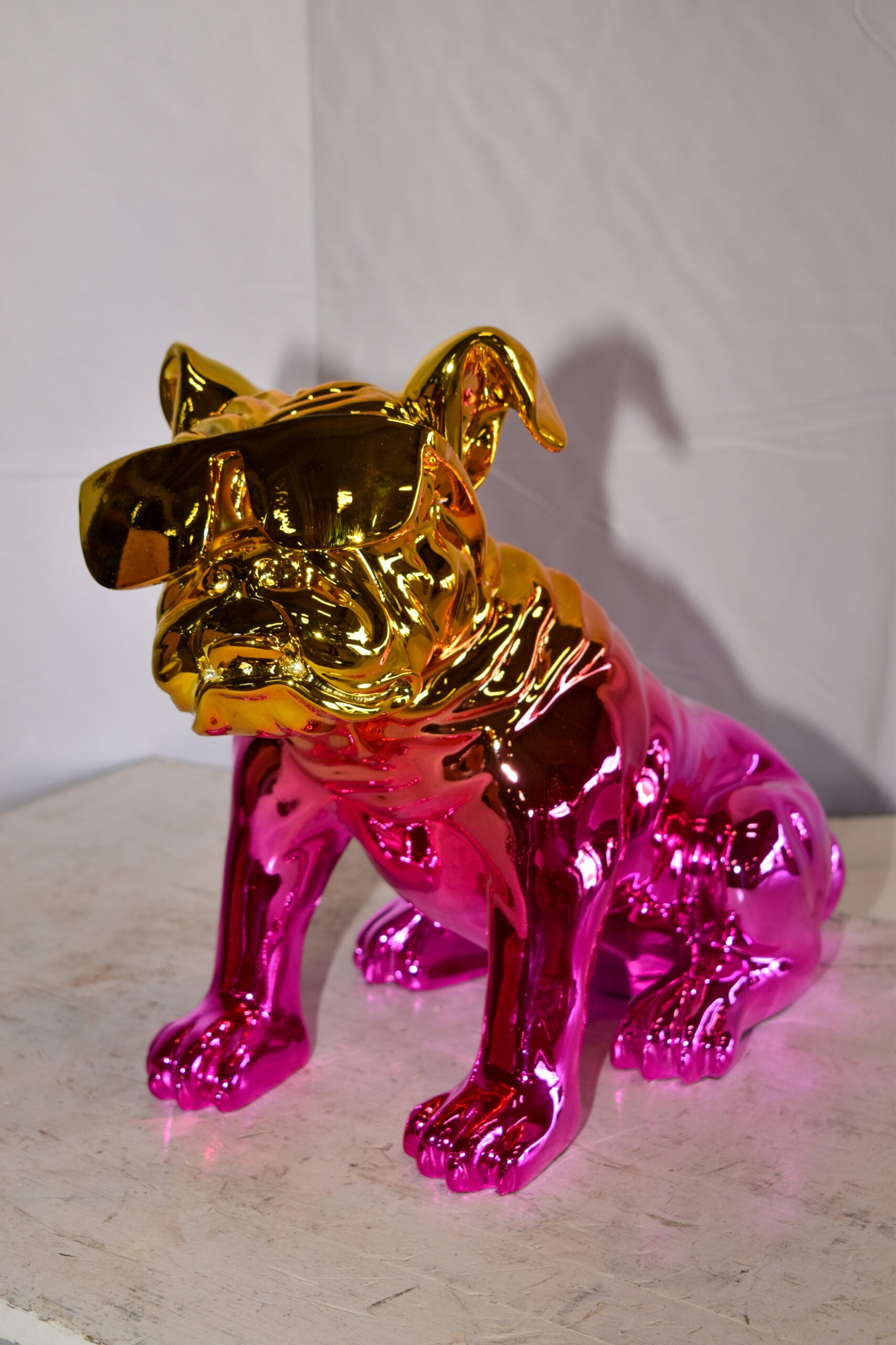This pink ombre chrome colored resin statue of a bulldog with sunglasses on is the perfect combination of pop art and creativity. It will add fun artistry to any room, and would pair with the other colored bulldog statues. Size: 16"L x 9"W x 13"H. Weight is: 6Lb