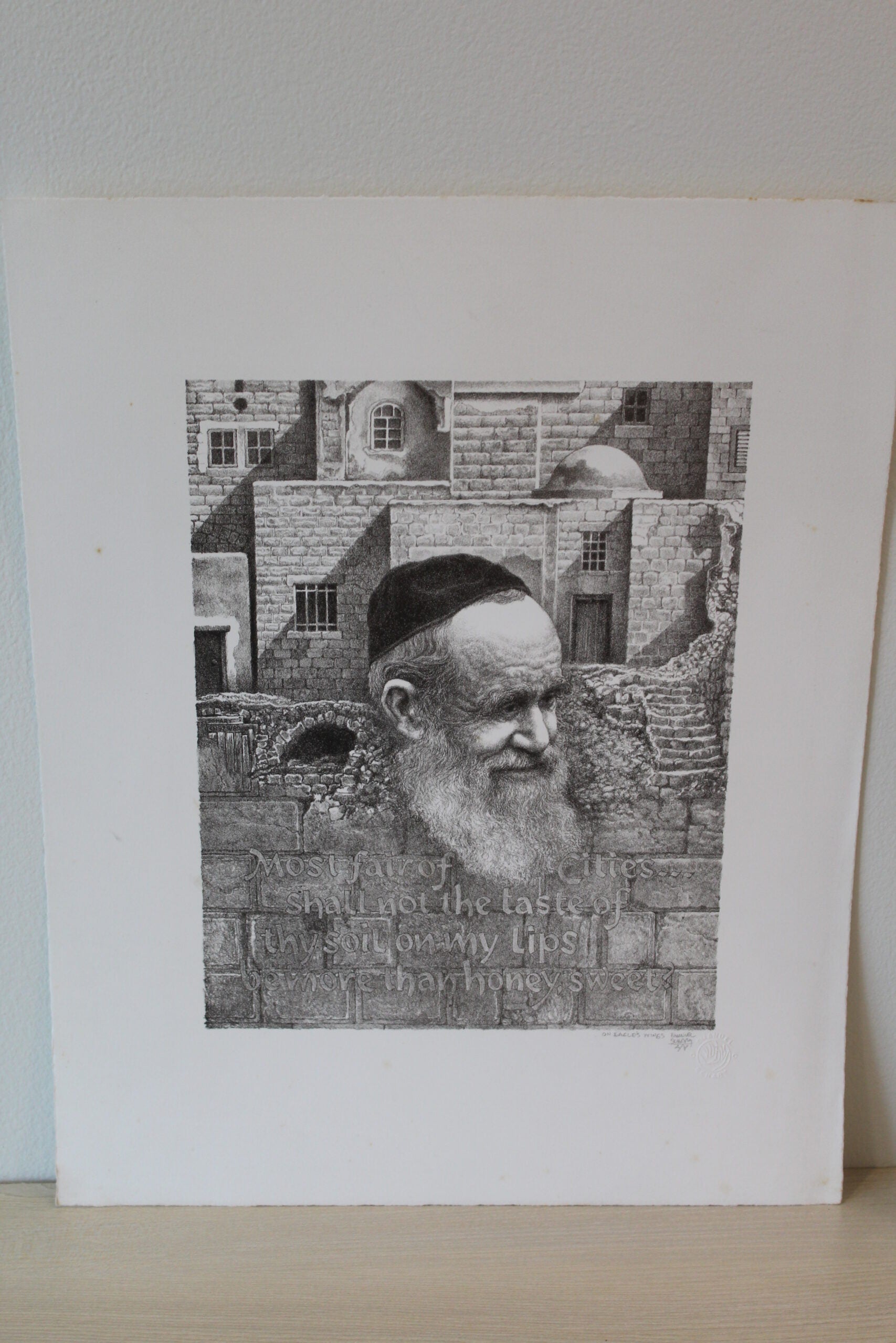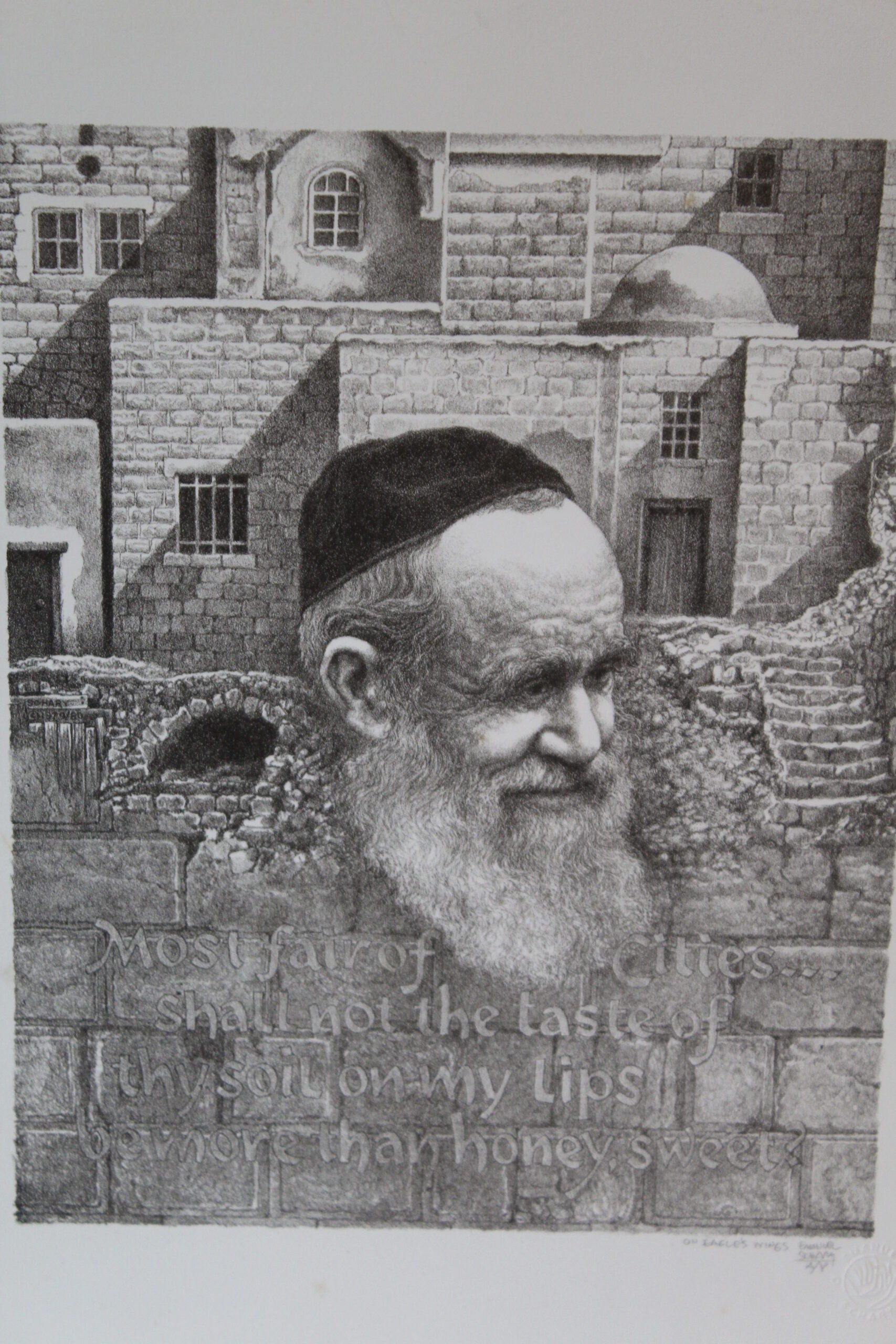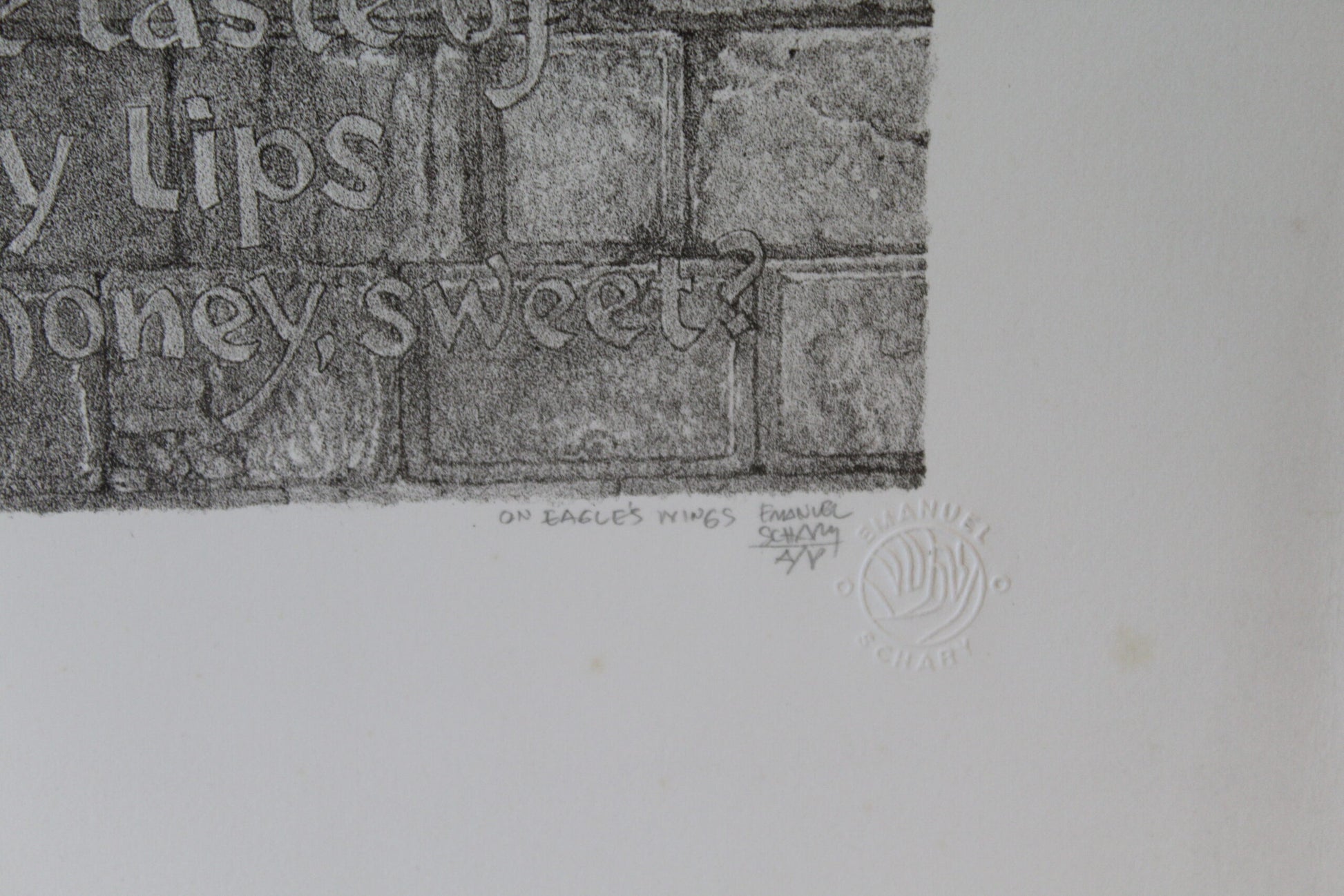 Emanuel Schary's "On Eagle's Wings" Lithograph, in mesmerizing black and white, presents a surreal spectacle. A man's visage emerges resolutely from a brick wall, symbolizing resilience and transcendence. The striking contrast and intricate detailing weave a narrative of overcoming barriers, invoking a sense of liberation and the soaring spirit represented by the title's metaphorical "eagle's wings." Size: 9"L x 11"W x "H. Weight is: 2Lb