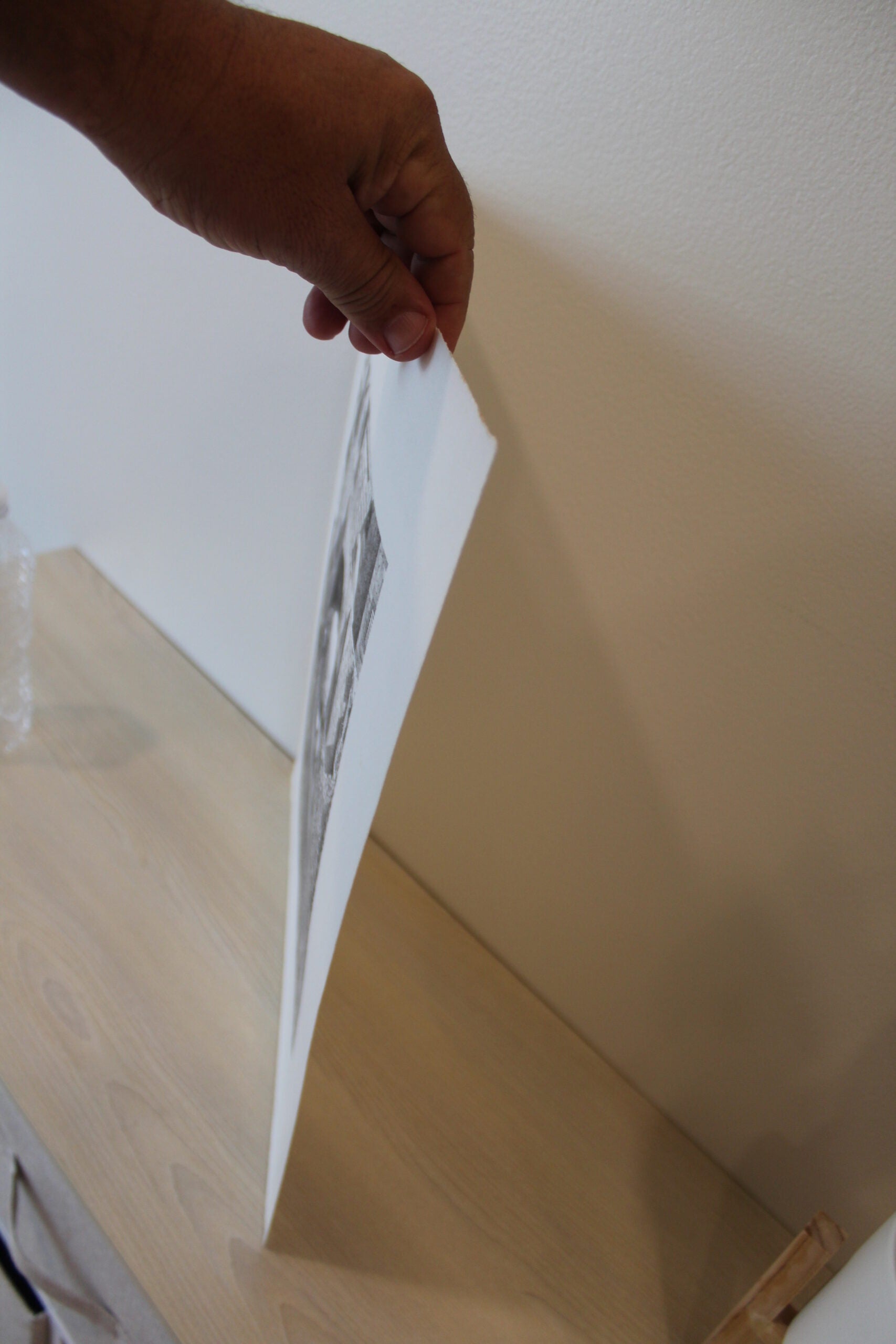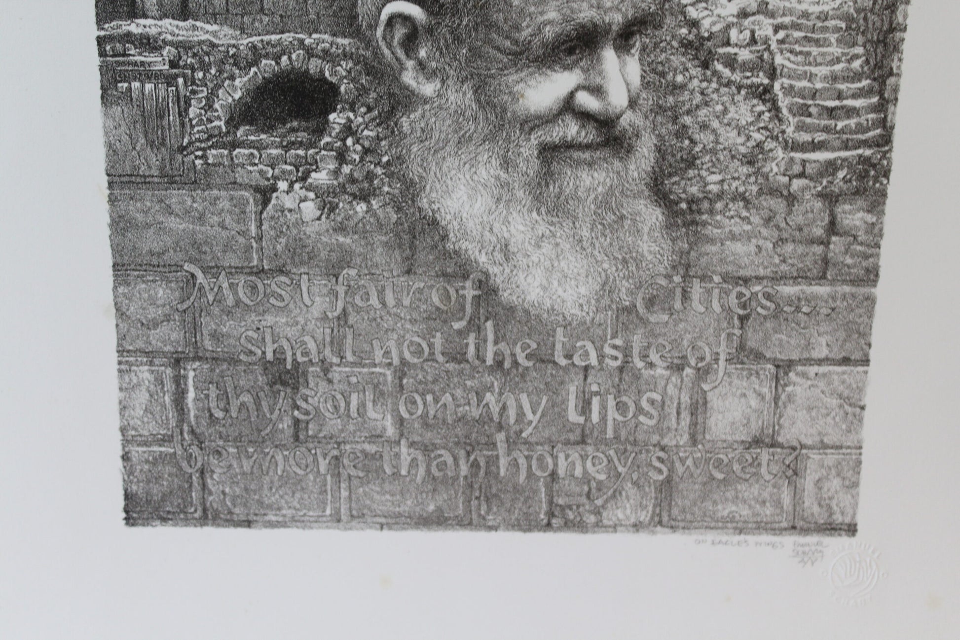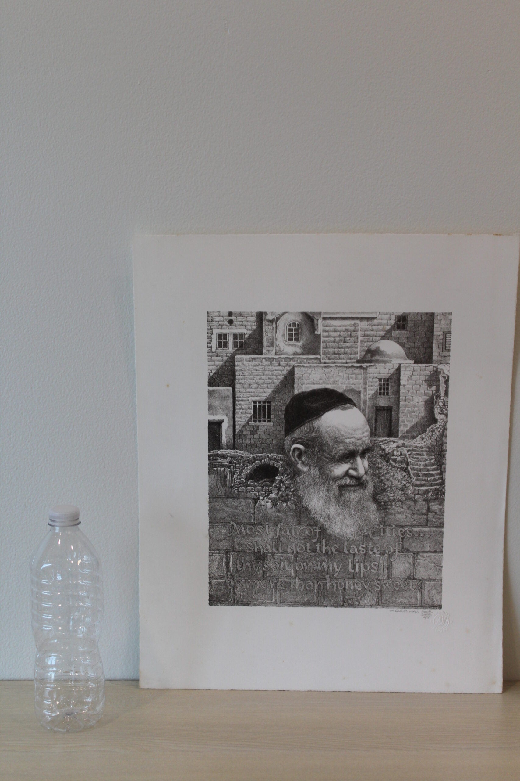 Emanuel Schary's "On Eagle's Wings" Lithograph, in mesmerizing black and white, presents a surreal spectacle. A man's visage emerges resolutely from a brick wall, symbolizing resilience and transcendence. The striking contrast and intricate detailing weave a narrative of overcoming barriers, invoking a sense of liberation and the soaring spirit represented by the title's metaphorical "eagle's wings." Size: 9"L x 11"W x "H. Weight is: 2Lb