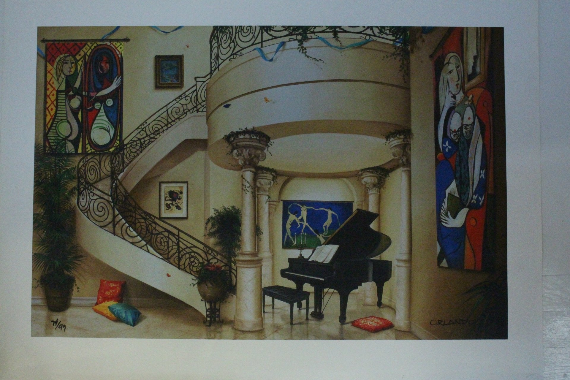 Printed on Canvas At the young age of 35, celebrated Cuban artist, Orlando, is the nation’s proponent of “Magical Realism,” a delicate combination of colorful architectural interiors gently mixed with illusion. His original oil paintings and limited edition prints are widely collected not only for their striking interior subjects but also for their remarkable deception of memorable works of master artists. "In The Mood For Love" is a Hand signed and Numbered Limited Edition giclee of a painting. Size: 21"L x 13.5"W x 0"H. Weight is: 0.5LbPaintingCanvasFine Arts