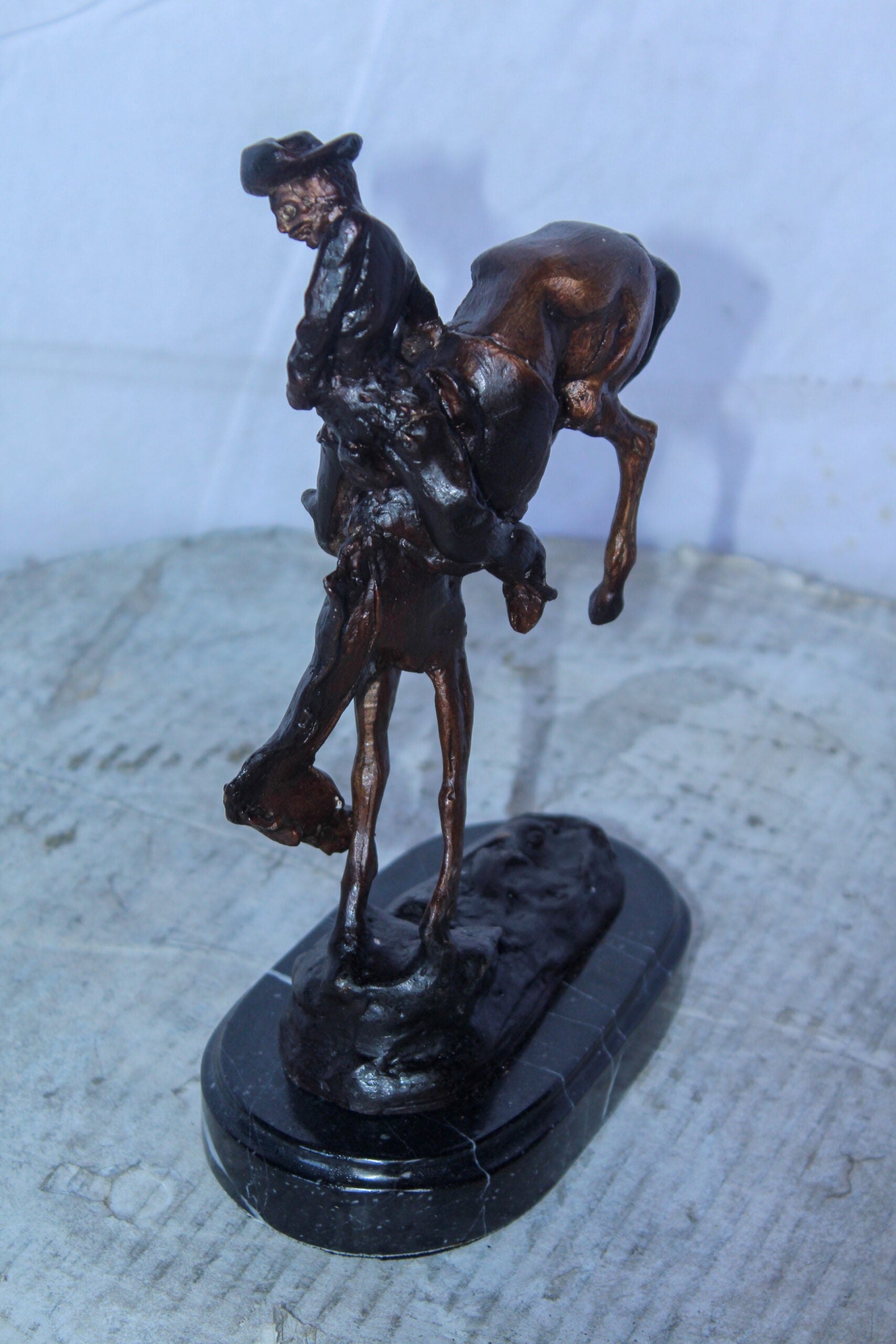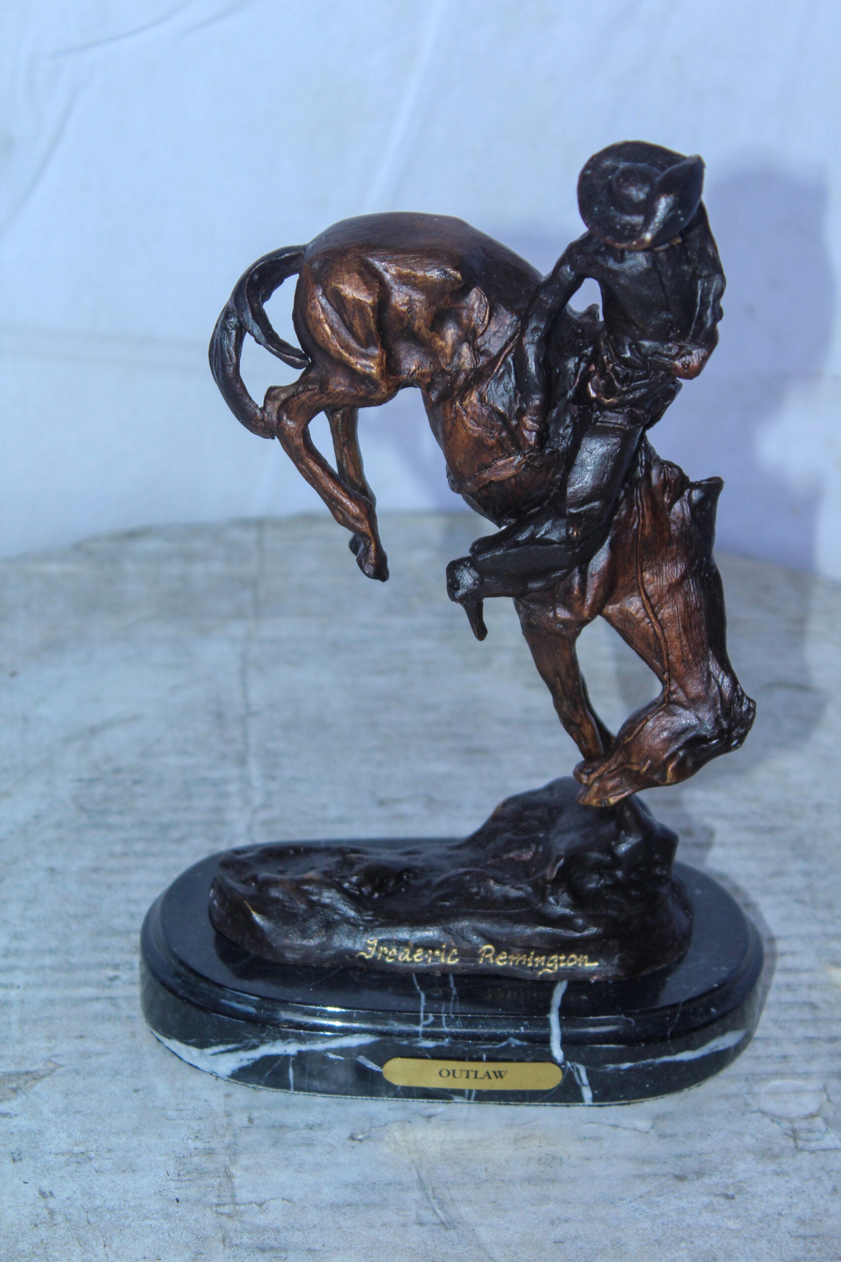 Outlaw by Remington bronze statue replica, Western decor, handcrafted and casted using traditional lost wax method. This evocative piece captures the rugged individualism and spirit of adventure synonymous with the American frontier. Ideal for collectors and Western enthusiasts, bringing a bold and iconic presence to any home or office decor. Size: 7"L x 3"W x 10"H. Weight: 6Lb