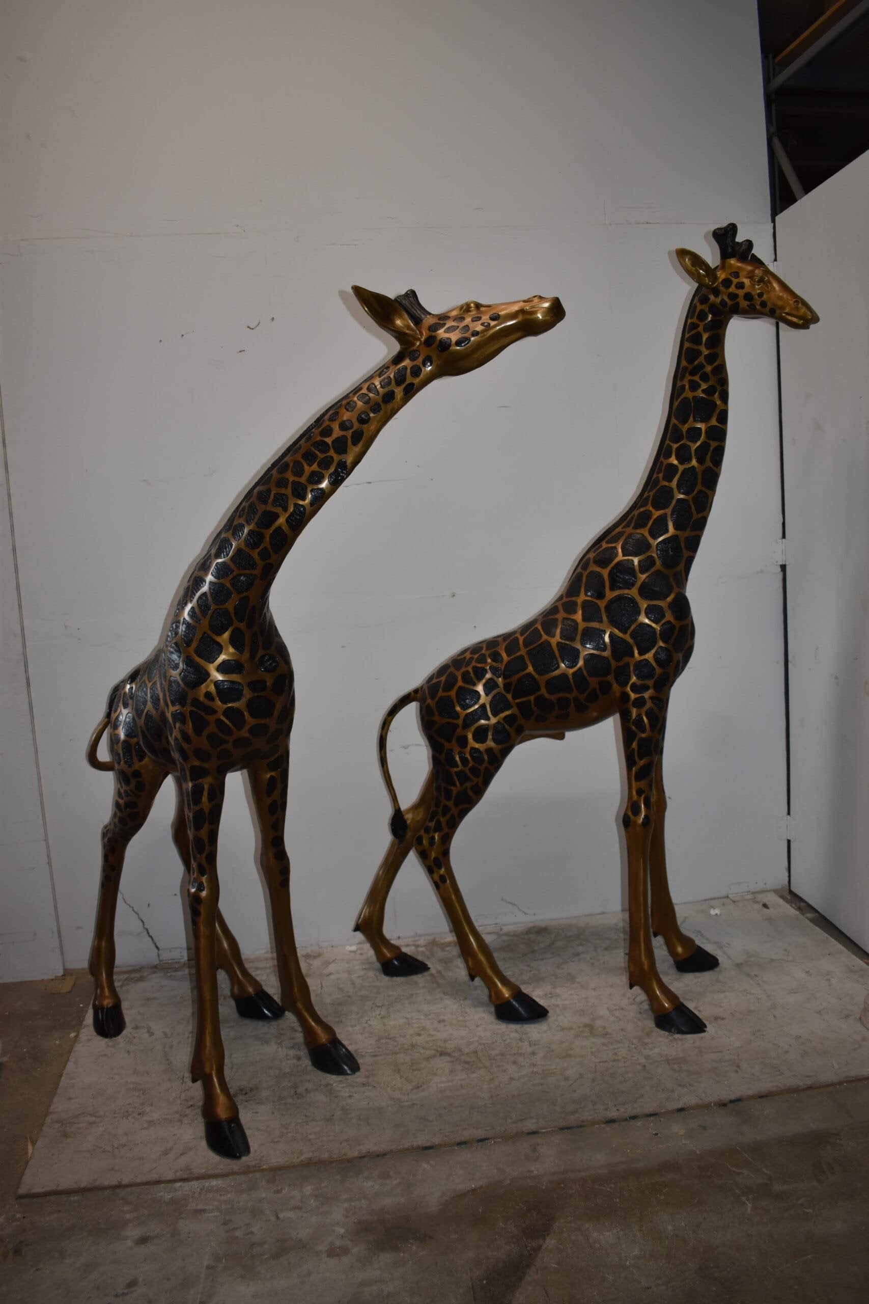 This pair of bronze statue giraffes carry playful and young energy. The artist used detailed artisanship when creating this pieces, which is effortlessly reflected in the texture and design of the giraffes body and stance. This pair is perfect for the indoor or outdoor space of any animal lover or art fanatic. Size: 54"L x 18"W x 89"H. Weight is: 180Lb