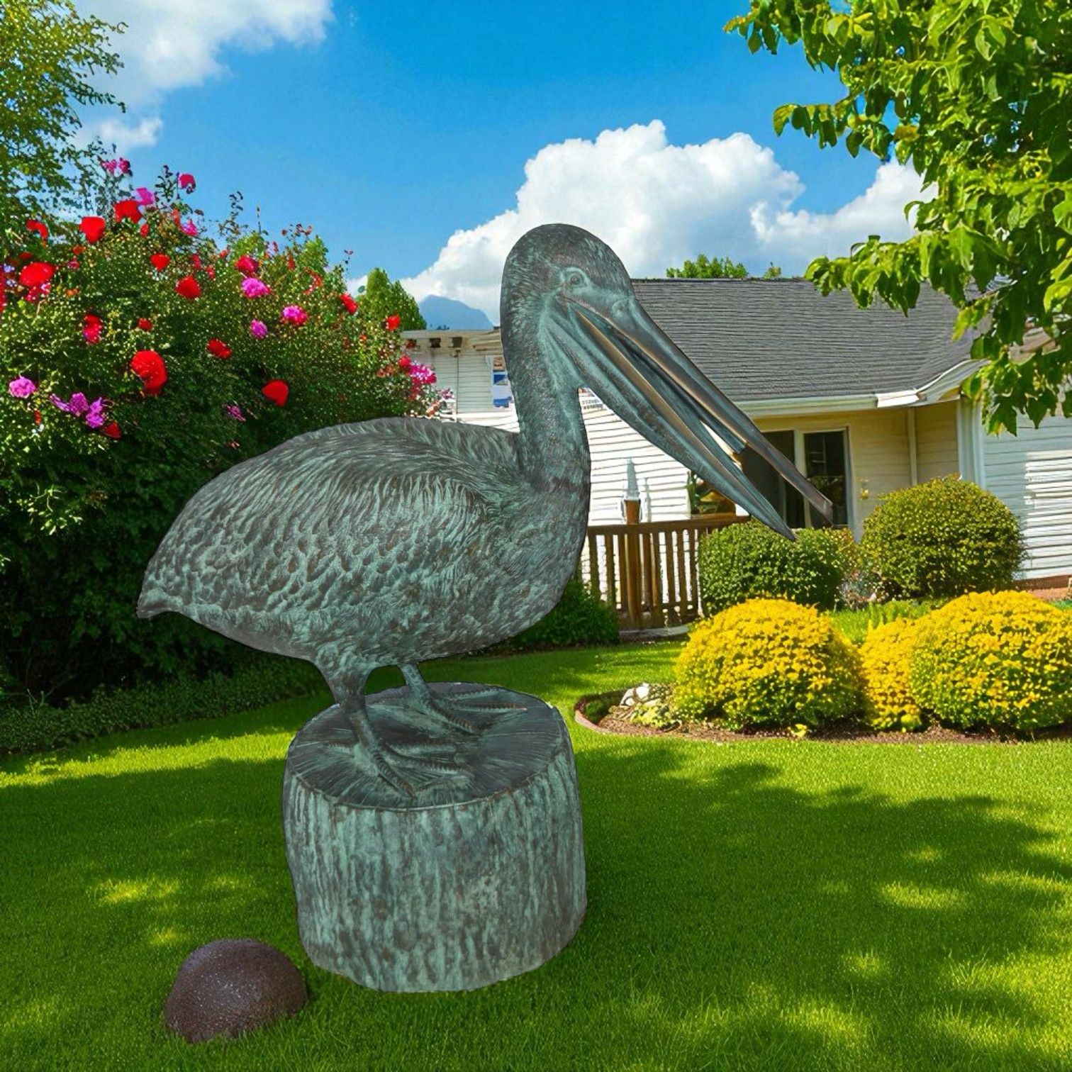 The large size fountain of a Pelican depicts the Louisiana State Bird perched on a tree stump. This very fine and unique abstract was casted using the ancient old "Lost Wax Method" stained in green and brown patina finish for preservation. The statue is equipped with a hose that sprays water out of the Pelican mouth, with the use of a fountain pump (pump is not included). 100% handmade and 100% bronze, mounted atop a bronze stump. This beautiful large bronze-cast statue will be a valuable addition to any area of the home, office, patio, or garden. Size: 30"L x 16"W x 30"H. Weight is: 36Lb