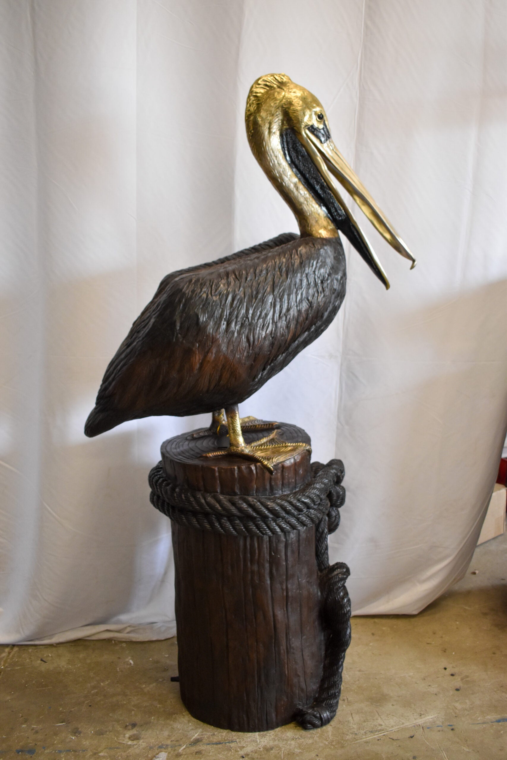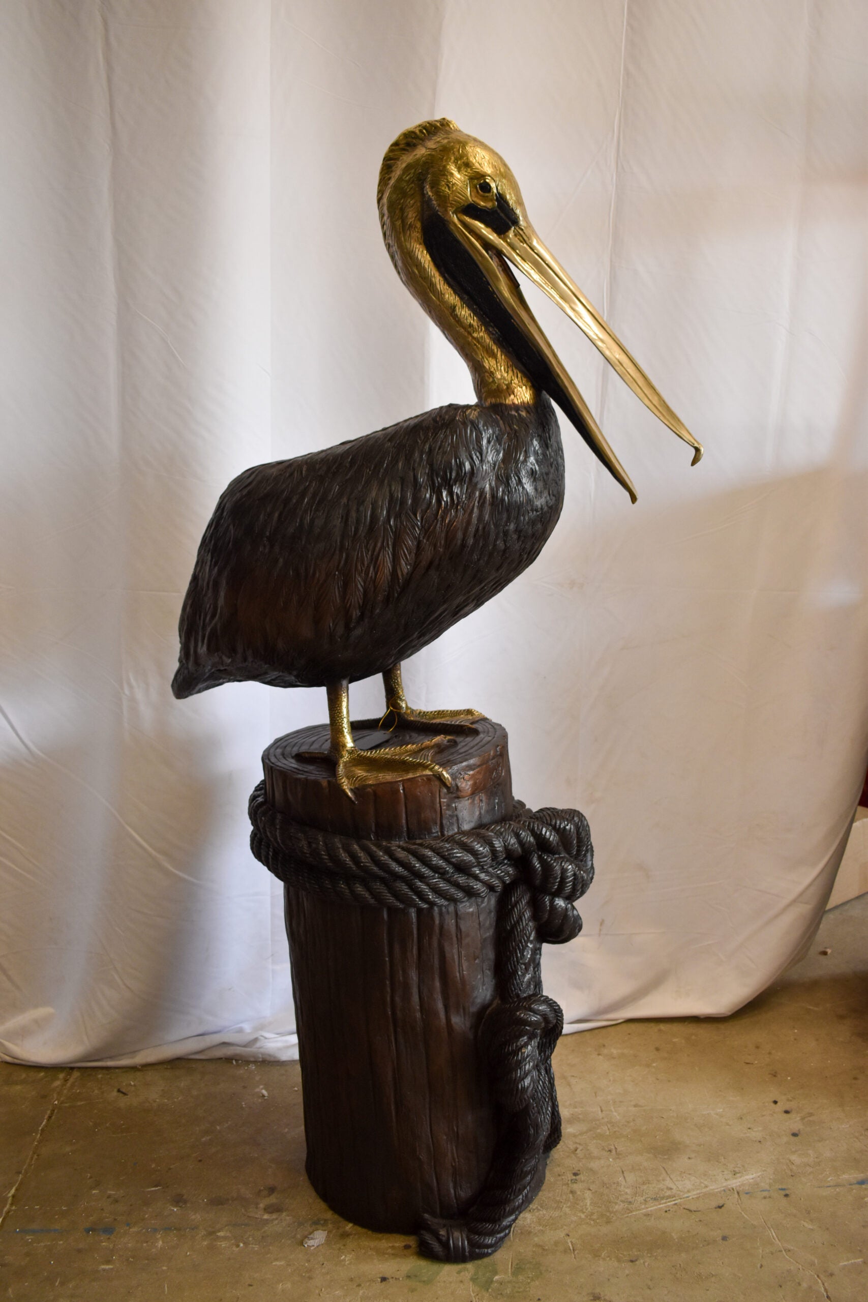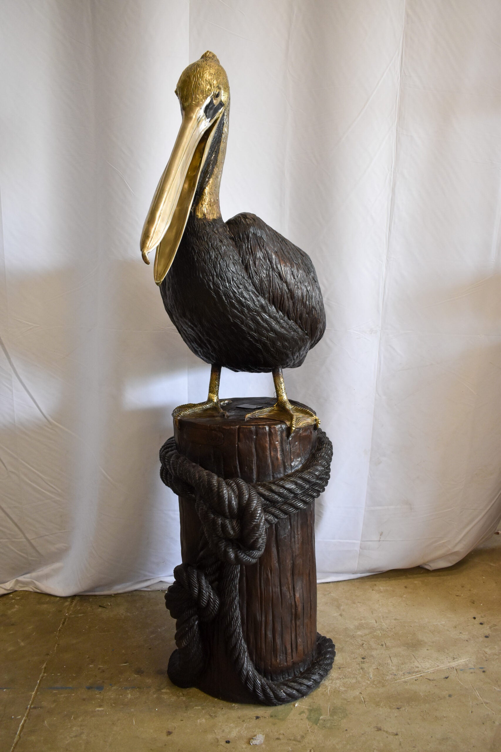 This bronze statue fountain is elegant, practical, and creative! The fountain will come out of the pelican beak, making it a playful and beautiful piece to any yard of an animal or nautical lover. Pump is not included. Size: 43"L x 24"W x 76"H. Weight is: 214Lb