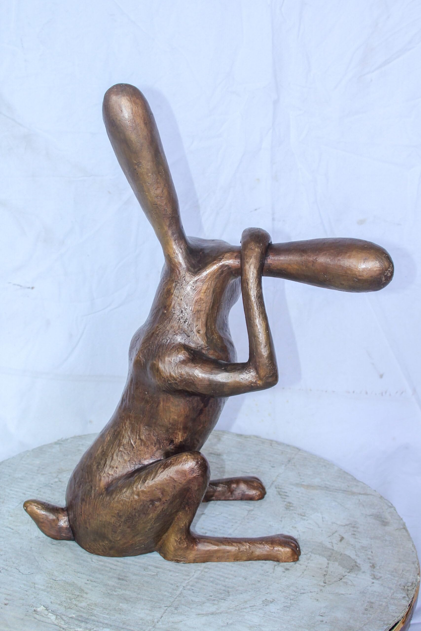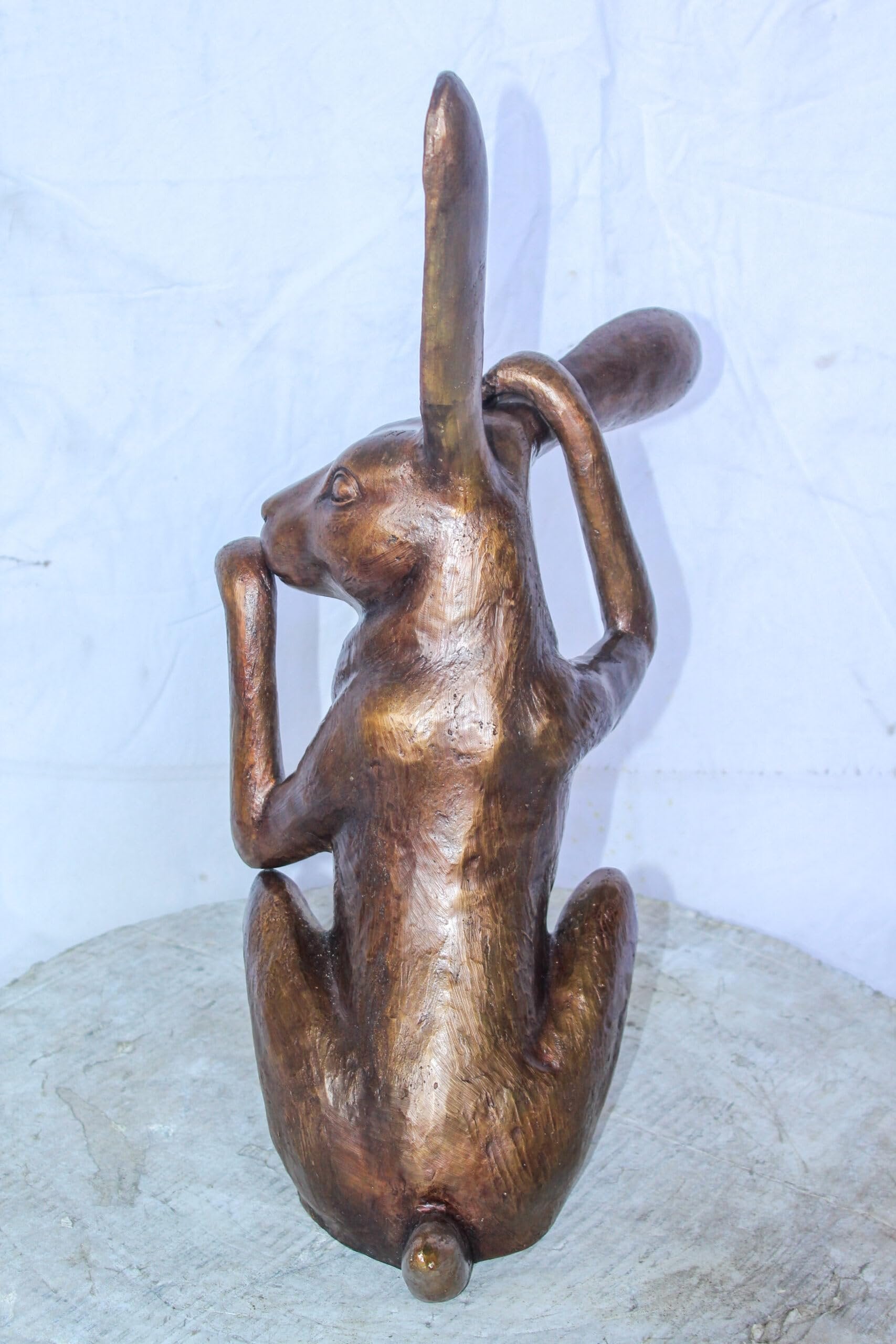 Pondering bunny rabbit bronze statue, charming home decor, handcrafted and casted using traditional lost wax method. This adorable piece captures the whimsy and innocence of rabbits, perfect for adding a touch of nature charm to any living space. Ideal for rabbit enthusiasts and collectors appreciating fine craftsmanship and the beauty of wildlife art. Size: 8"L x 14"W x 22"H. Weight: 16Lb