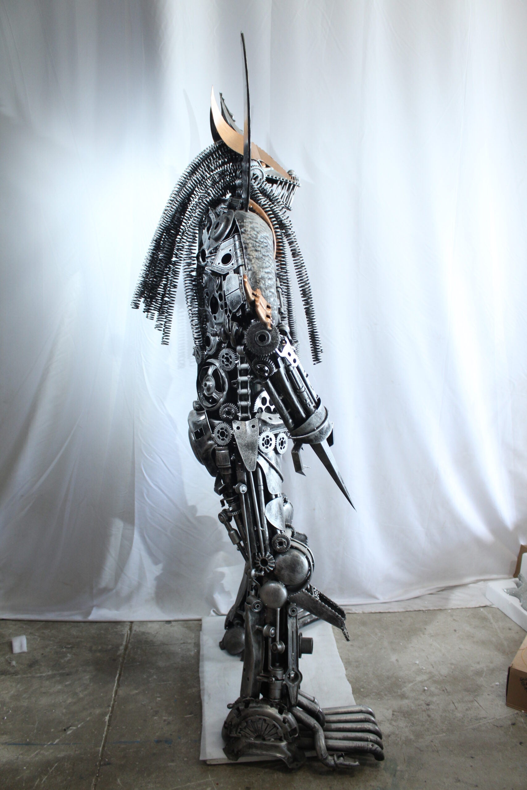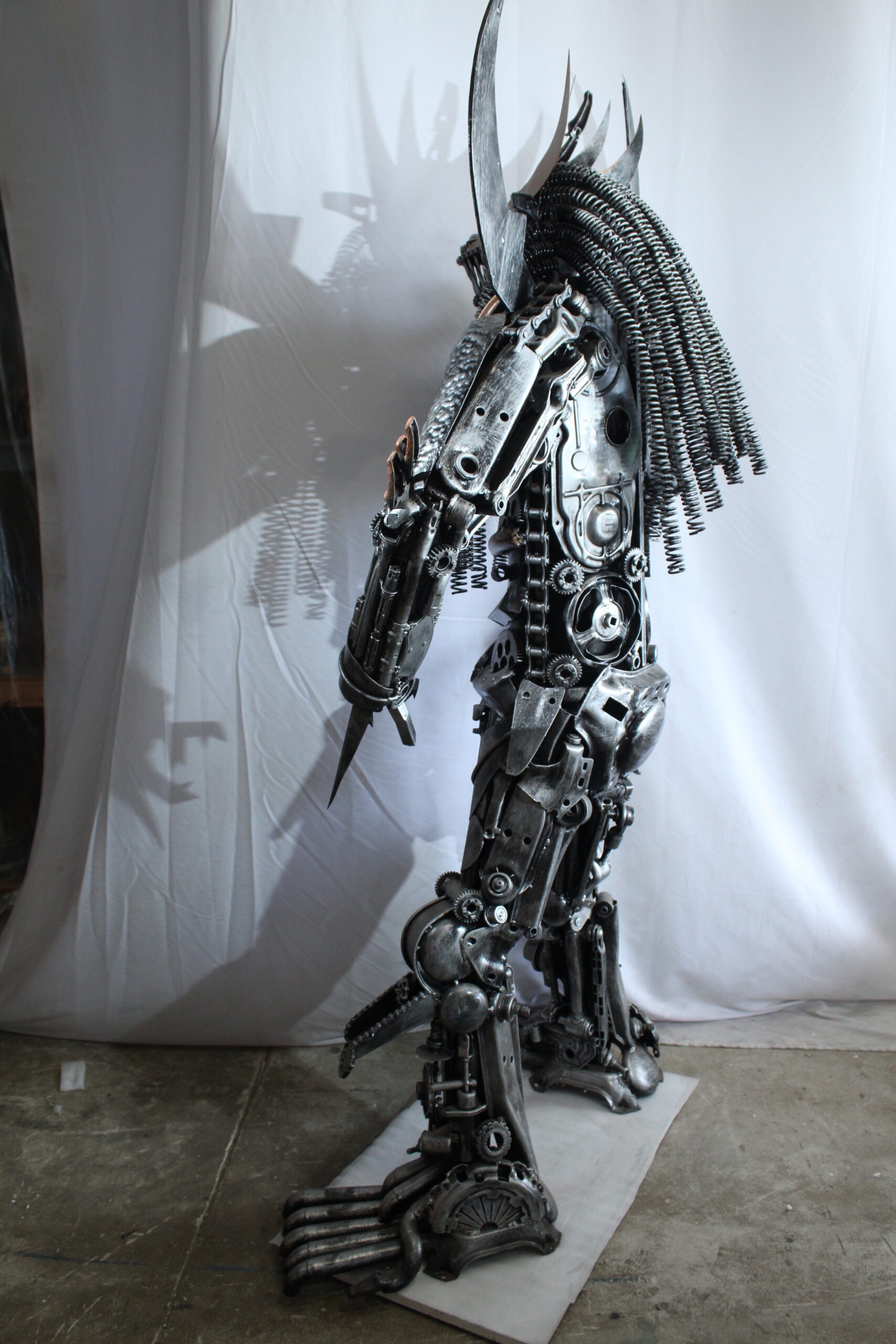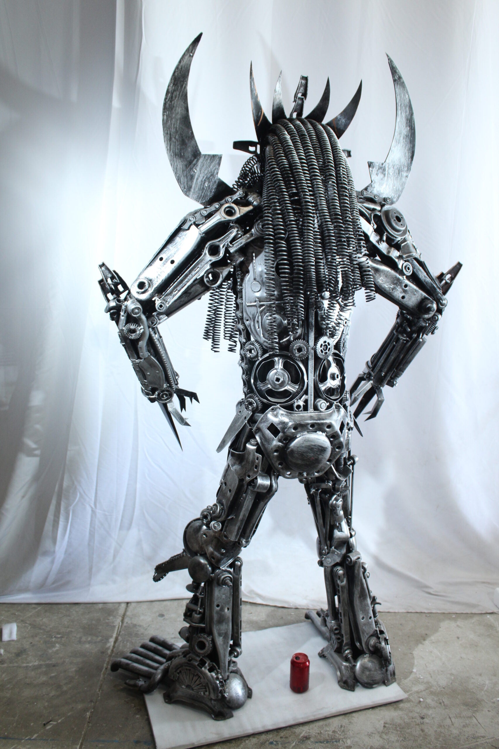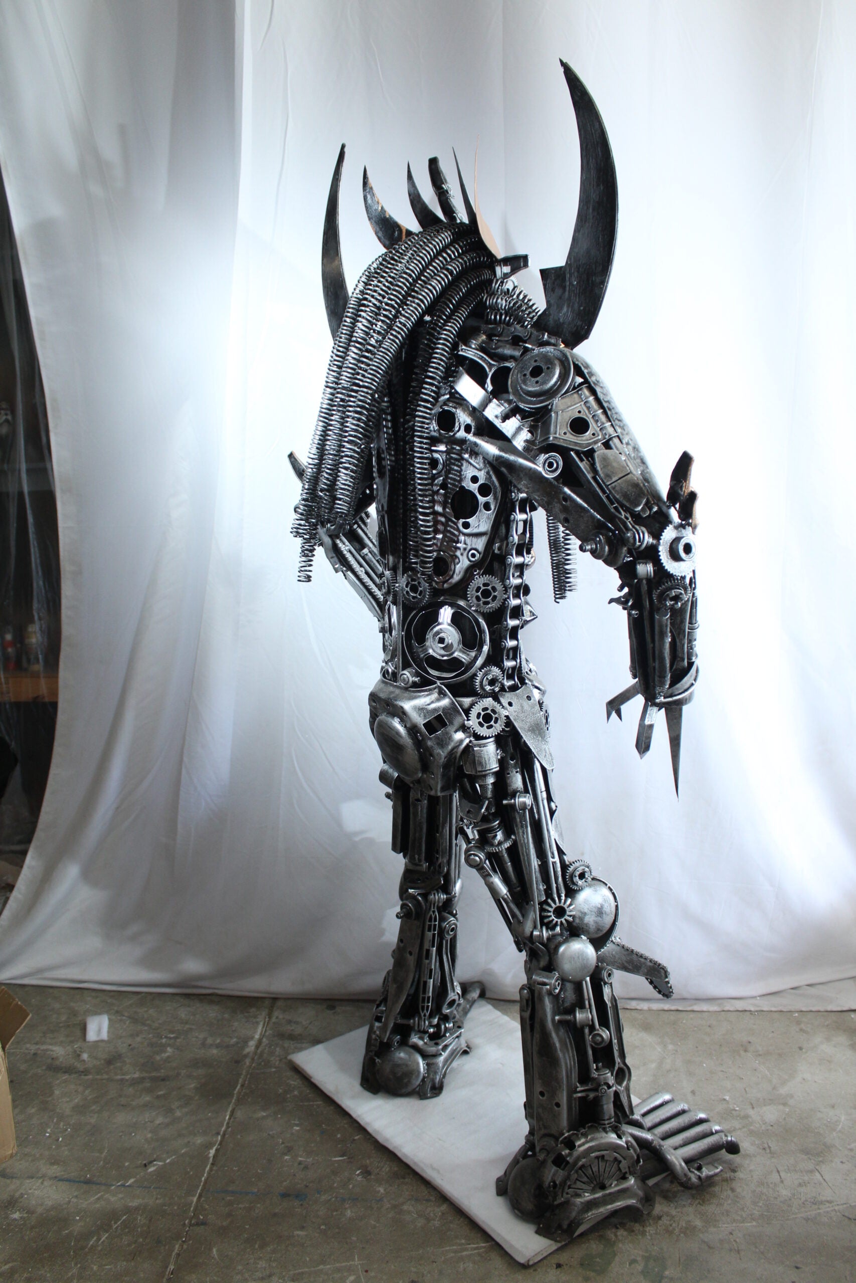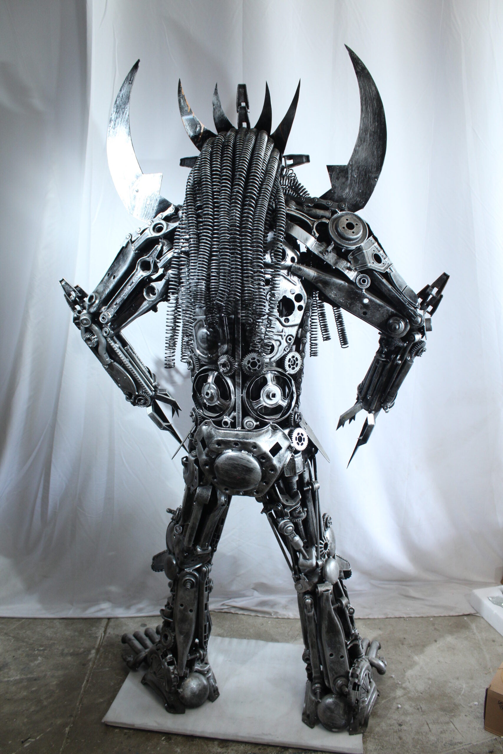 This striking statue is crafted entirely from heavy recycled metal parts, inspired by the legendary Predator character. Designed with intricate detail using gears, springs, and industrial scrap, this piece stands out as a bold fusion of sci-fi art and sustainable craftsmanship. A true collector's item and conversation starter for any movie fan or industrial decor lover. Size: 47"L x 24"W x 81"H. Weight: 250Lb