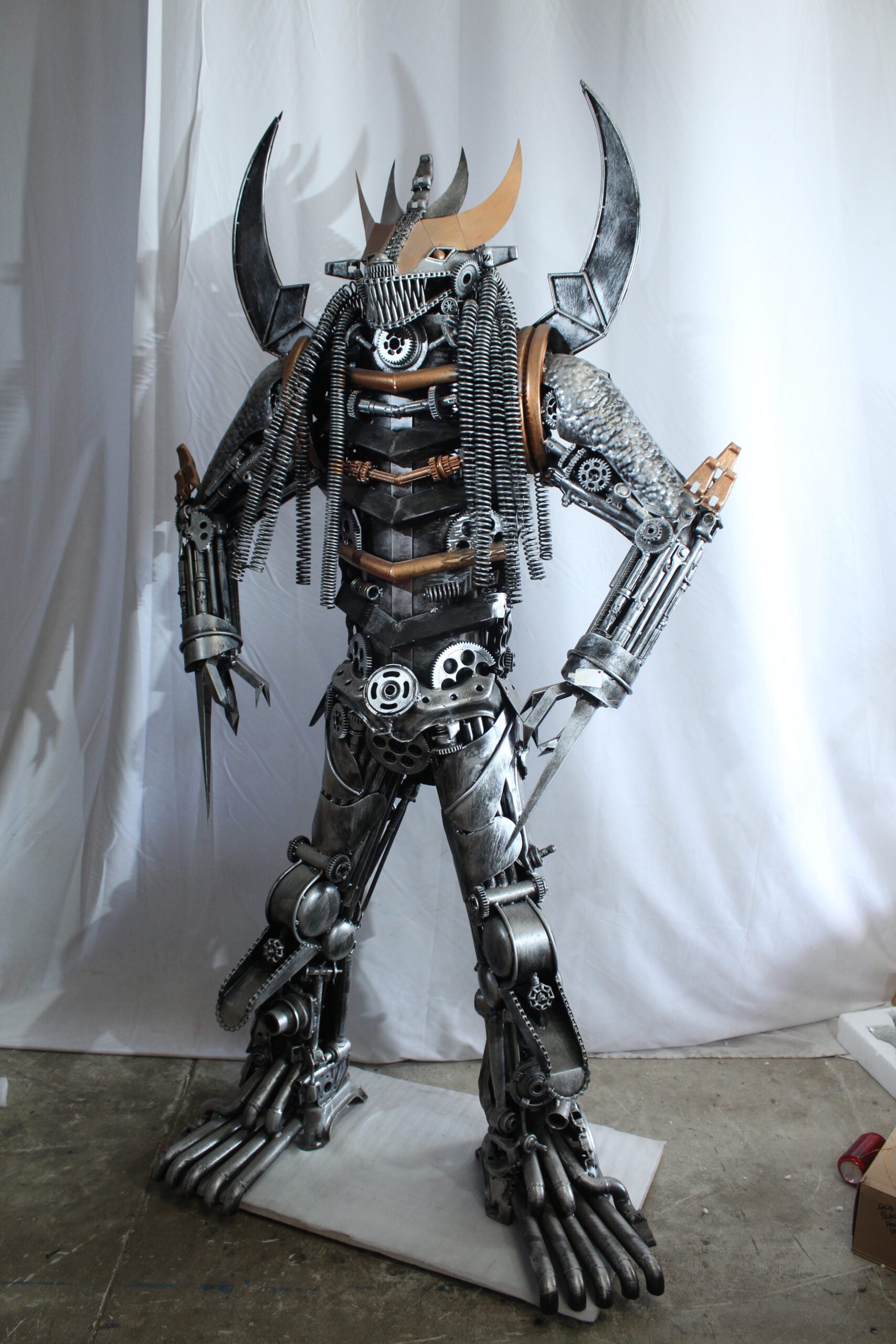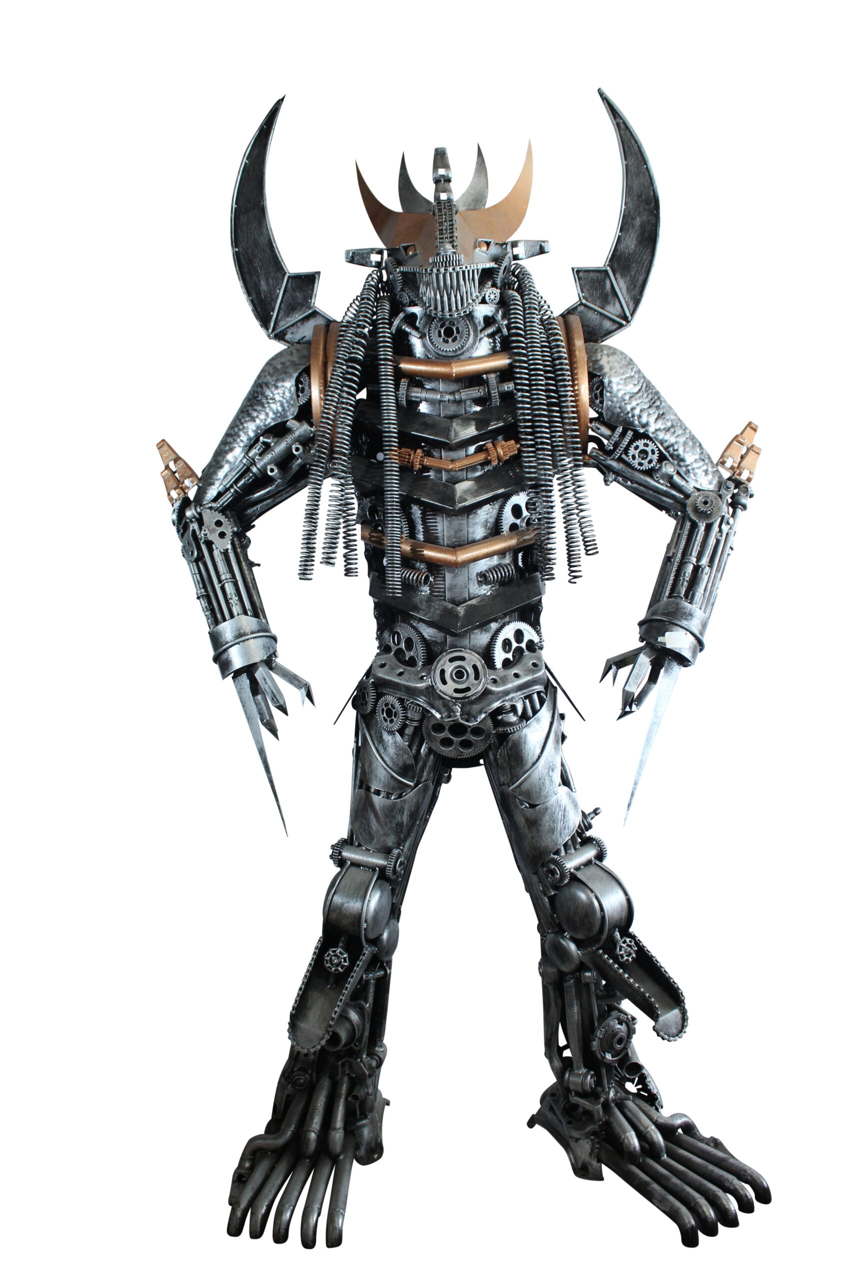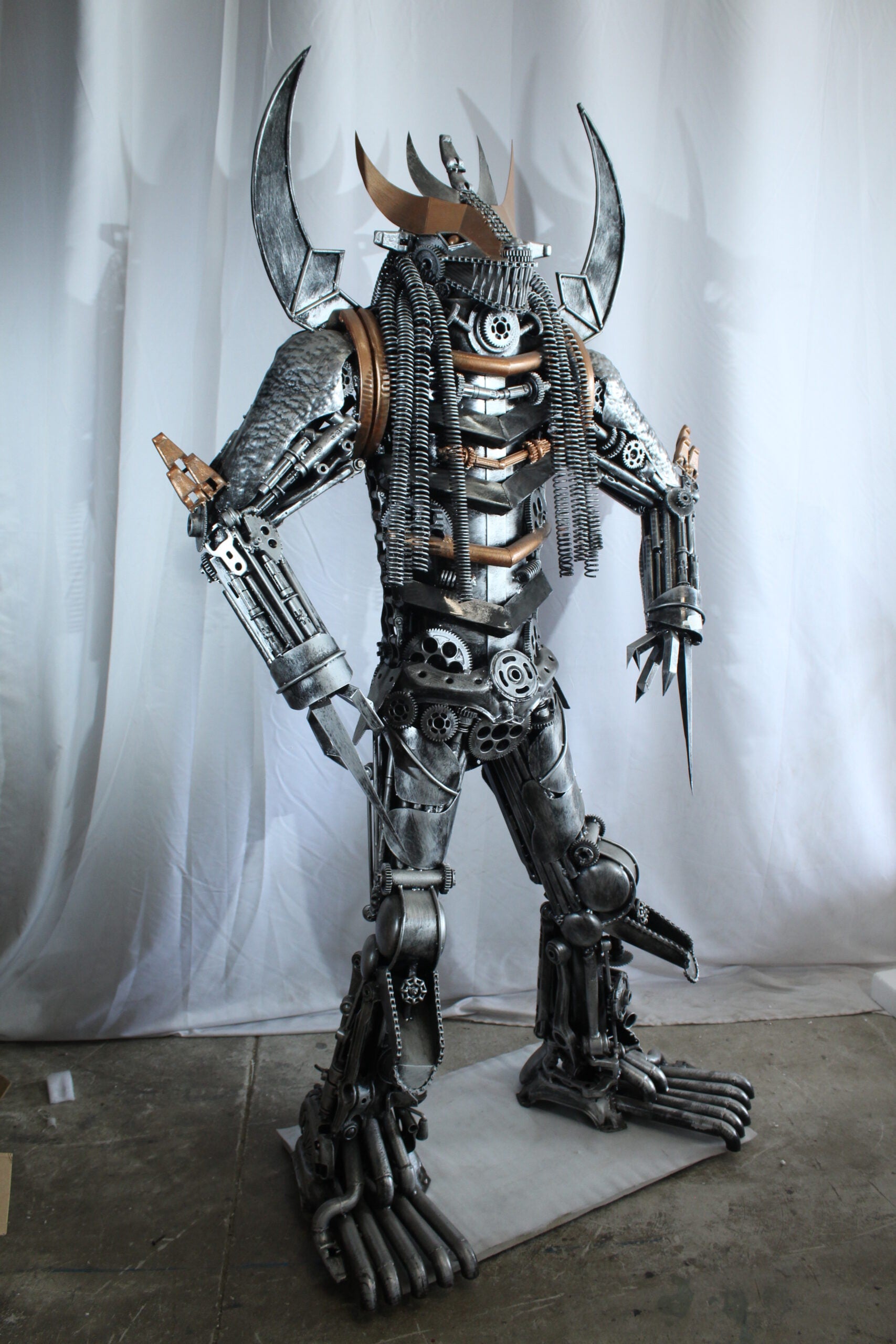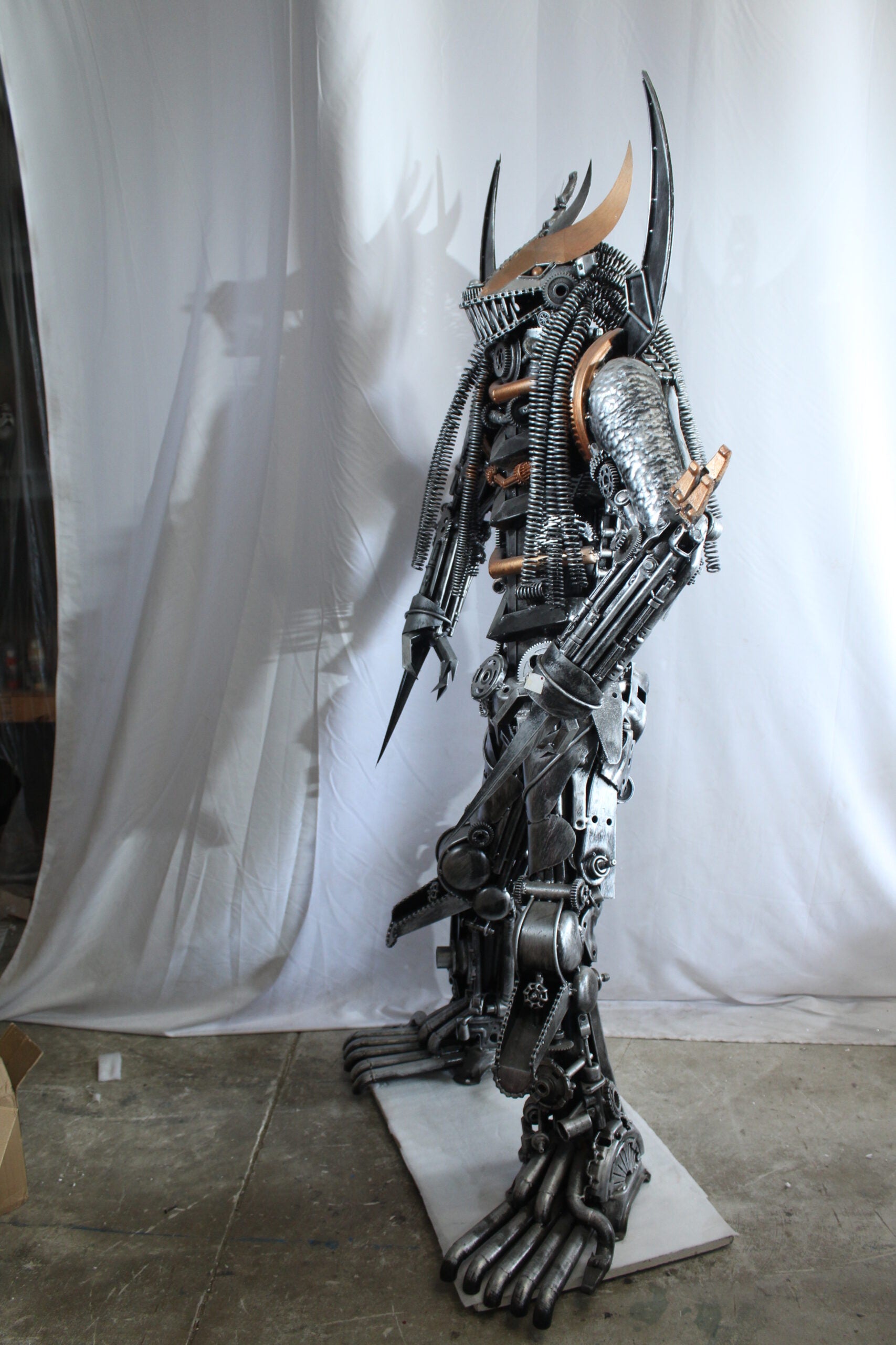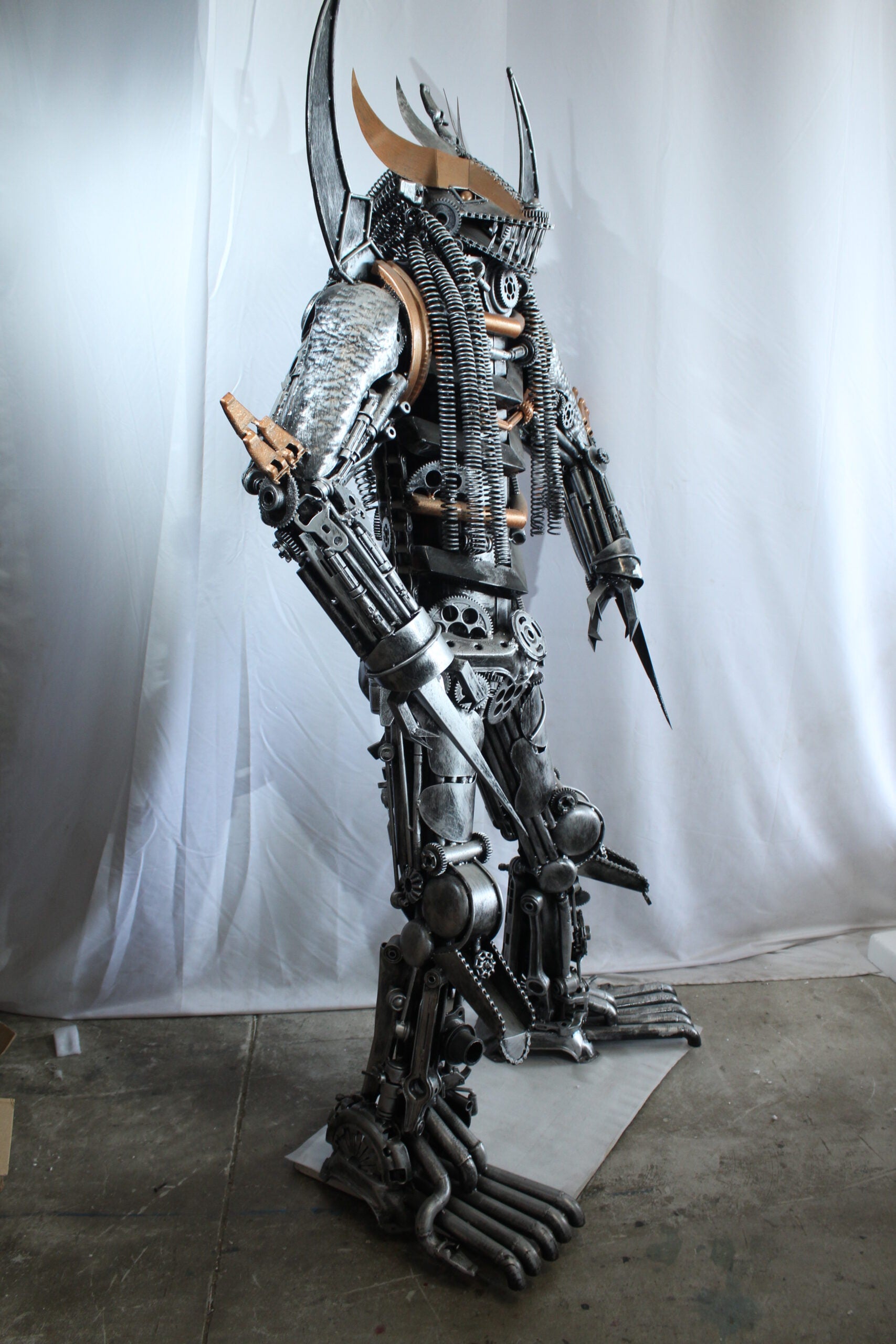 This striking statue is crafted entirely from heavy recycled metal parts, inspired by the legendary Predator character. Designed with intricate detail using gears, springs, and industrial scrap, this piece stands out as a bold fusion of sci-fi art and sustainable craftsmanship. A true collector's item and conversation starter for any movie fan or industrial decor lover. Size: 47"L x 24"W x 81"H. Weight: 250Lb