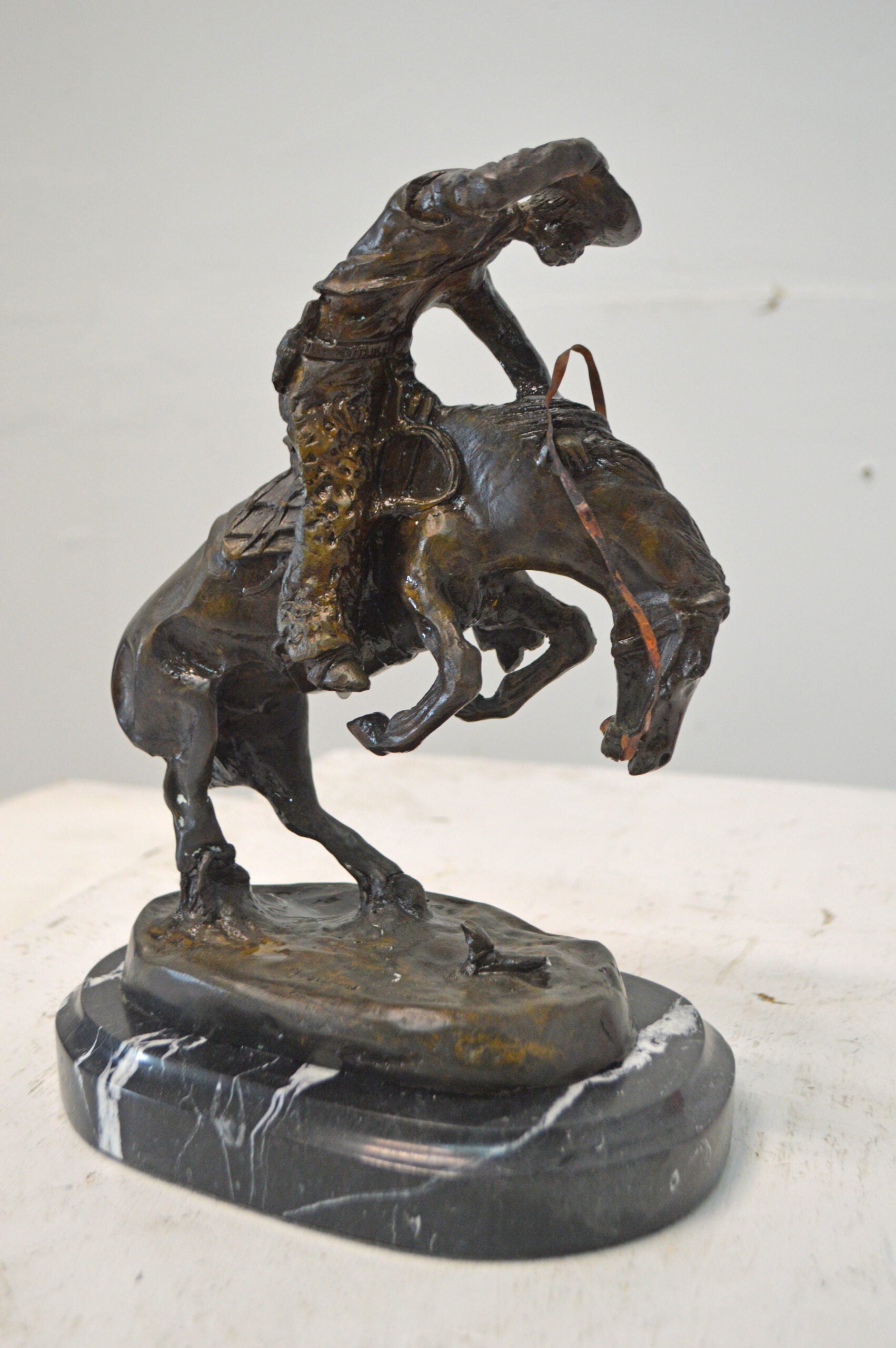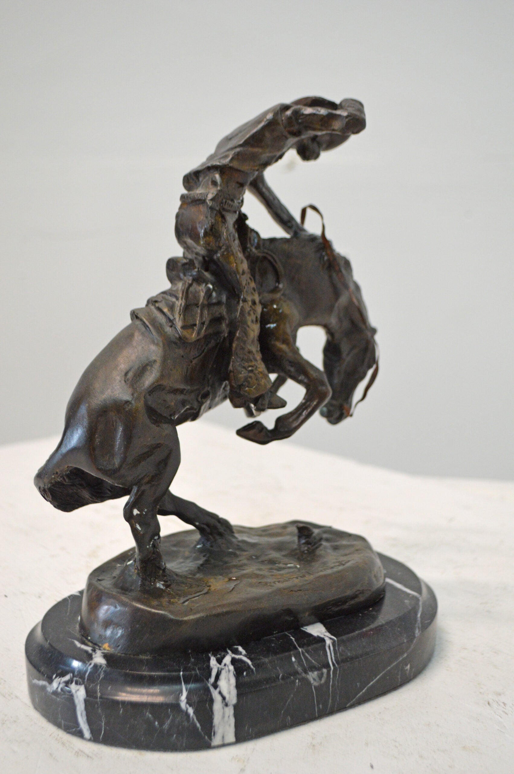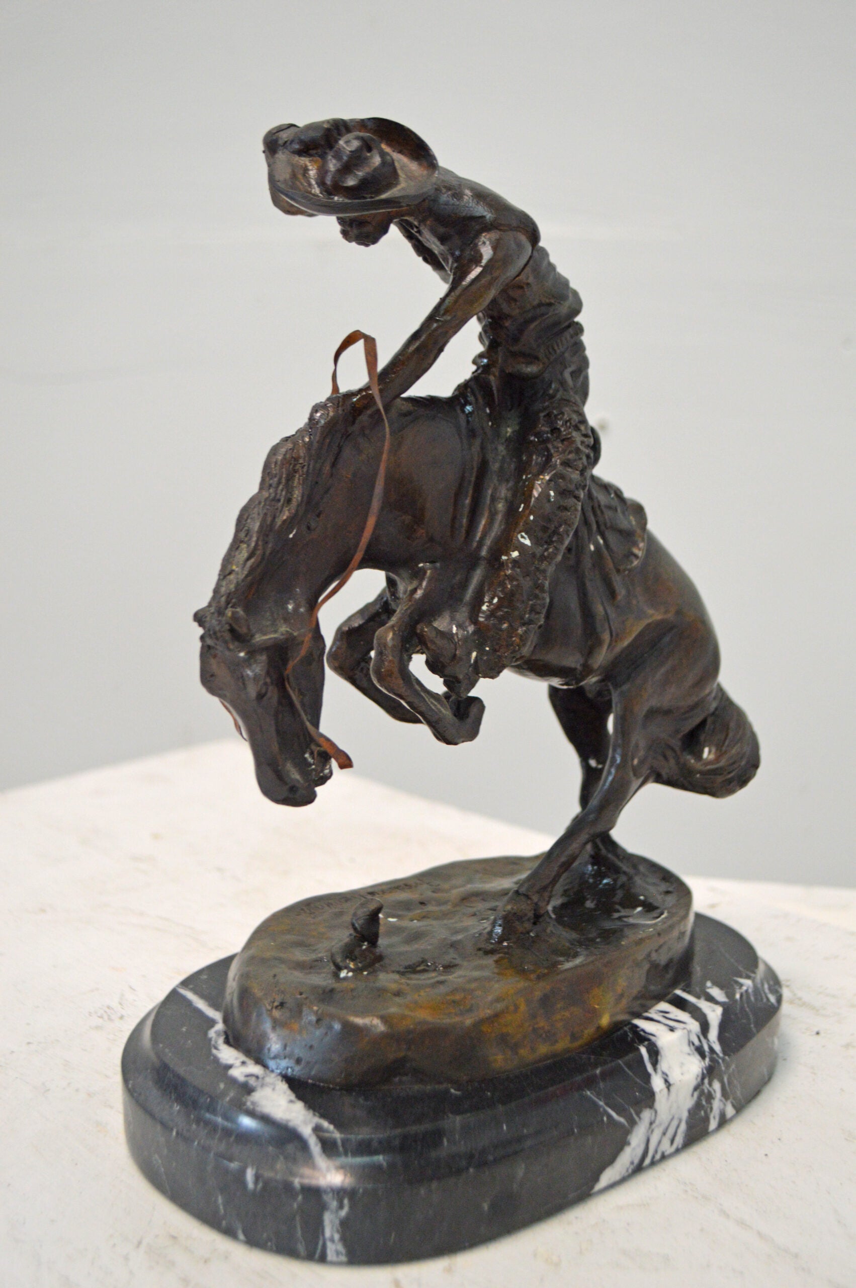 Frederic Remington first sculpted The Rattlesnake in 1904 and it is considered one of his best sculptures, showing the fluid movement of the bucking horse and rider. This model presented a challenge to show the horse up on two legs twisting and recoiling from the dangerous snake at its feet. The cowboy is equally startled and is almost caught off balance, grabbing his hat while trying to stay on his horse. A powerful composition, it focuses all attention and movement to the small but deadly rattlesnake. The Rattlesnake won much praise when it was completed and was called the work of a master's hand. It was Remington 12th sculpture and went on to become one of his most popular works in bronze. It tells a dramatic story of life in the old West. This statue is reproduced in solid bronze and is cast with patina and then hand-rubbed to bring out detail and highlights. The statue is then mounted on a marble base with an etched brass plate. Size: 9"L x 6"W x 12"H. Weight is: 9Lb