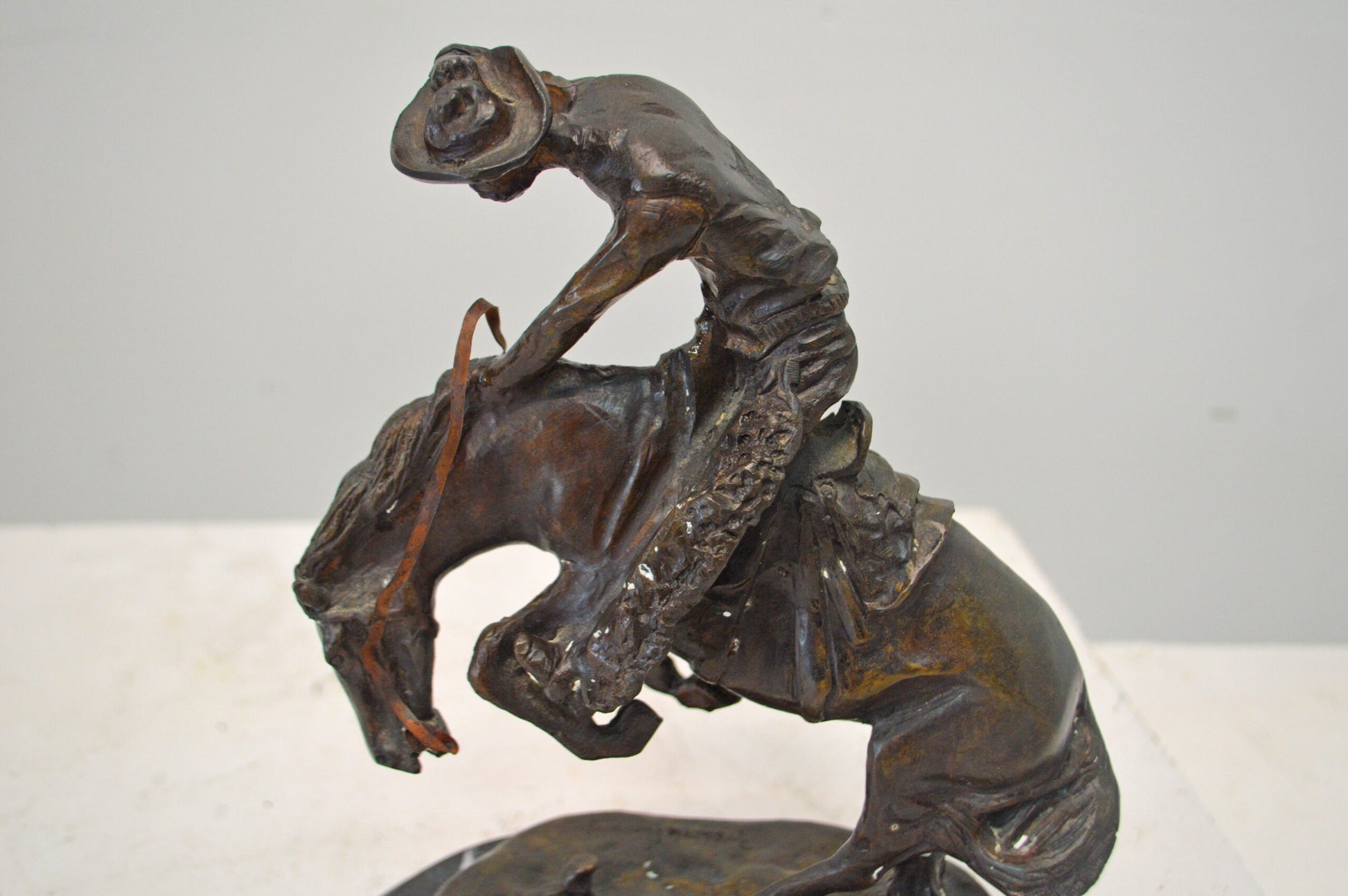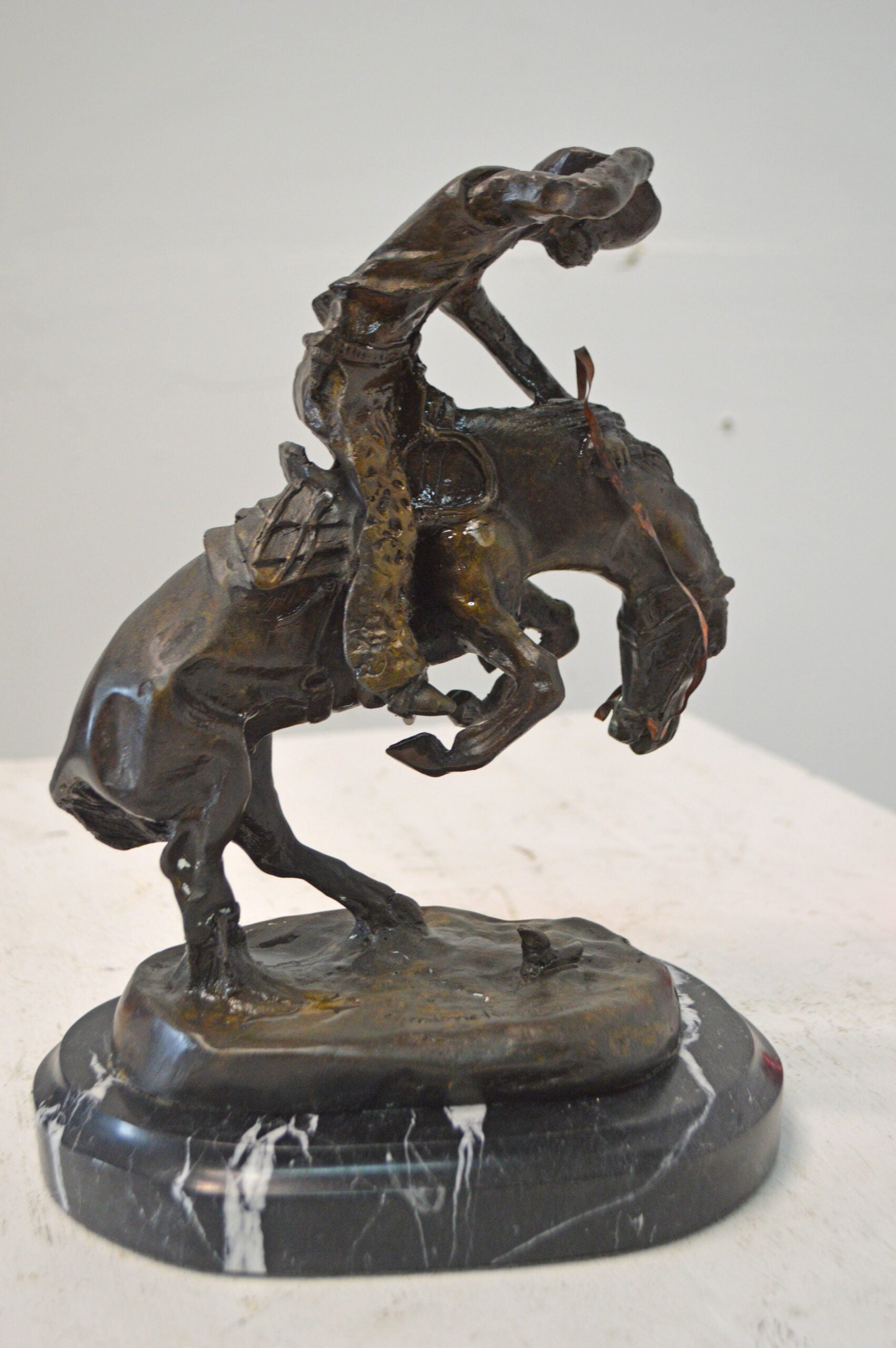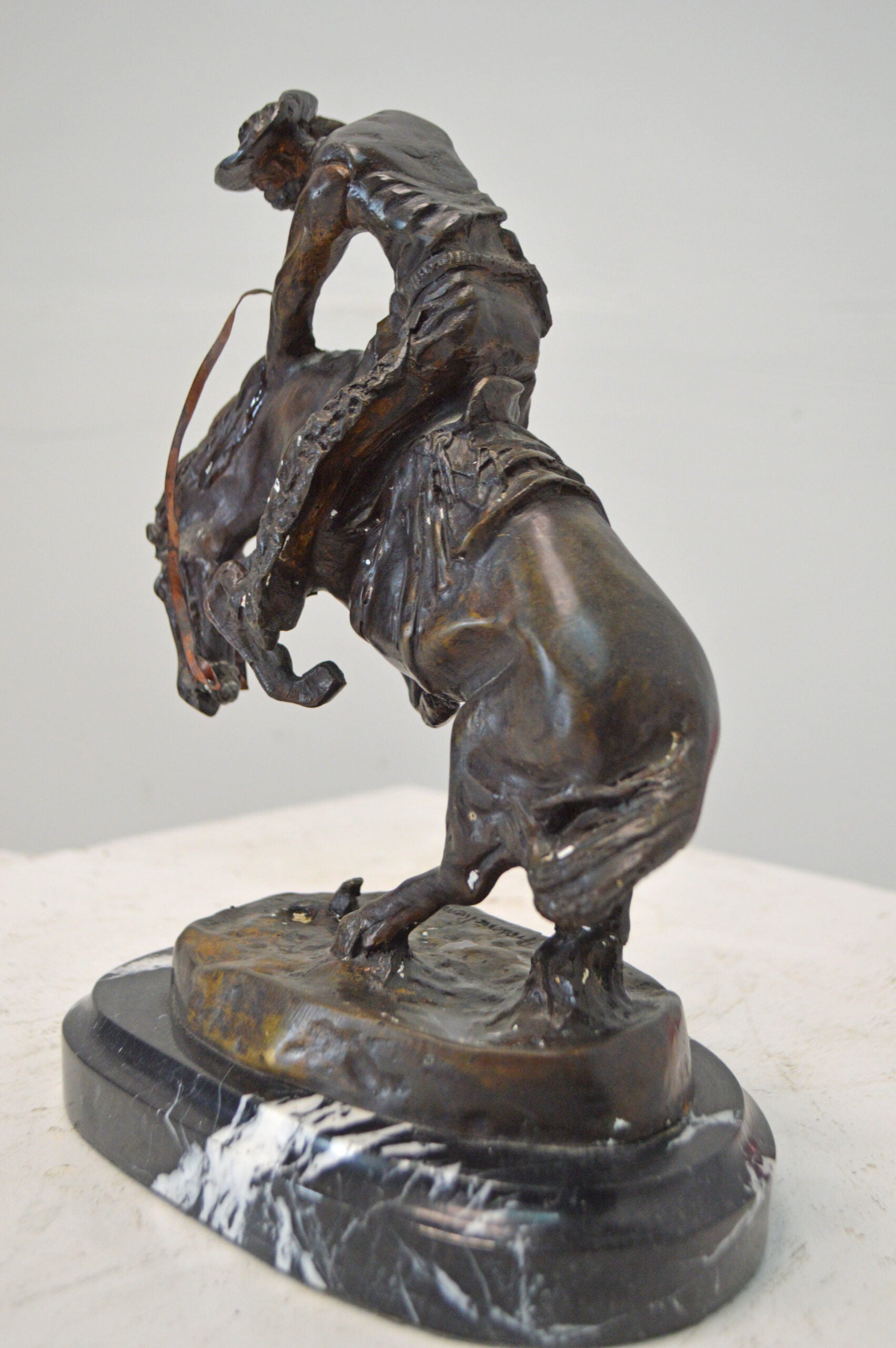 Frederic Remington first sculpted The Rattlesnake in 1904 and it is considered one of his best sculptures, showing the fluid movement of the bucking horse and rider. This model presented a challenge to show the horse up on two legs twisting and recoiling from the dangerous snake at its feet. The cowboy is equally startled and is almost caught off balance, grabbing his hat while trying to stay on his horse. A powerful composition, it focuses all attention and movement to the small but deadly rattlesnake. The Rattlesnake won much praise when it was completed and was called the work of a master's hand. It was Remington 12th sculpture and went on to become one of his most popular works in bronze. It tells a dramatic story of life in the old West. This statue is reproduced in solid bronze and is cast with patina and then hand-rubbed to bring out detail and highlights. The statue is then mounted on a marble base with an etched brass plate. Size: 9"L x 6"W x 12"H. Weight is: 9Lb