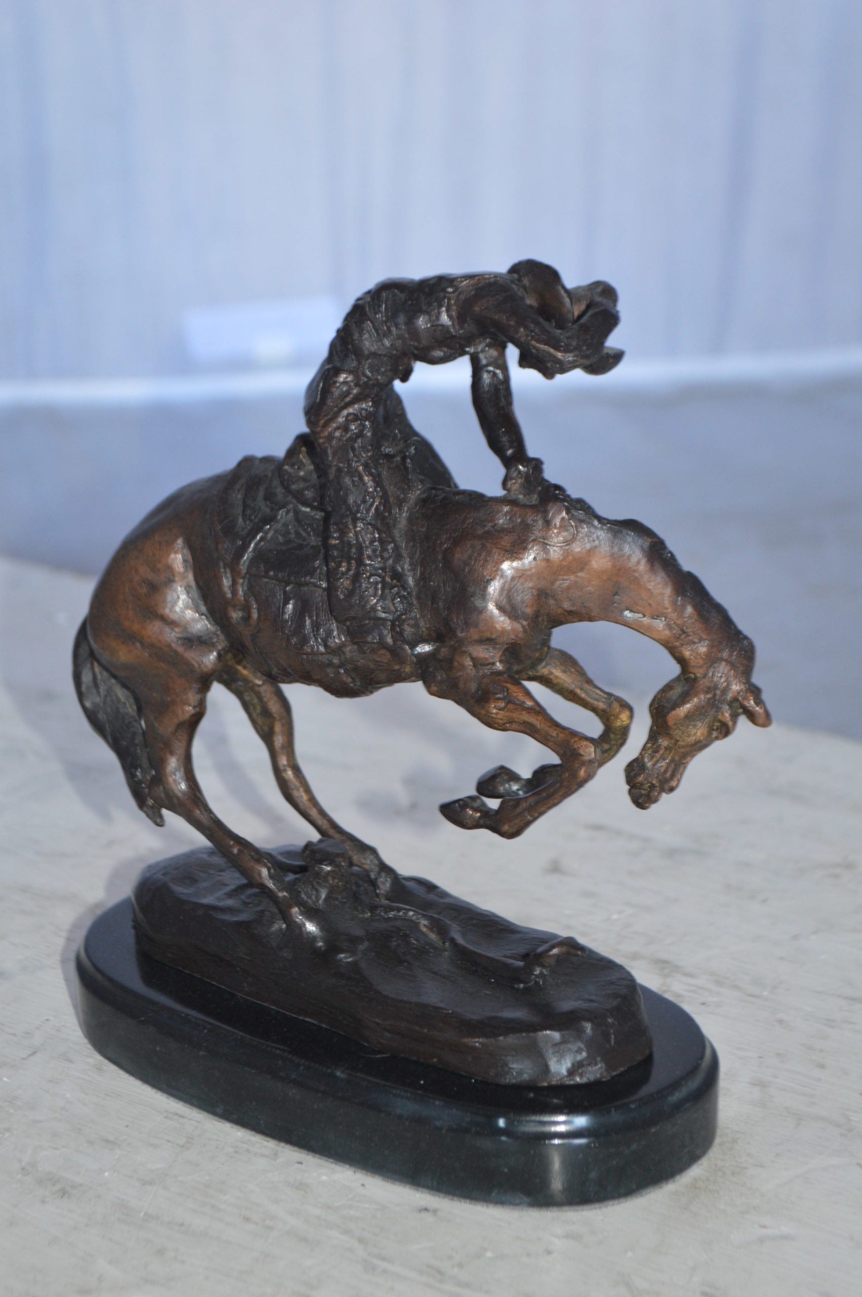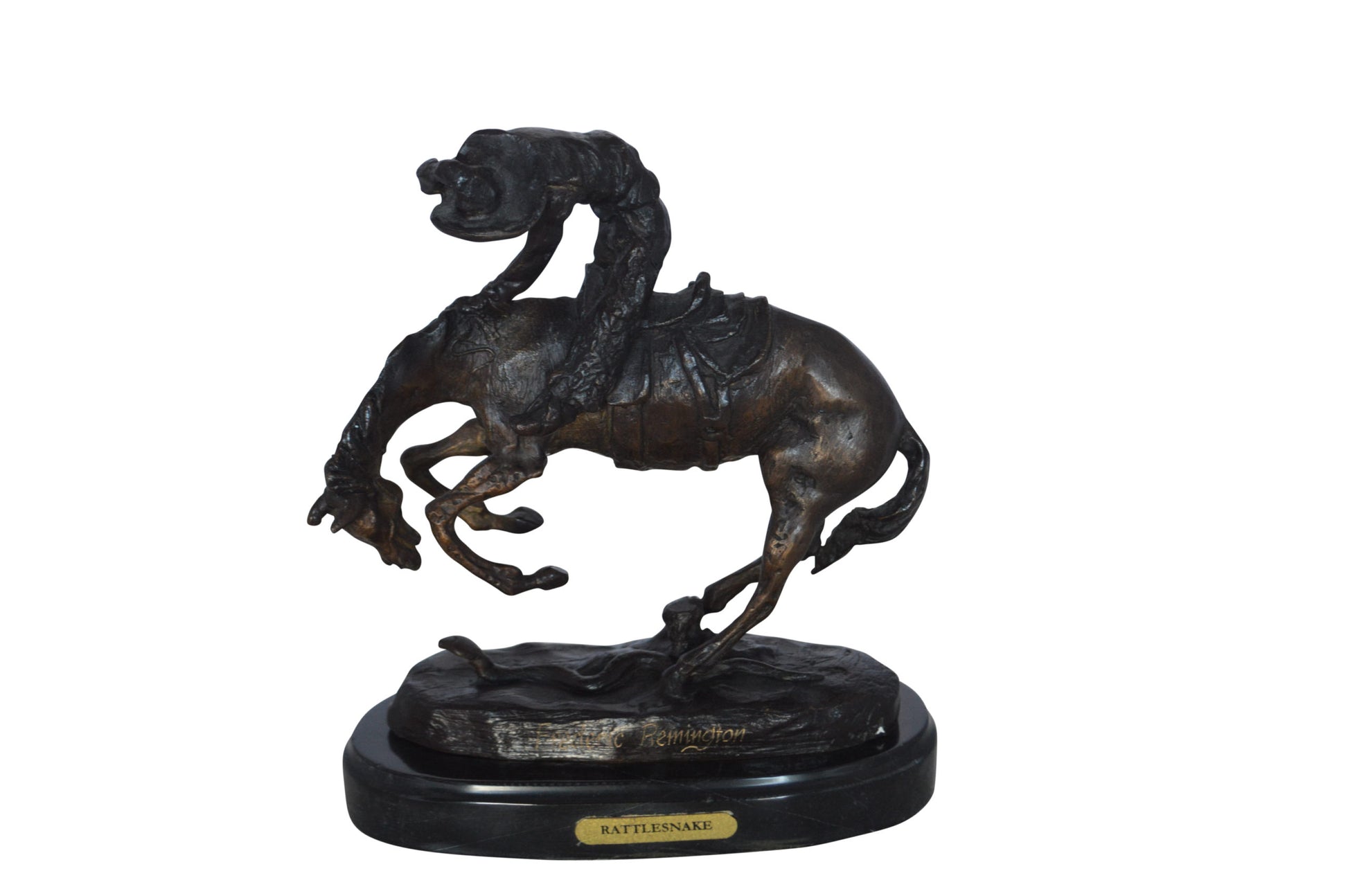 Frederic Remington first sculpted The Rattlesnake in 1904 and it is considered one of his best sculptures, showing the fluid movement of the bucking horse and rider. This model presented a challenge to show the horse up on two legs twisting and recoiling from the dangerous snake at its feet. The cowboy is equally startled and is almost caught off balance, grabbing his hat while trying to stay on his horse. A powerful composition, it focuses all attention and movement to the small but deadly rattlesnake. The Rattlesnake won much praise when it was completed and was called the work of a master's hand. It was Remington 12th sculpture and went on to become one of his most popular works in bronze. It tells a dramatic story of life in the old West. This statue is reproduced in solid bronze and is cast with patina and then hand-rubbed to bring out detail and highlights. The statue is then mounted on a marble base with an etched brass plate. Size: 7"L x 3"W x 10"H. Weight is: 5Lb