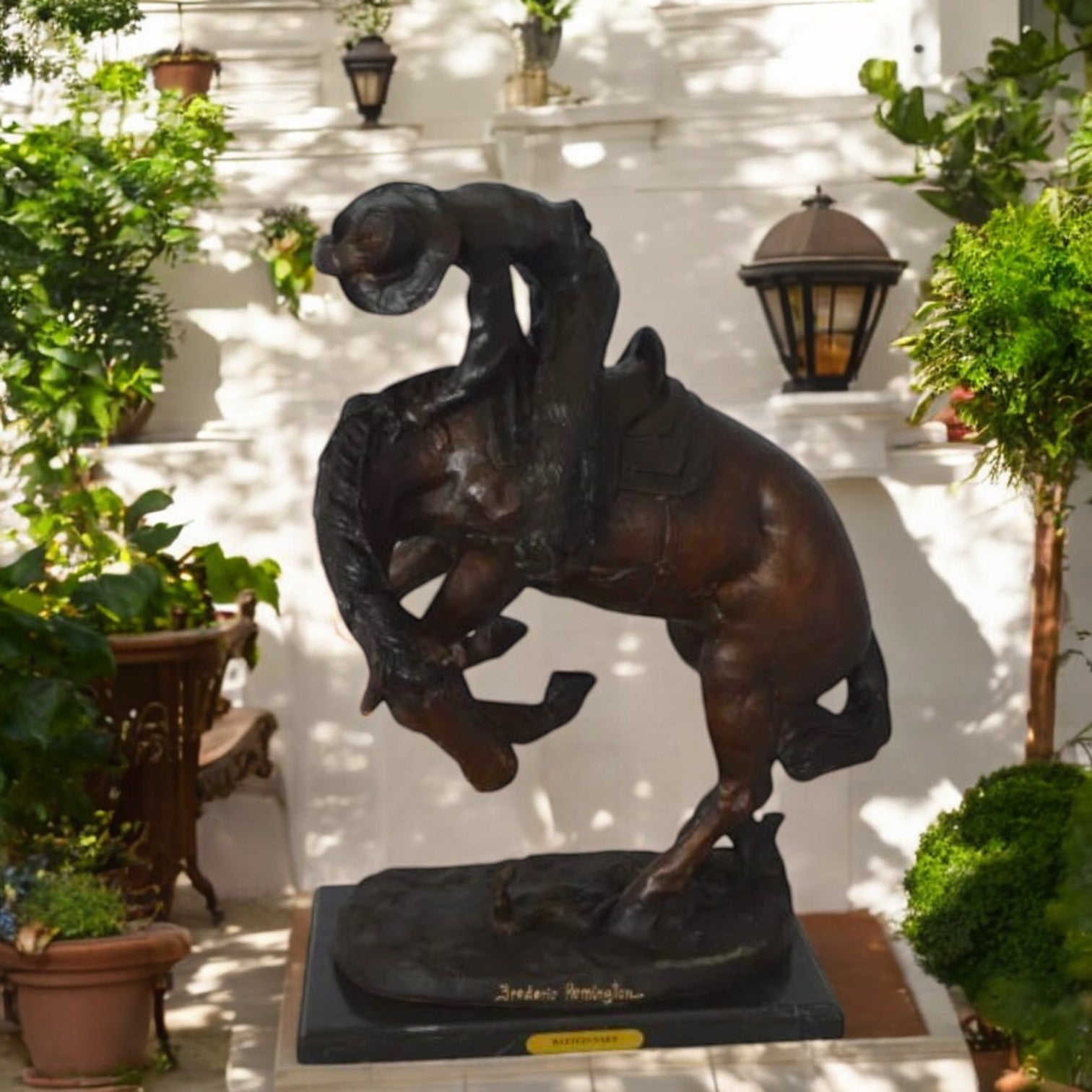 The Remington - inspired Bronze Rattlesnake sculpture / statue is a daring composition that consists of a carefully balanced horse and rider; the horse, frightened by a diminutive rattlesnake on the ground below him, rears up on his back legs, while the cowboy, in a counter movement, leans forward, struggling to hold on and to keep his hat on his head. The rider’s left arm and leg form strong diagonals that parallel the position of the horse’s leg, and the curve of the cowboy’s back is continued down through the animal’s haunches. The texture of statue mirrors the rough surface of the ground below. The horse’s expression is one of utter fear and the swoop of his tail moves the viewer’s eye back to his head. The high sheen of the surface and its greenish-brown patina serve to unify the sculpture. This 100% Bronze and Fully Handmade, Carefully Detailed sculpture was Cast Using the "Lost Wax Method" And Mounted on a Marble Base. Size: 16"L x 13"W x 22"H. Weight is: 30Lb