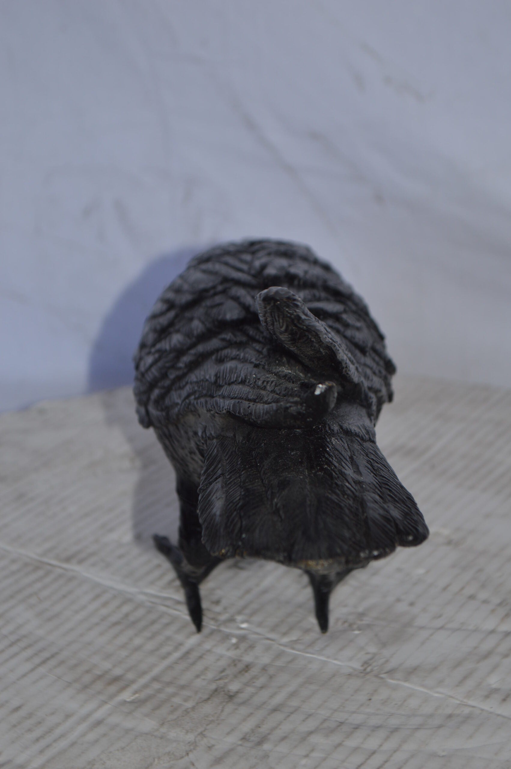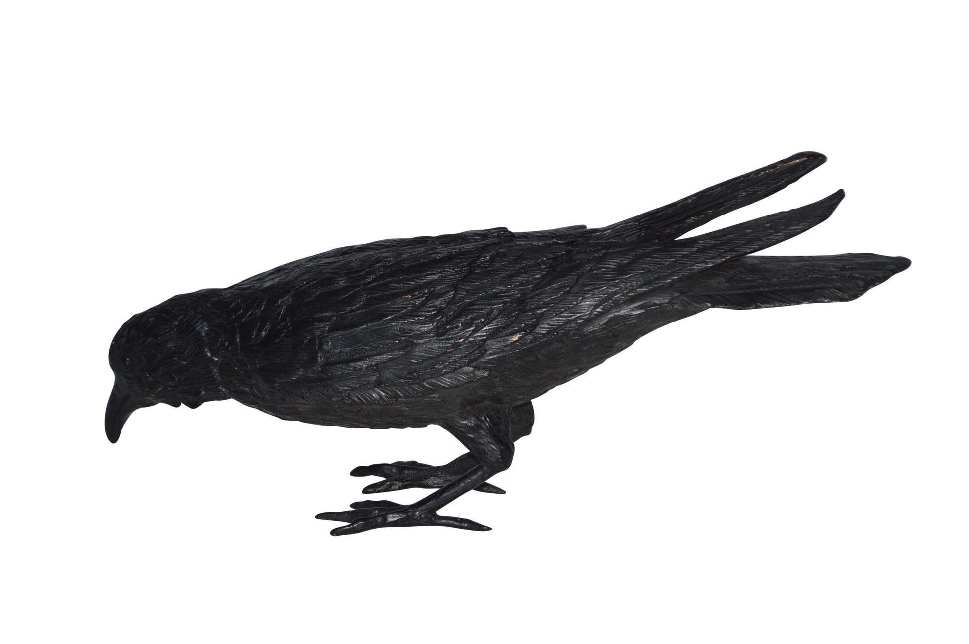 A Lifesize raven bird with his head down, looking for food, bronze statue. Also known as the western raven found across the Northern Hemisphere, it is the most widely distributed of all corvids and is possibly the heaviest passerine bird. Please pay close attention to the details of this statue. This bronze statue is cast in the traditional lost-wax method, which highlights the exceptionally fine detail and guarantees lasting heirloom beauty. This bronze statue would look adorable in any space of the home of any bird lover. Size: 22"L x 6"W x 11"H. Weight is: 9Lb