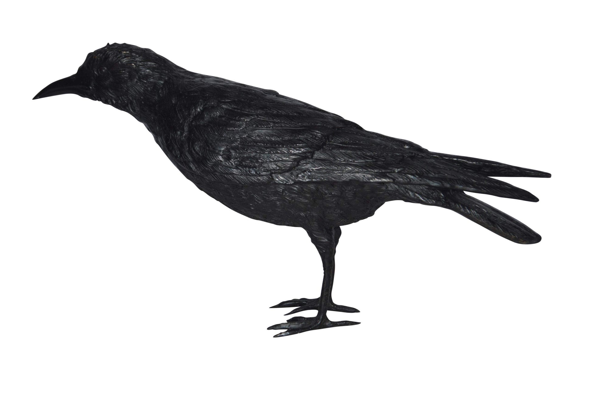A Lifesize raven bird with his head up, looking at the view, bronze statue. Also known as the western raven found across the Northern Hemisphere, it is the most widely distributed of all corvids and is possibly the heaviest passerine bird. Please pay close attention to the details of this statue. This bronze statue is cast in the traditional lost-wax method, which highlights the exceptionally fine detail and guarantees lasting heirloom beauty. This bronze statue would look adorable in any space of the home of any bird lover. Size: 23"L x 6"W x 13"H. Weight is: 9Lb